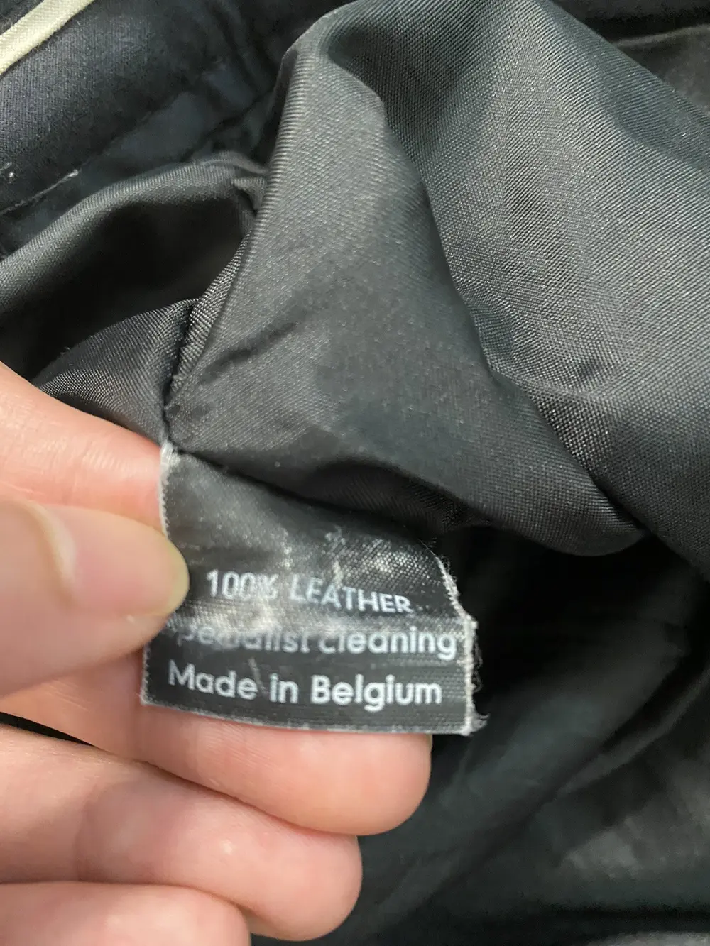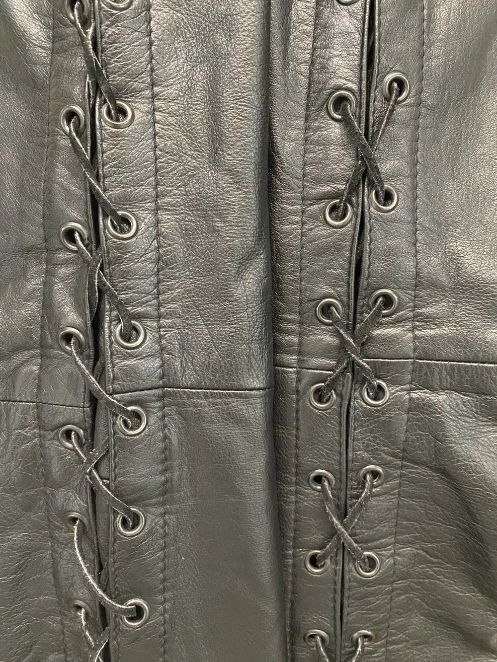 These full leather pants are nearly over 25 years old and feature a lace-up system down the out-seam of the pant and can be loosened for a more straight-relaxed fit or tightened for a slim-tailored fit. The leather itself is in great condition with no outstanding flaws. Classic 5-pocket design with a snap-button and zip-fly closure. Insanely rare collector’s item and also very wearable.