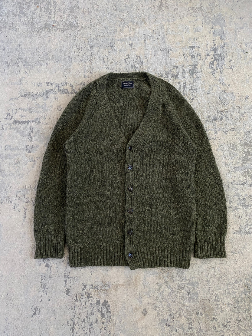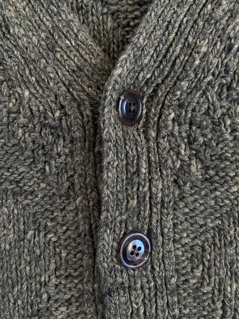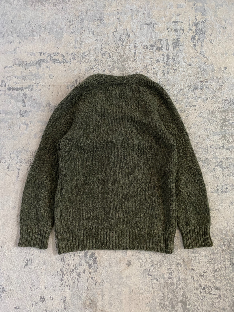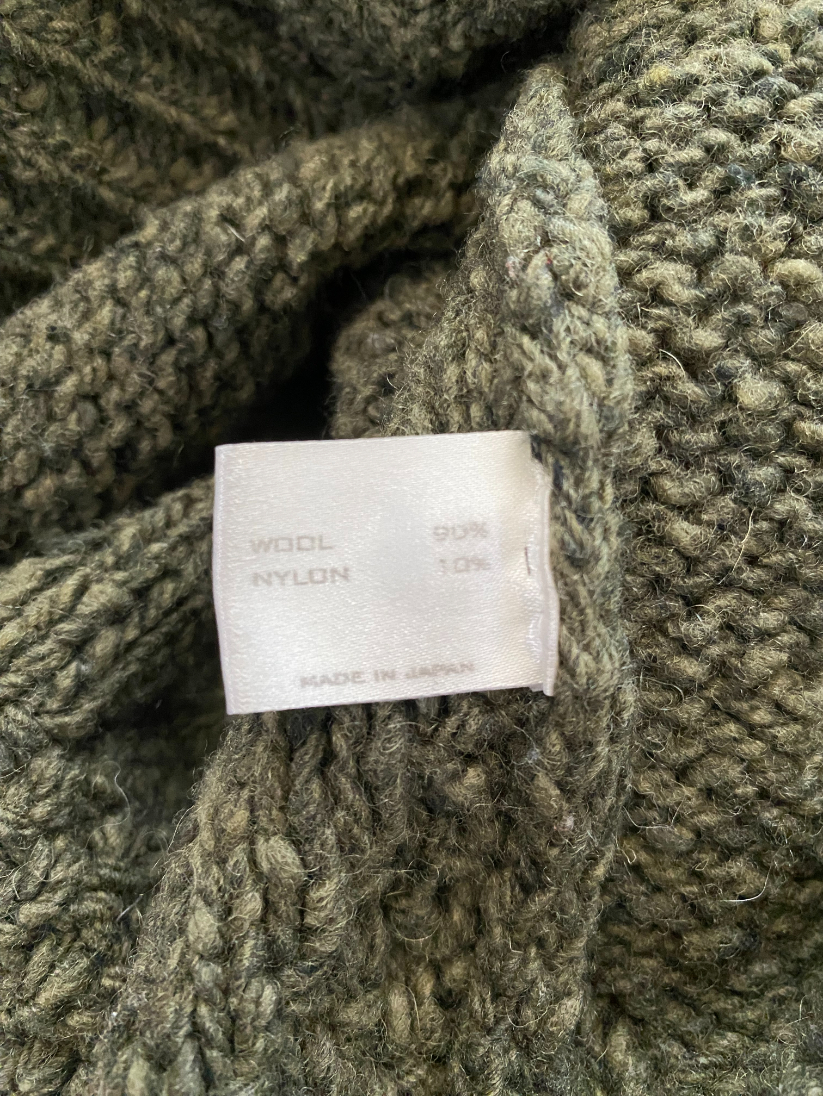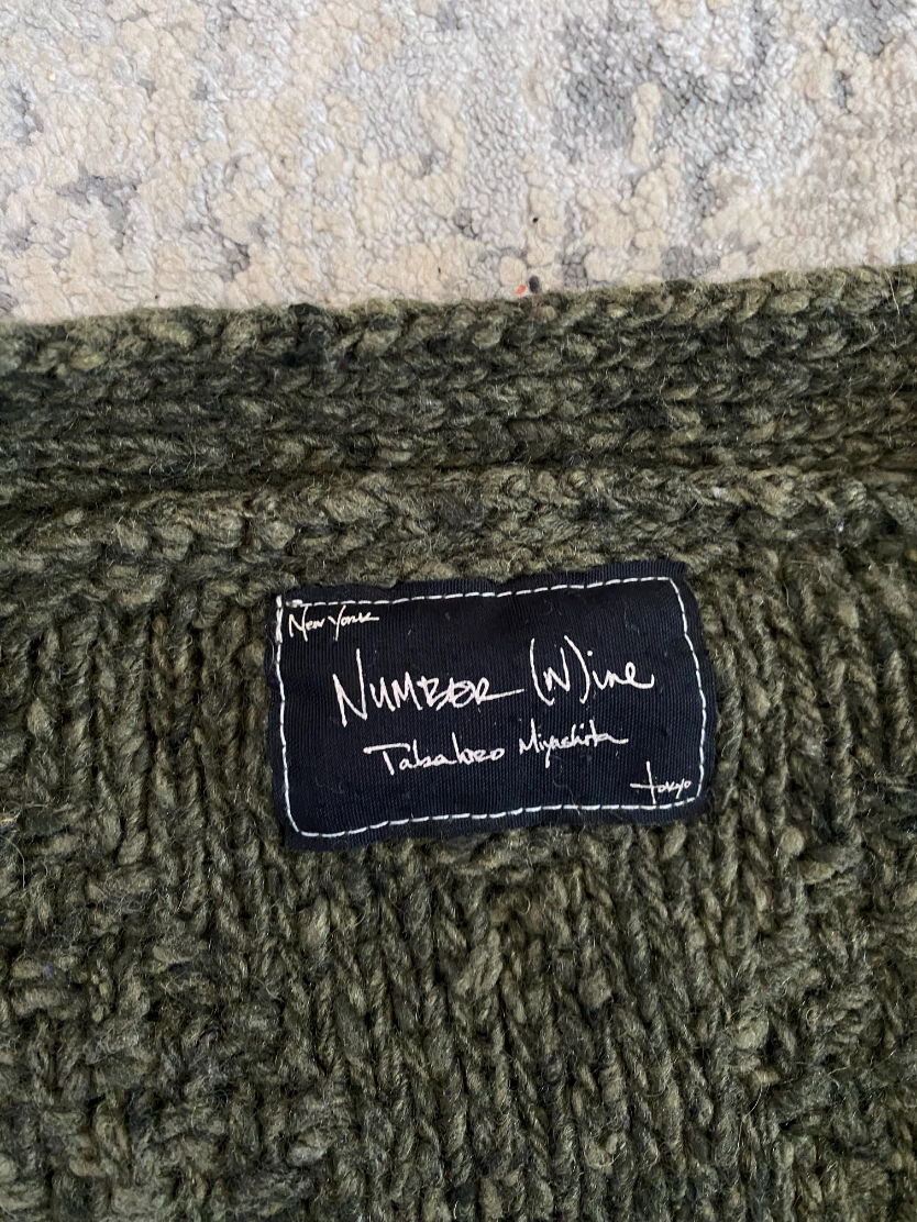 Number (N)ine Spring/Summer 2008 “Birds” knit cardigan in earthy green wool, featuring a low-key argyle pattern that can be seen subtly, visible in photo 3. Crafted from mid-weight wool perfect for winter layering. The condition remains great for a nearly 20 year old garment.