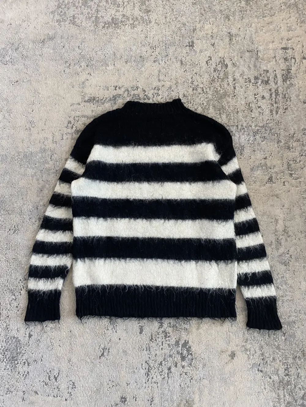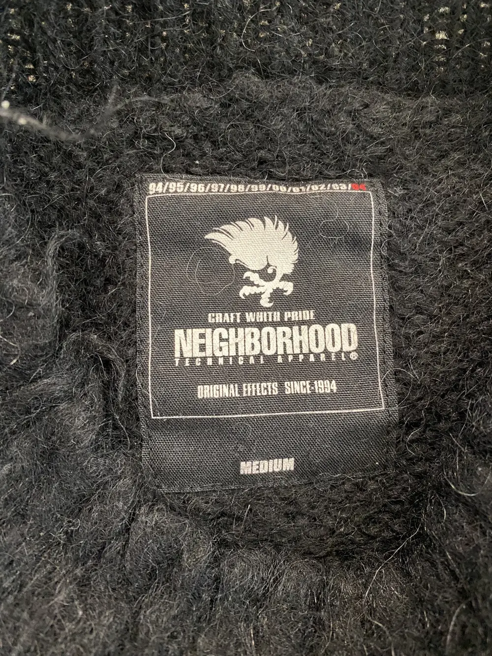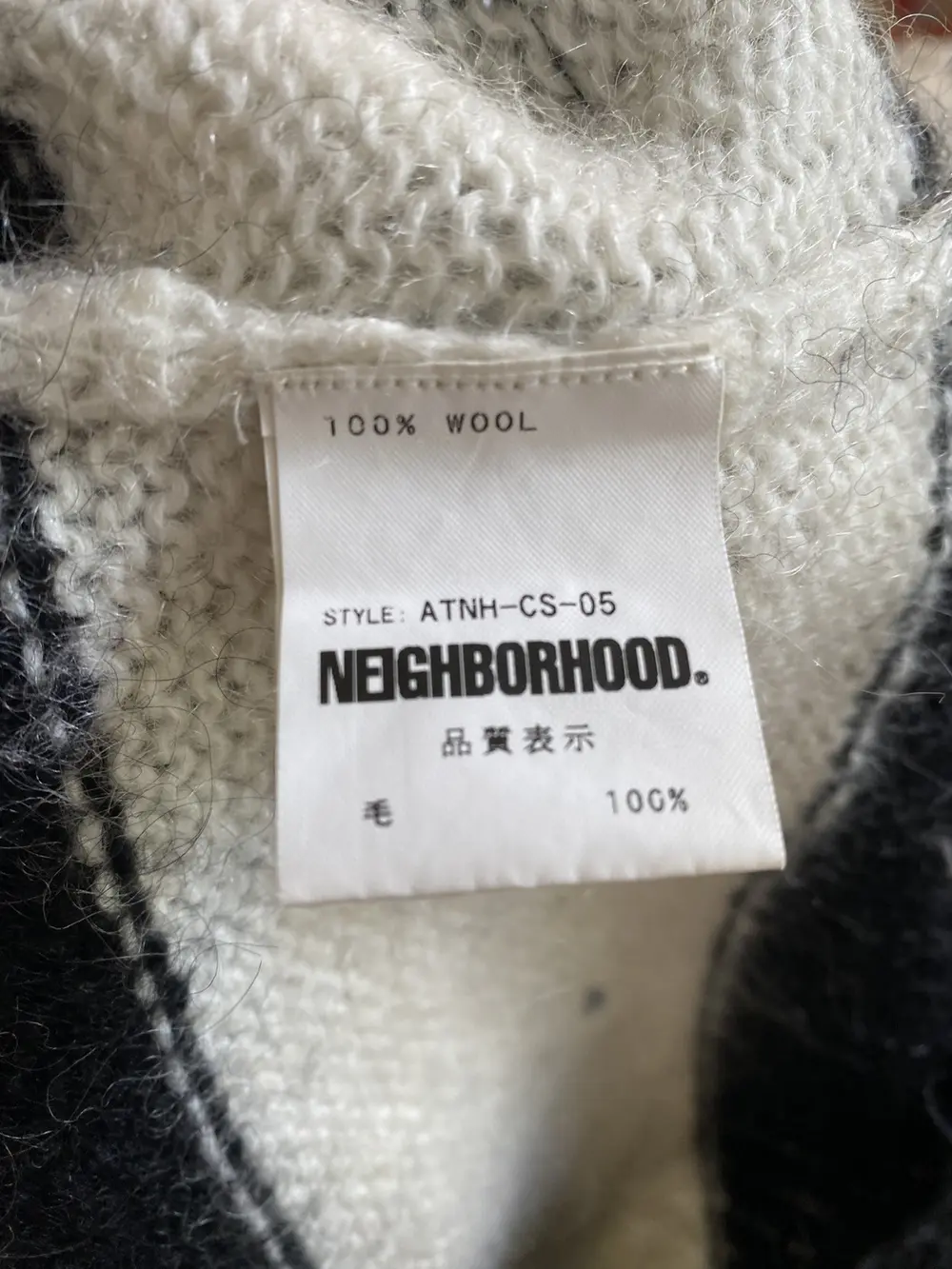 Striped wool knit sweatshirt from Neighborhood features a bold black-and-white horizontal pattern woven into a dense, insulating fabric. The thick ribbed neckline offers a structured silhouette, while the ribbed cuffs and hem provide a snug, tailored finish that enhances warmth and durability. A subtle Neighborhood patch near the hem adds a touch of brand identity without overpowering the minimalist design.
