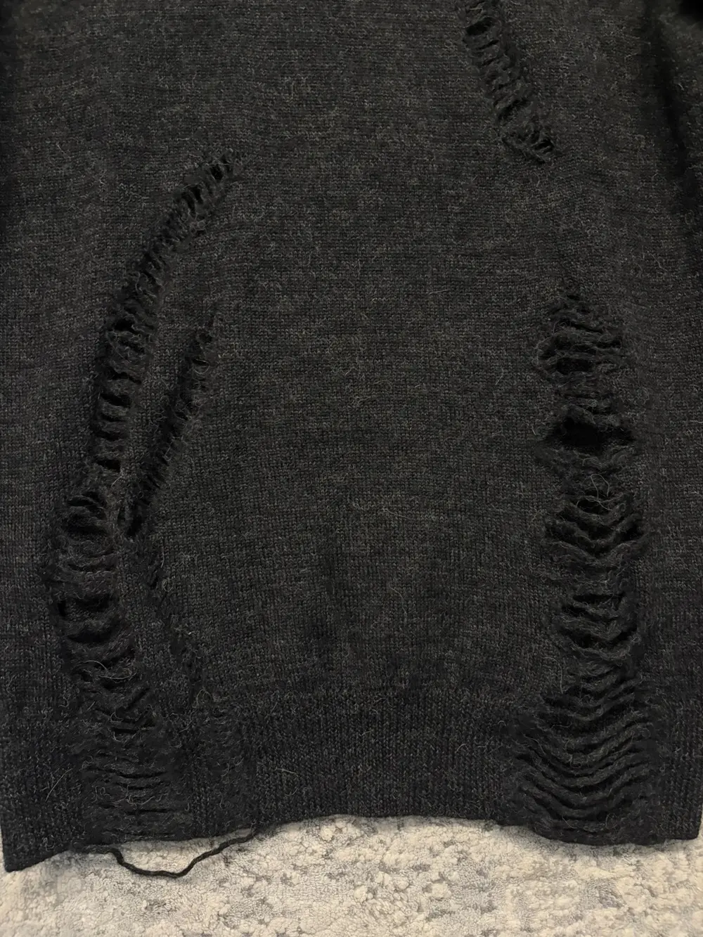 5351 Pour Les Hommes knit sweater in an all‑black stretchy wool‑blend with intentional distressing placed throughout the body and sleeves. Built with a straightforward crewneck construction and a slim, close‑to‑body feel