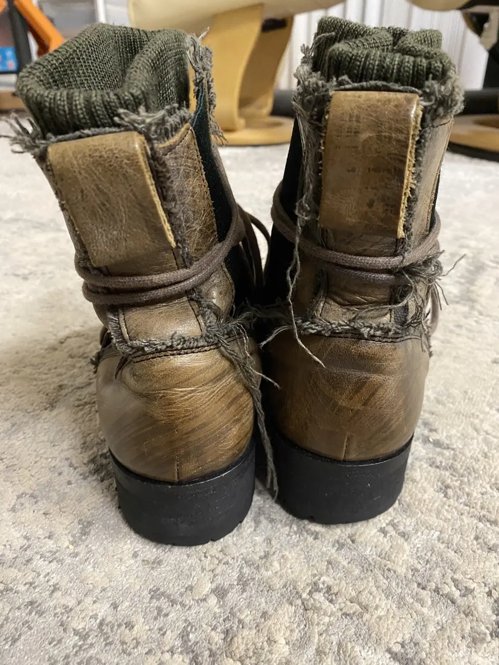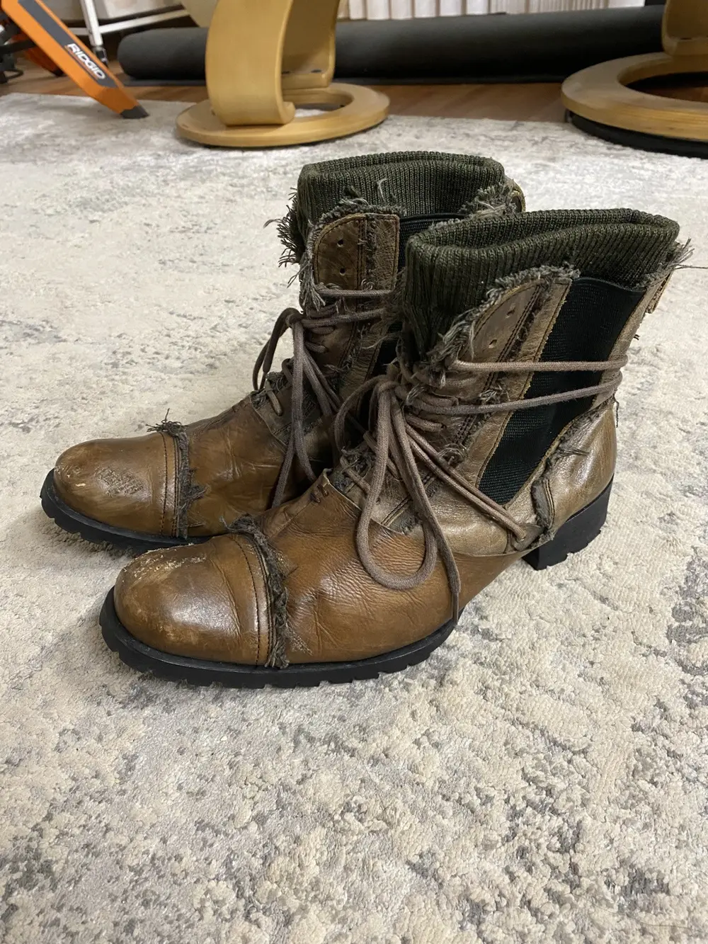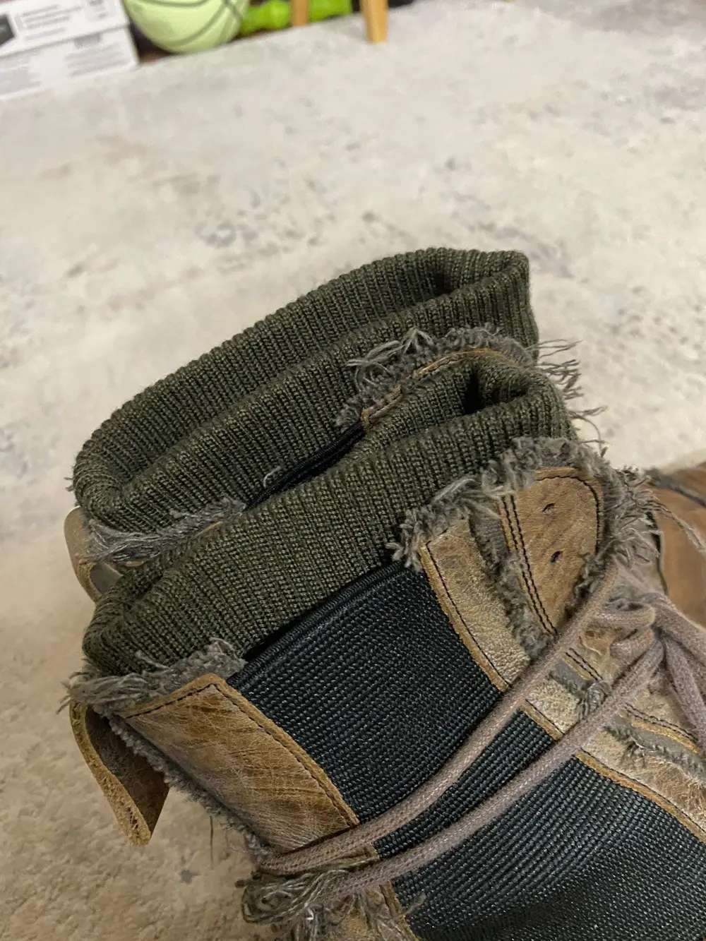 Rare, innovative silhouette from Alfredo Bannister—known for architectural footwear design. These boots feature a dual-layer construction with a foldable inner sock lining and classic Chelsea-style outer shaft with elastic sides. Rich brown leather is supple and tactile, offering comfort and style in equal measure