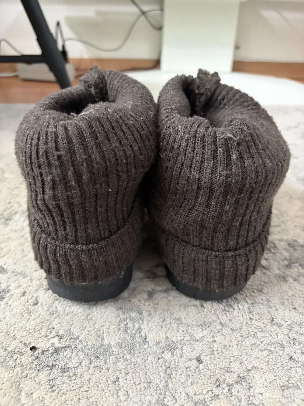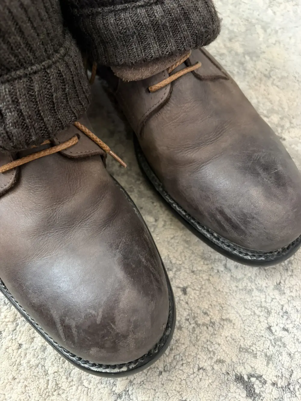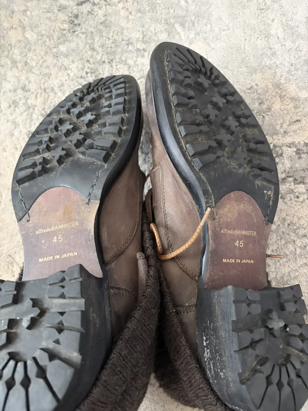 Japanese brand Alfredo Bannister known for their unique boots that come in many different shapes, heights and materials. These boots feature 2 different layers including an inner sock lining that can be folded down and be worn as pictured, as well as a fleece layer equipped with a wooden latch fastening. The upper is comprised of a smooth leather and comes in a very dark brown colorway. Good condition throughout.