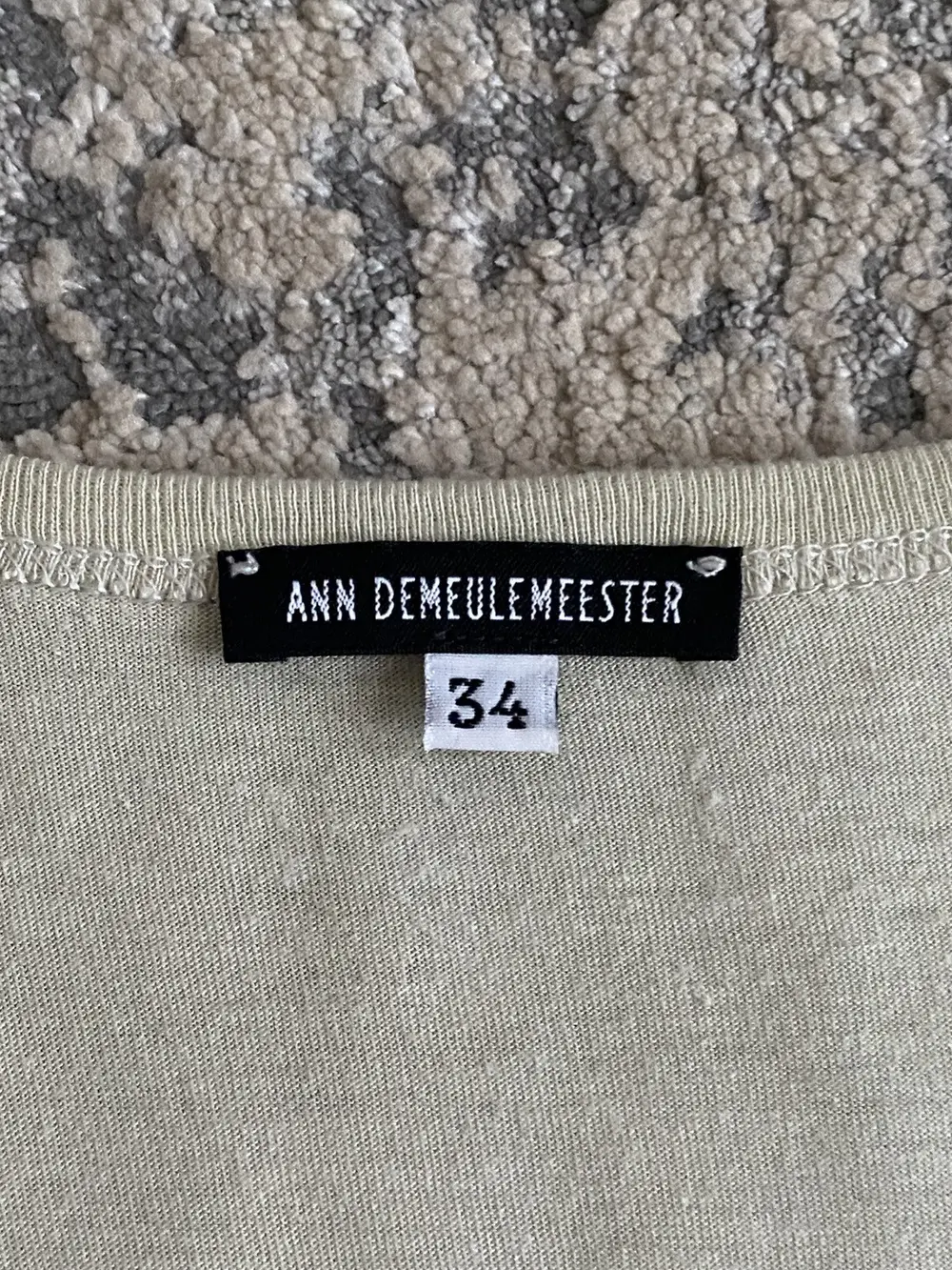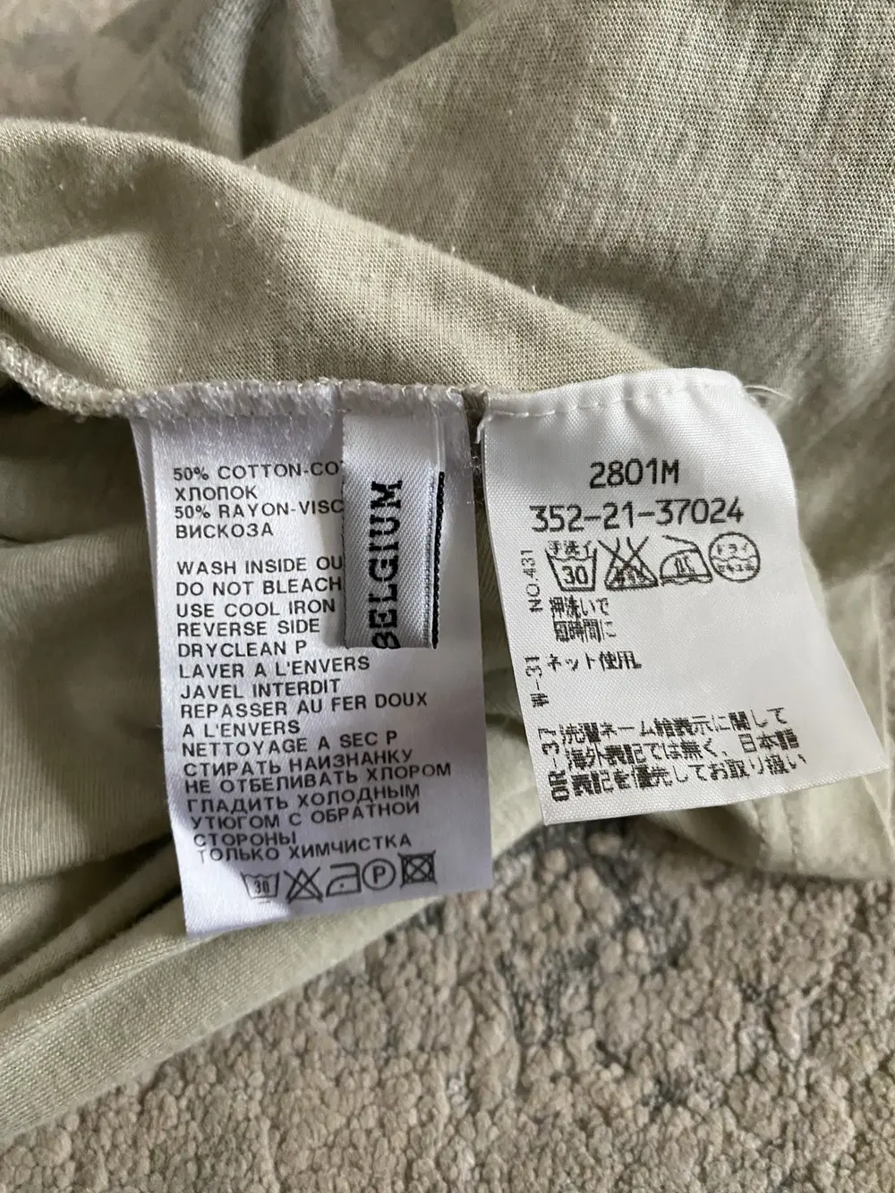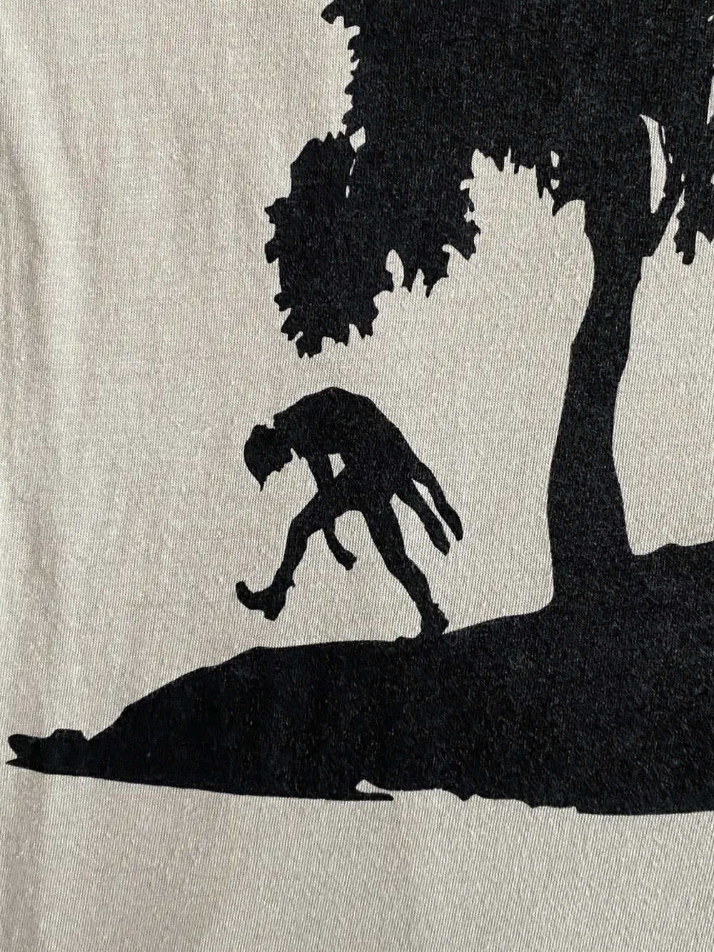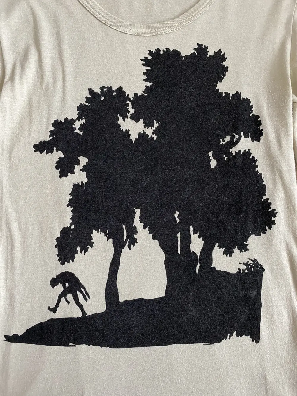 Rare piece from Ann Demeulemeester’s Fall 2007 collection, featuring a striking oversized tree graphic with layered silhouettes. One figure depicts a British colonist walking away in defeat, while another rests beneath the tree, creating a powerful narrative of reflection and loss. Rendered in Ann’s signature monochrome palette, the print balances stark imagery with poetic subtlety.