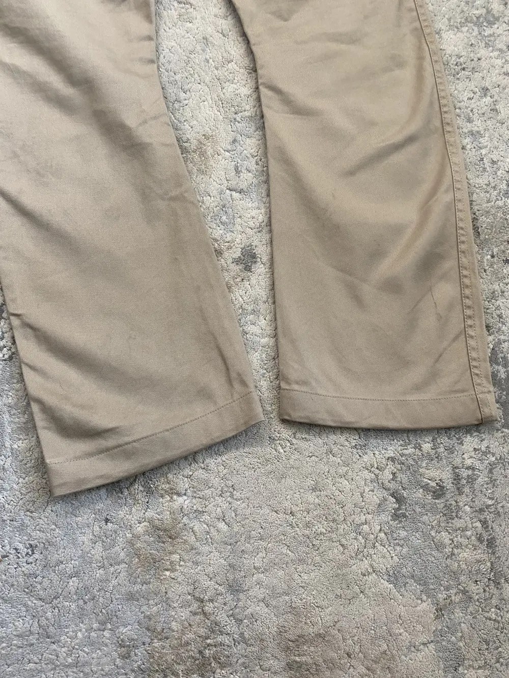 these pants feature a distinctive J-cut leg that curves inward to create a natural stacking effect from ankle to thigh. Vertical side pockets and buttoned rear pockets complete the standard five-pocket layout. In good condition