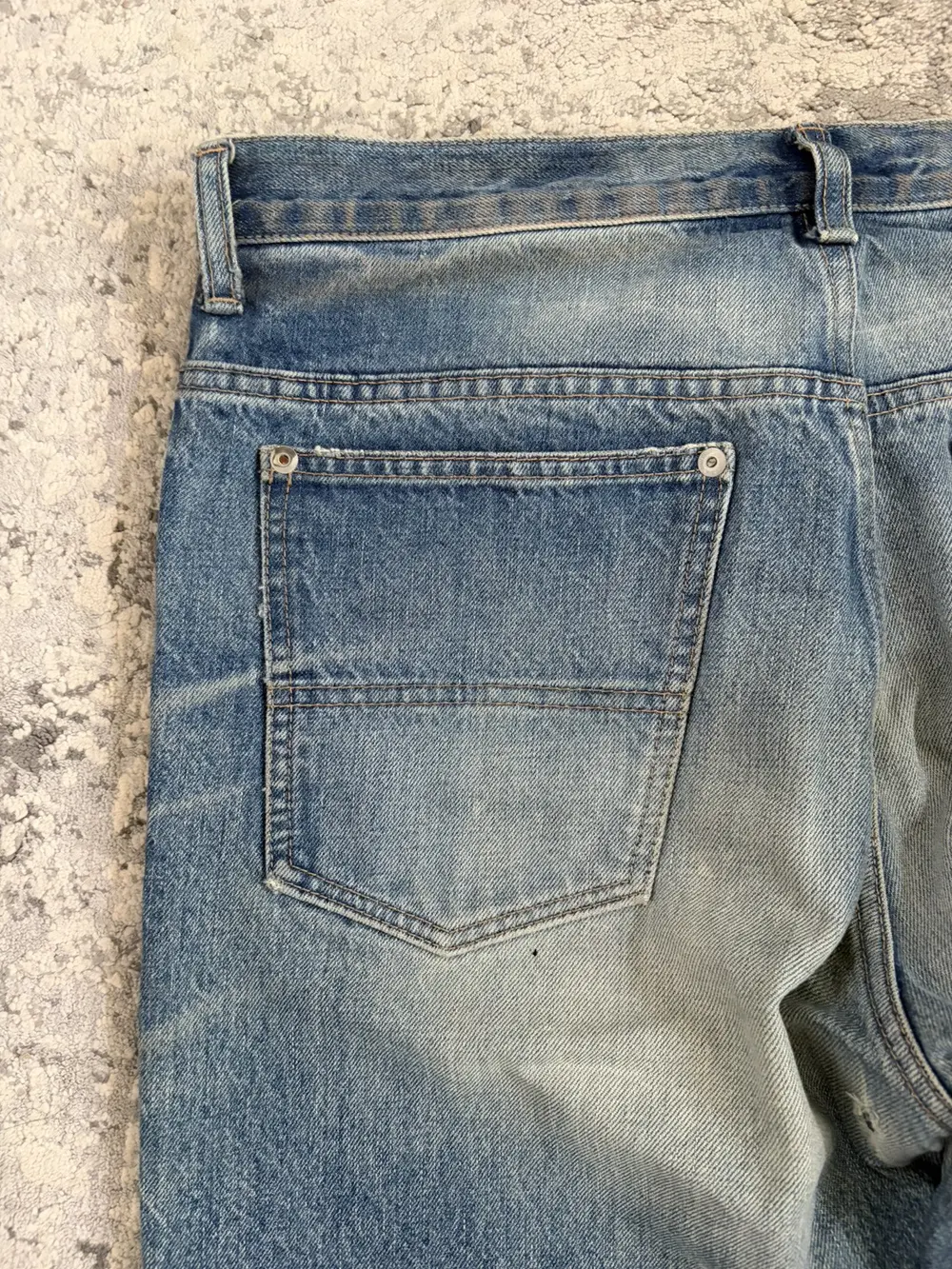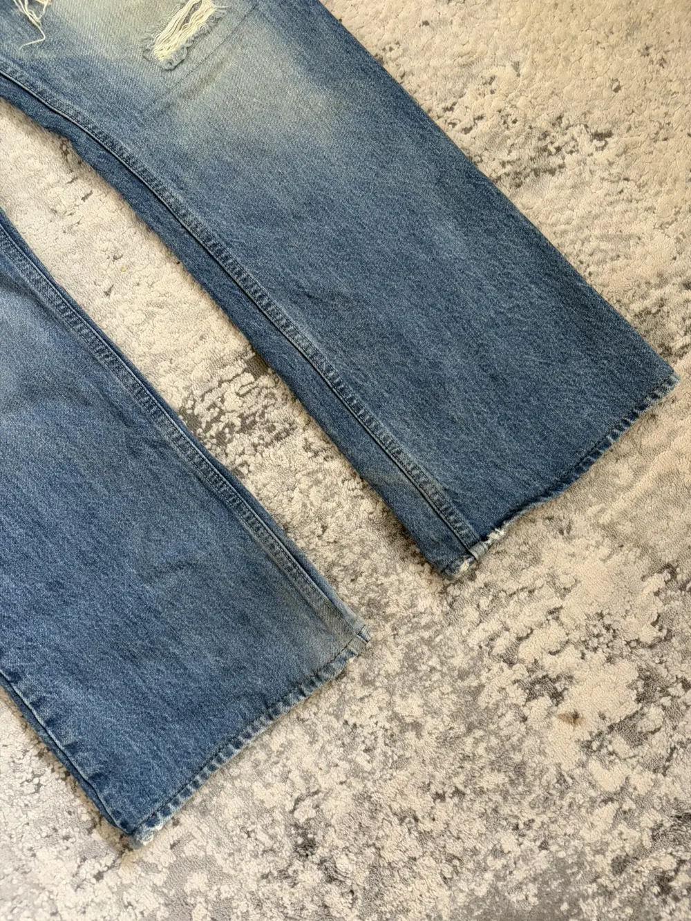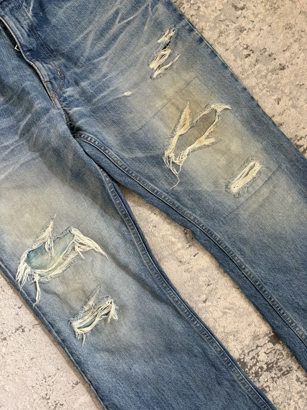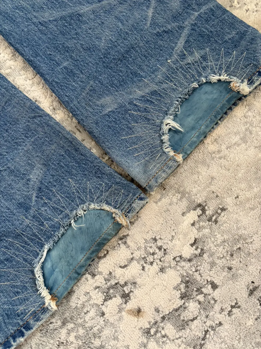 This jean features a beautiful blue wash with distressing at the thighs and hems repaired with blue cowhide leather repairs. The denim is 100% cotton with a substantial weight, yet broken in and soft to the touch.
