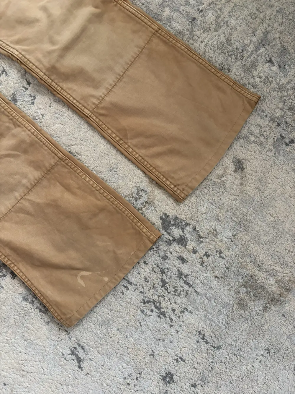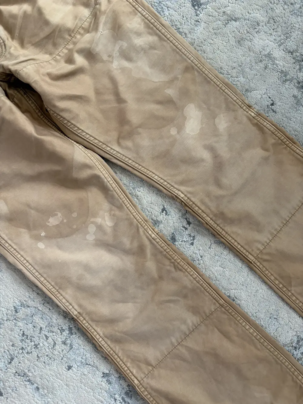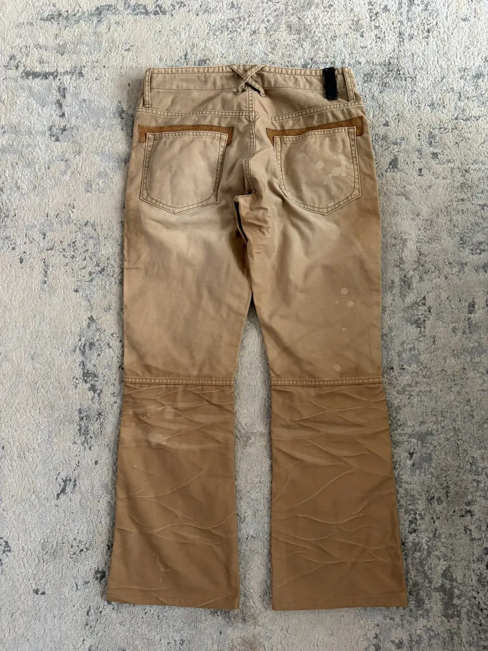 Backlash bootcut pants in beige, cut with a clean bootcut silhouette and finished with intentional paint and oil stains throughout for a worn‑in, workshop‑inspired look. Suede panels reinforce both the front and back pockets, adding texture and contrast to the otherwise rugged cotton body.