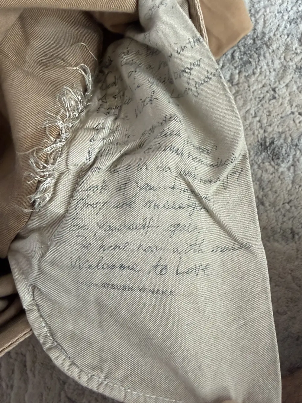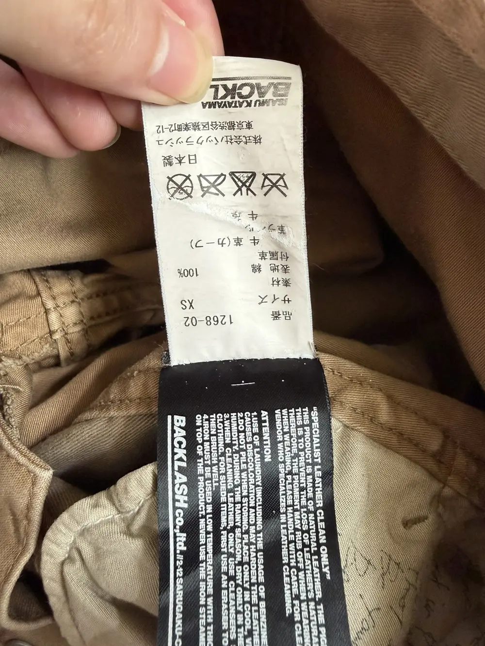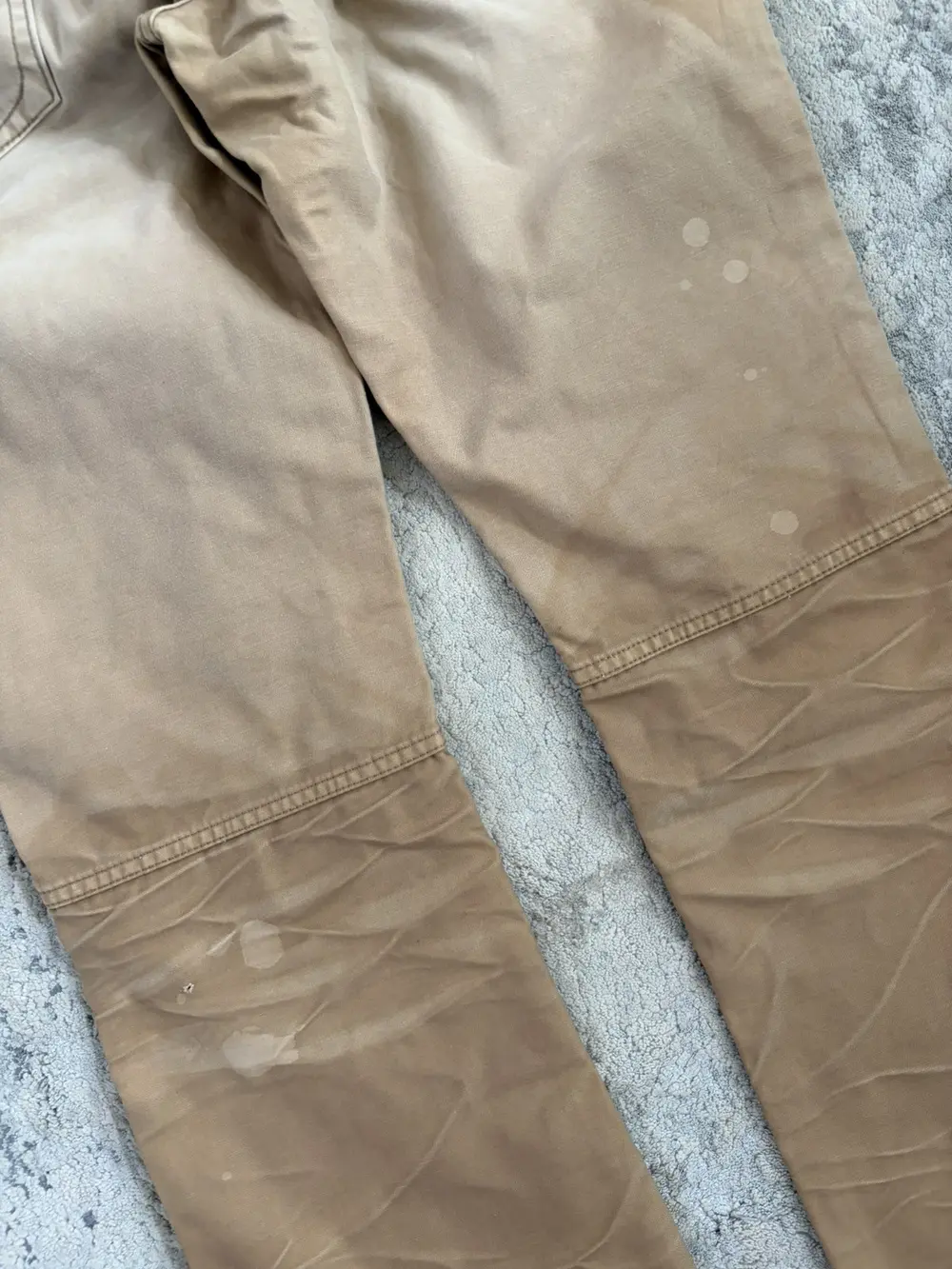 Backlash bootcut pants in beige, cut with a clean bootcut silhouette and finished with intentional paint and oil stains throughout for a worn‑in, workshop‑inspired look. Suede panels reinforce both the front and back pockets, adding texture and contrast to the otherwise rugged cotton body.