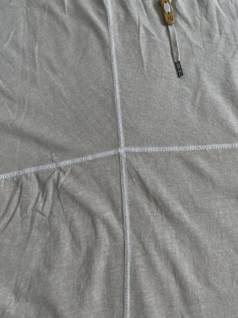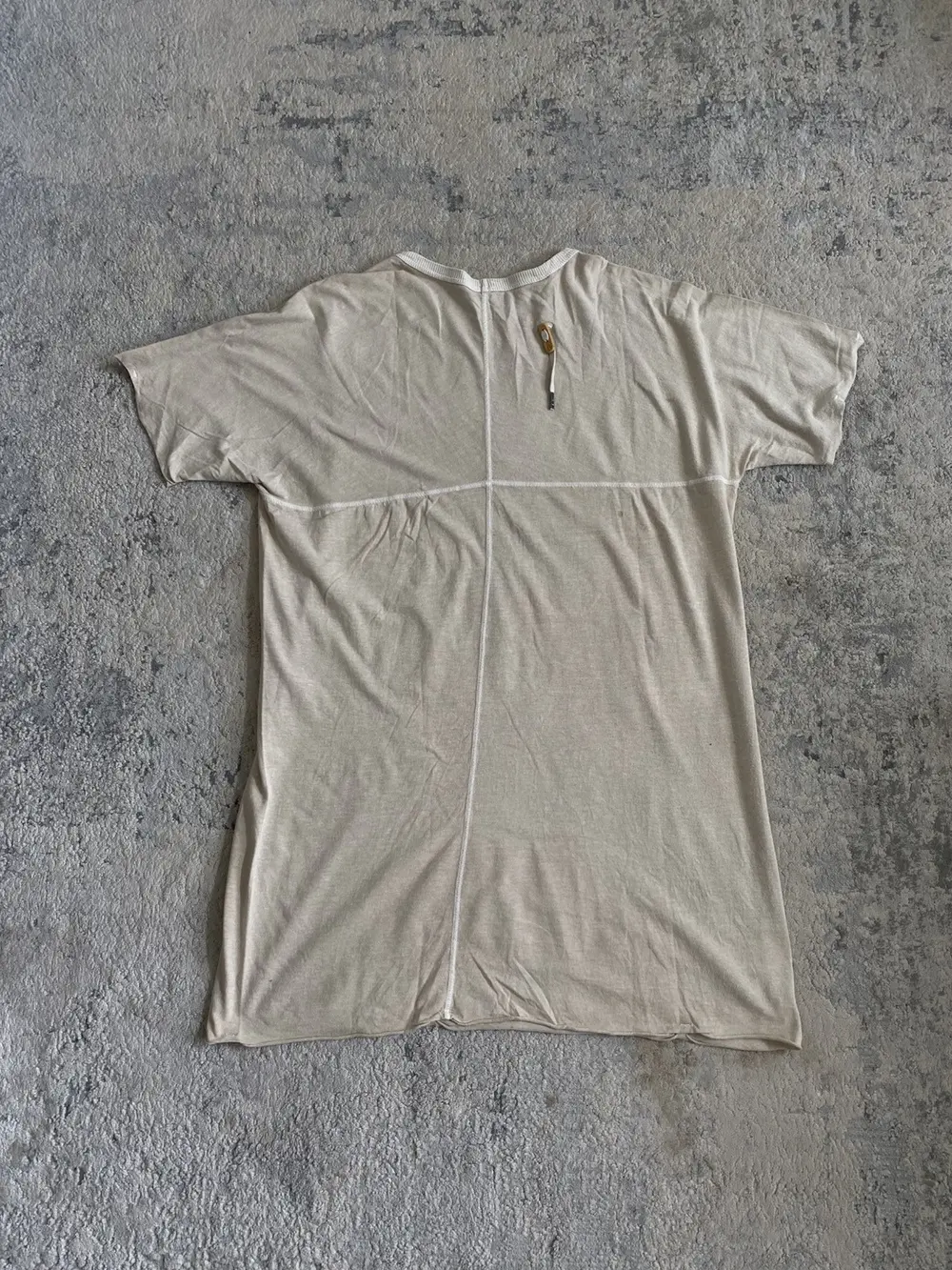 From Boris Bidjan Saberi’s mainline, the TS1 Tee embodies his signature avant-garde aesthetic. It features raw hems and sleeves, an asymmetrical back seam and a string with a branded leather tab that starts inside the collar and emerges at the back. Brand and wash tags usually come attached to the back string but this tee is second-hand so tags have been removed.
