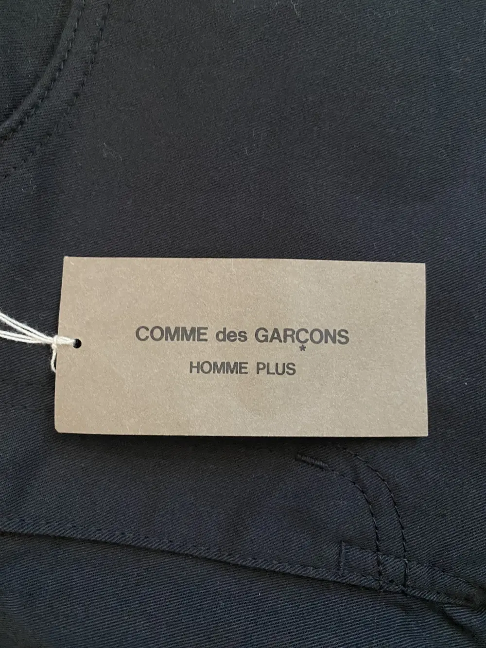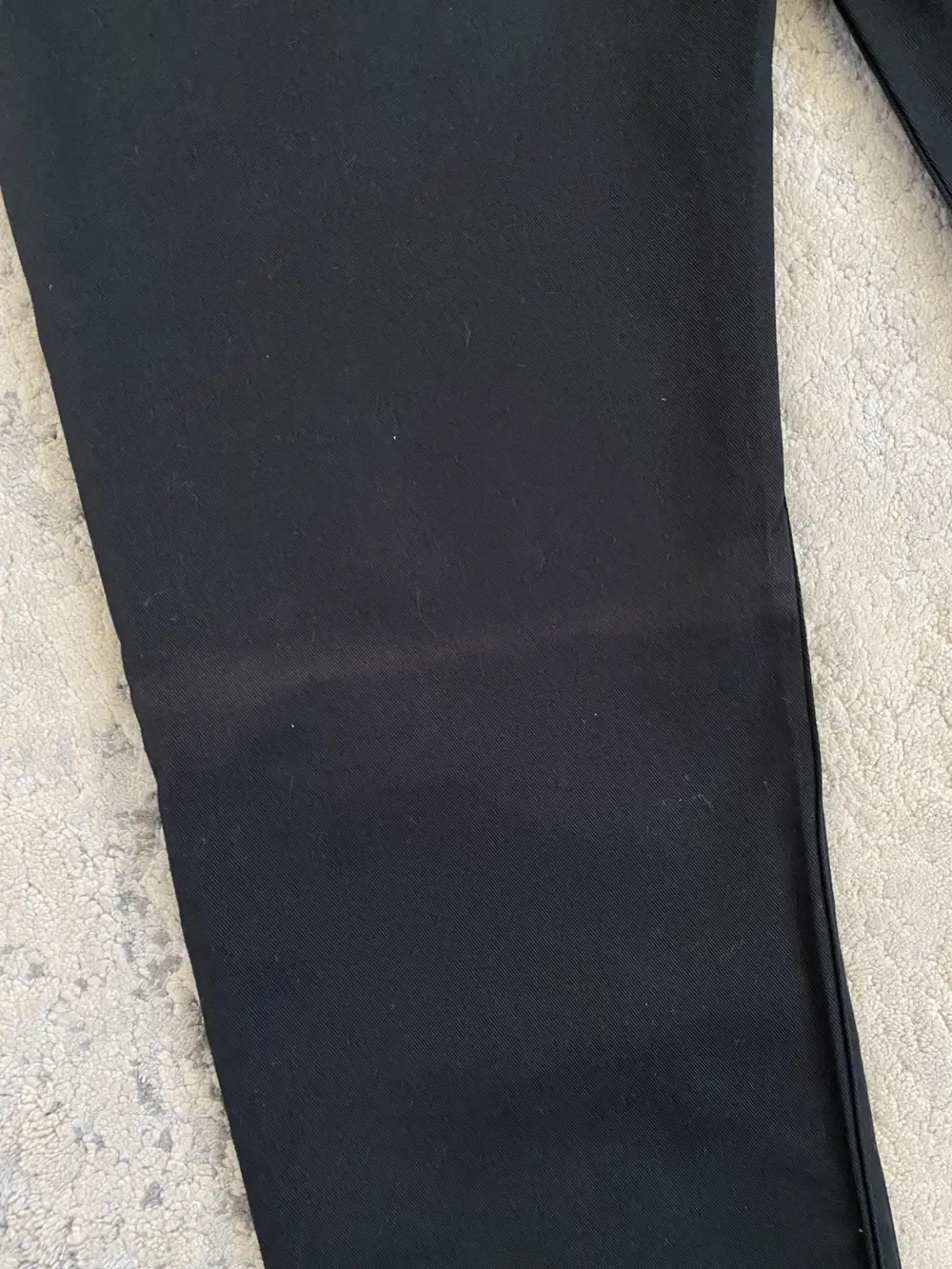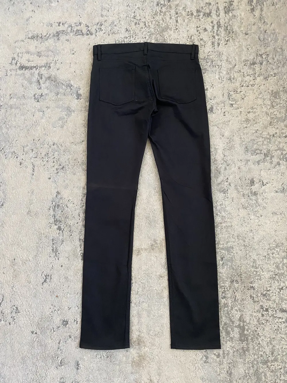 Classic 5-pocket construction meets Comme des Garçons’ cerebral minimalism. Black cotton blend is smooth and breathable, with just enough stretch to contour without constriction. Slim fit through leg with sharp taper. Retail tag attached