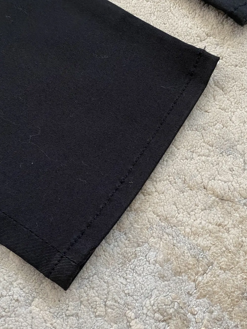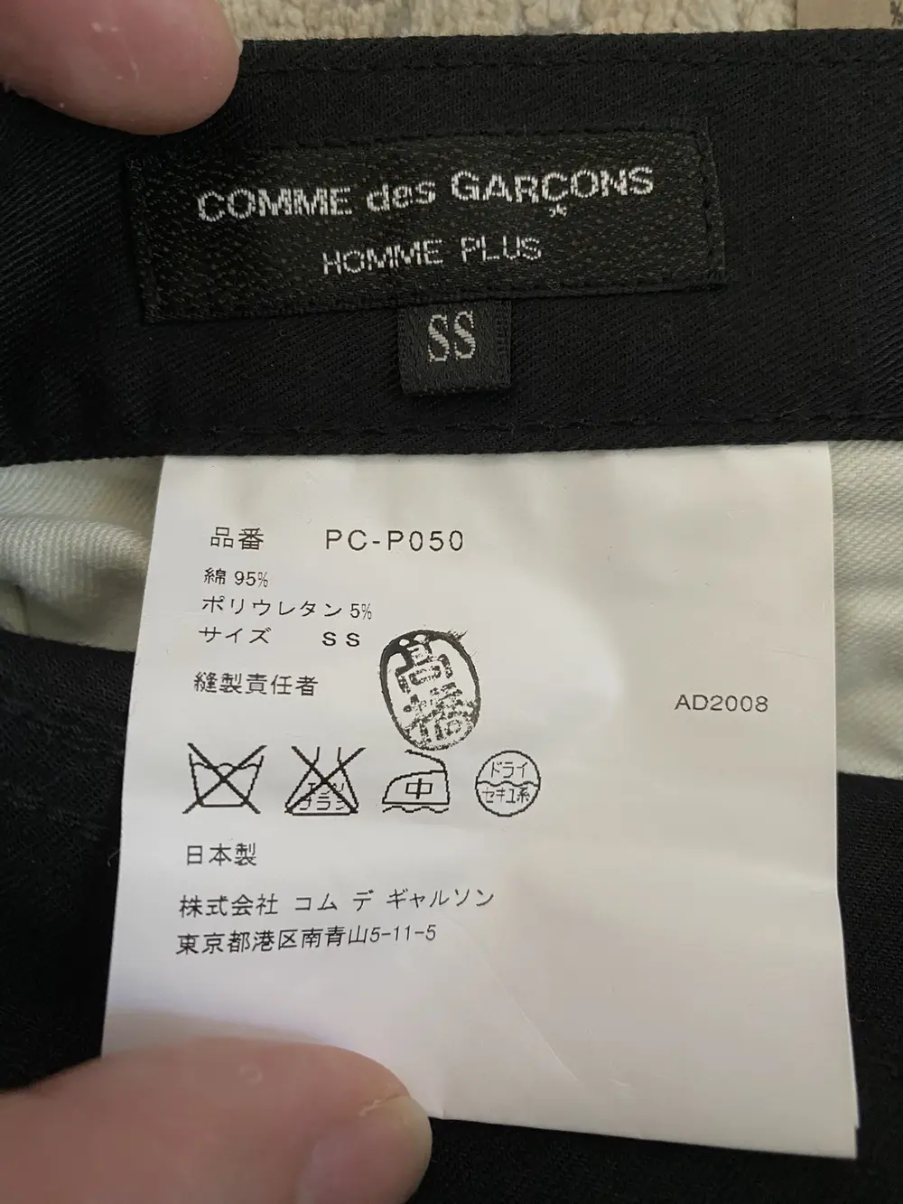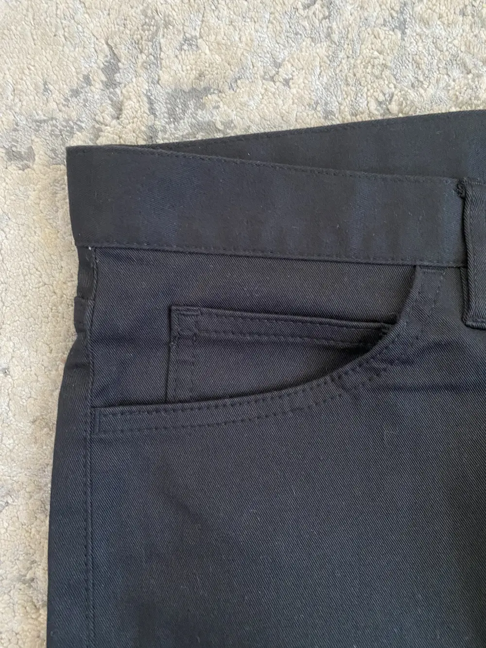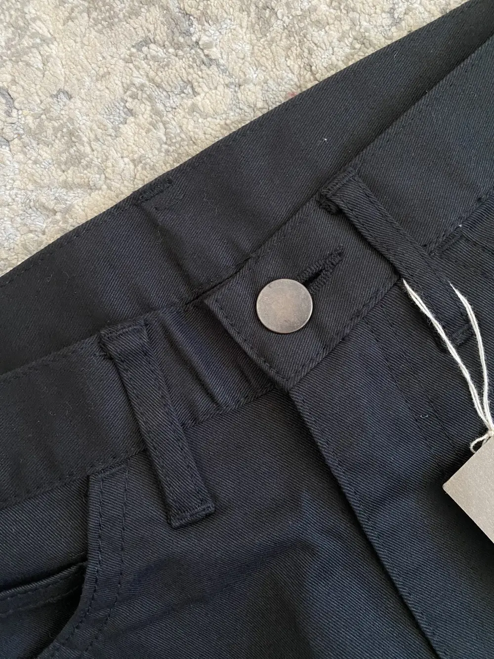 Classic 5-pocket construction meets Comme des Garçons’ cerebral minimalism. Black cotton blend is smooth and breathable, with just enough stretch to contour without constriction. Slim fit through leg with sharp taper. Retail tag attached