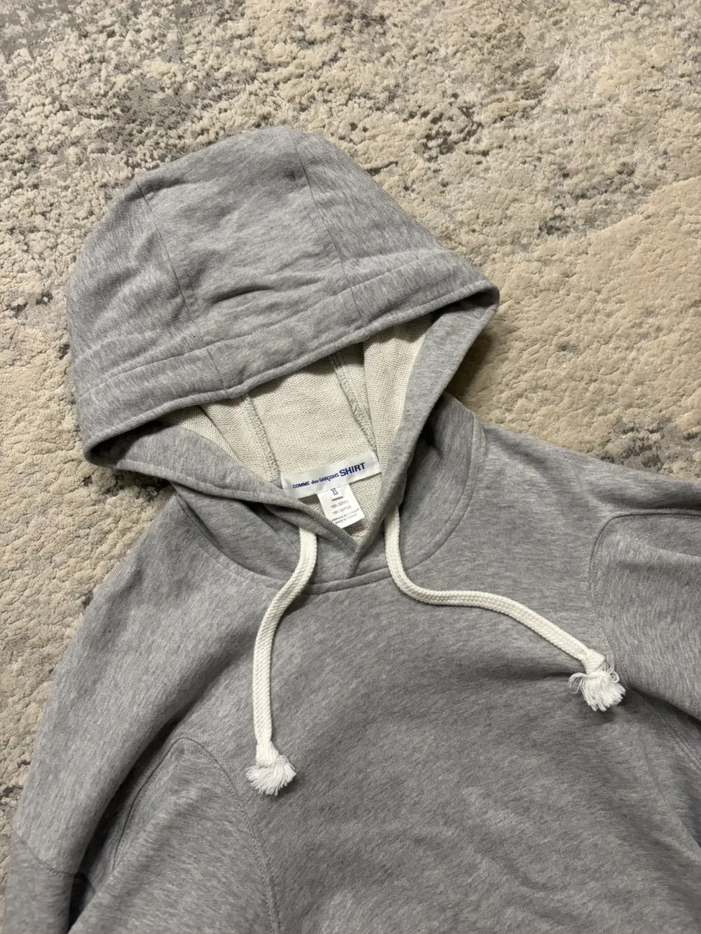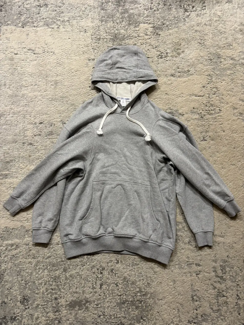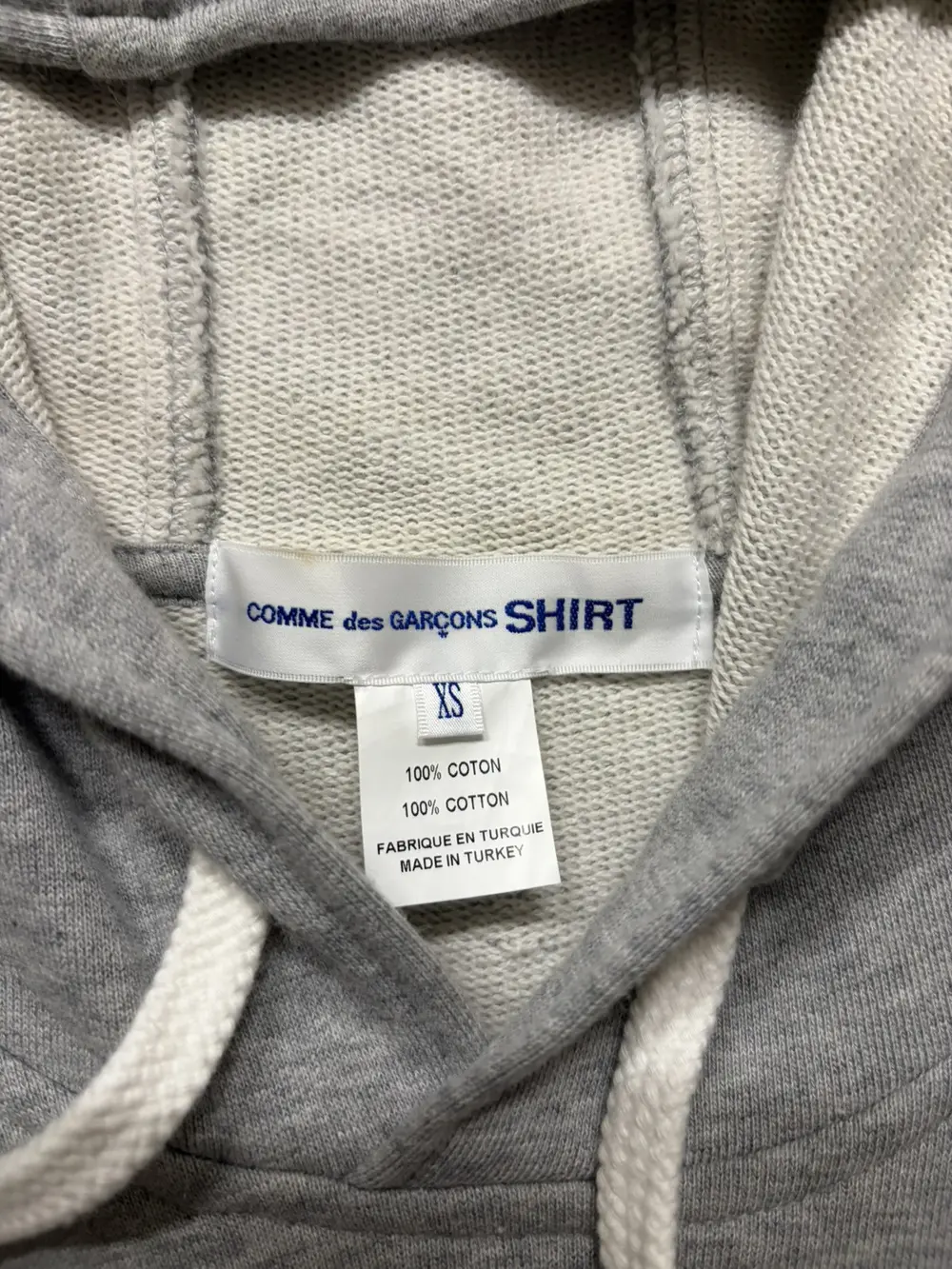 Comme des Garçons Shirt FW24 multi‑sleeve hoodie in soft grey cotton, cut oversized with four functional sleeves. White rope drawstrings and a relaxed fit.