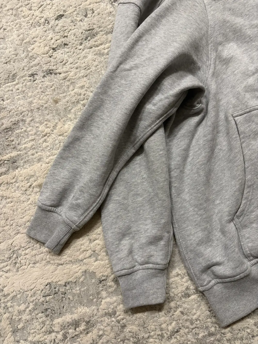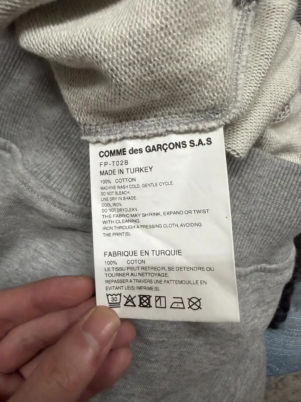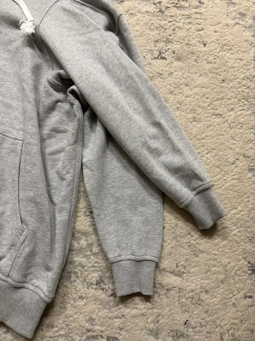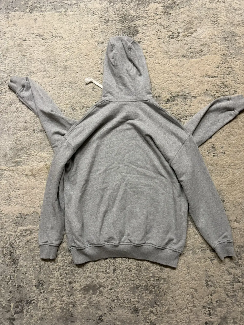 Comme des Garçons Shirt FW24 multi‑sleeve hoodie in soft grey cotton, cut oversized with four functional sleeves. White rope drawstrings and a relaxed fit.