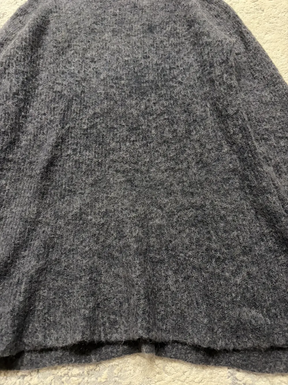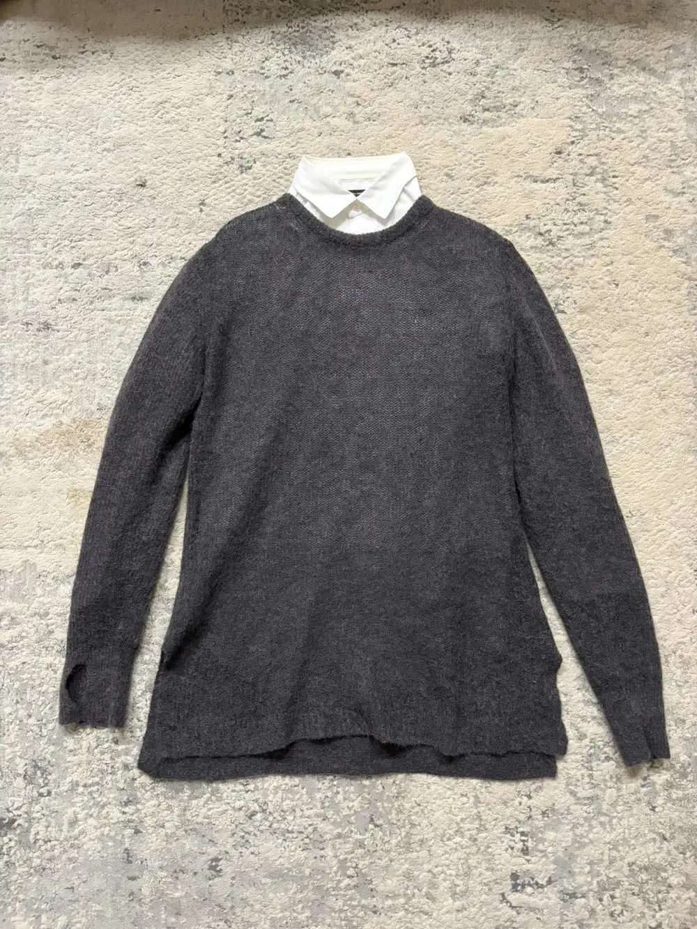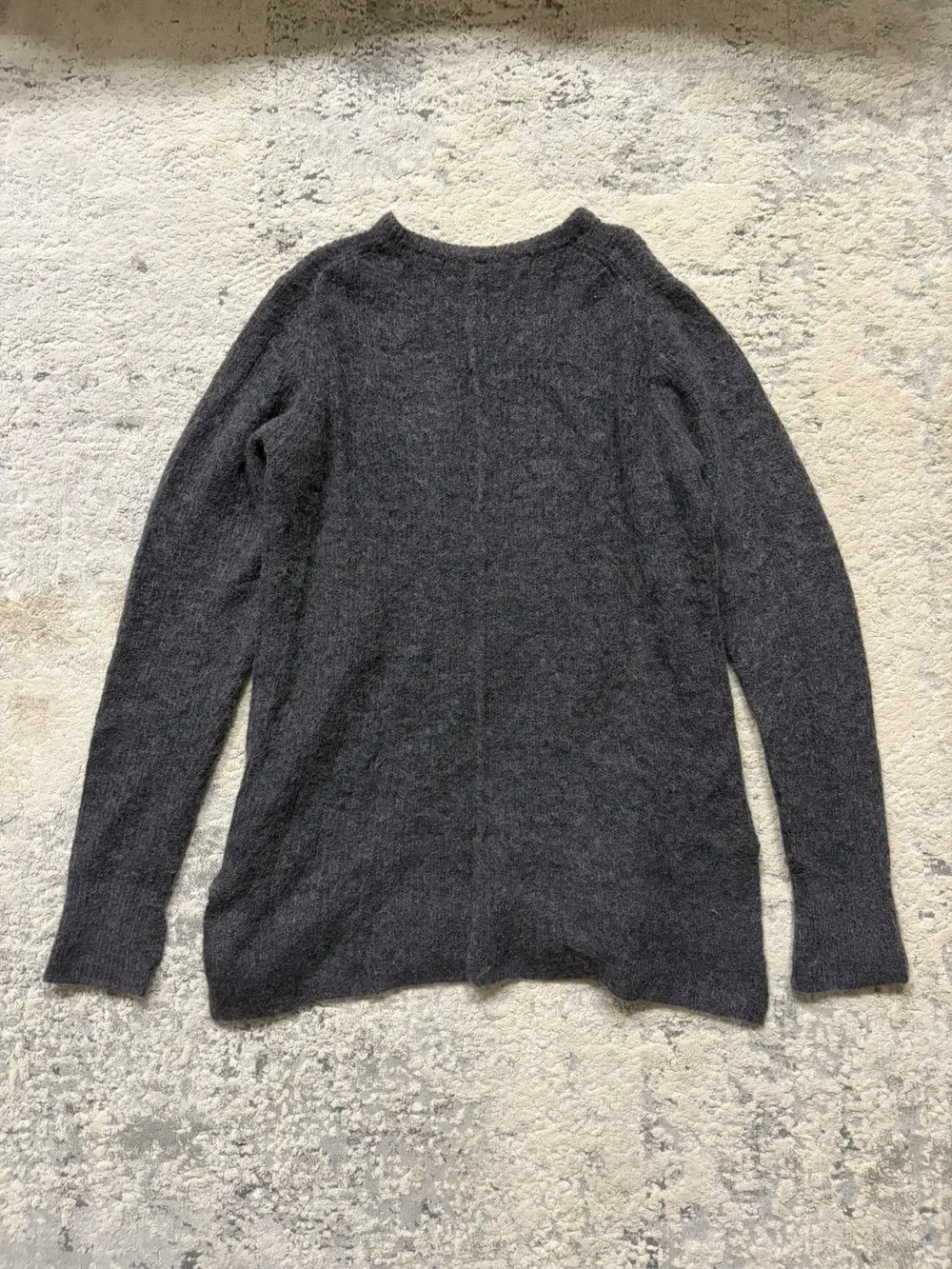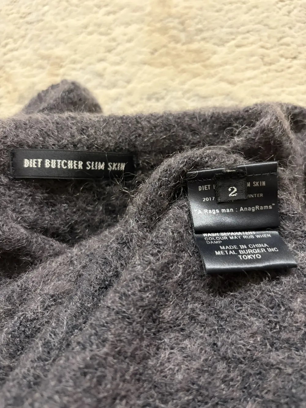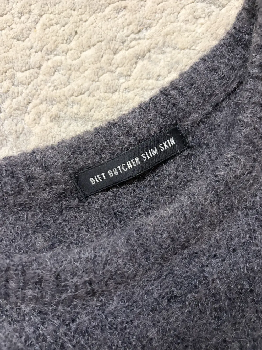 From Diet Butcher’s Fall/Winter 2017 collection “A Rags man : AnagRams,” this knit sweater is crafted from lightweight wool and designed with the label’s signature elongated proportions. It features extended sleeves with built‑in thumb holes, a clean crewneck, and subtle split hems that add movement and layering versatility. Styled with a 1998 CDGH+ shirt not included, but available to be bundled.
