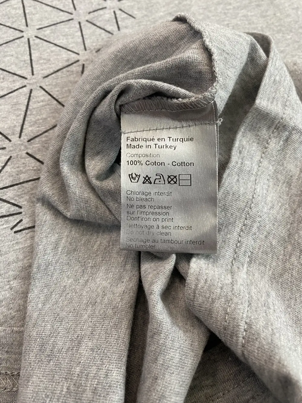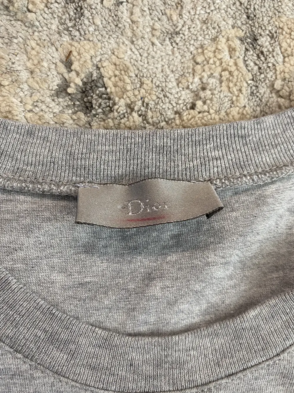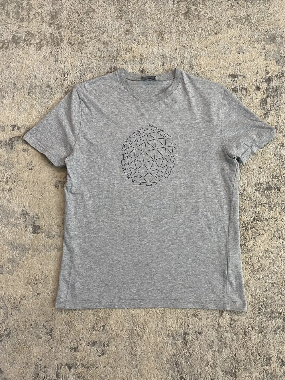 Heather gray short-sleeve tee from Hedi Slimane’s Autumn/Winter 2007 collection. Features a bold geometric globe graphic printed at the chest, evoking themes of displacement and futurism. Constructed with darted back shoulders for tailored structure and subtle architectural shaping. A rare archival piece from Hedi Slimane’s final year at Dior.