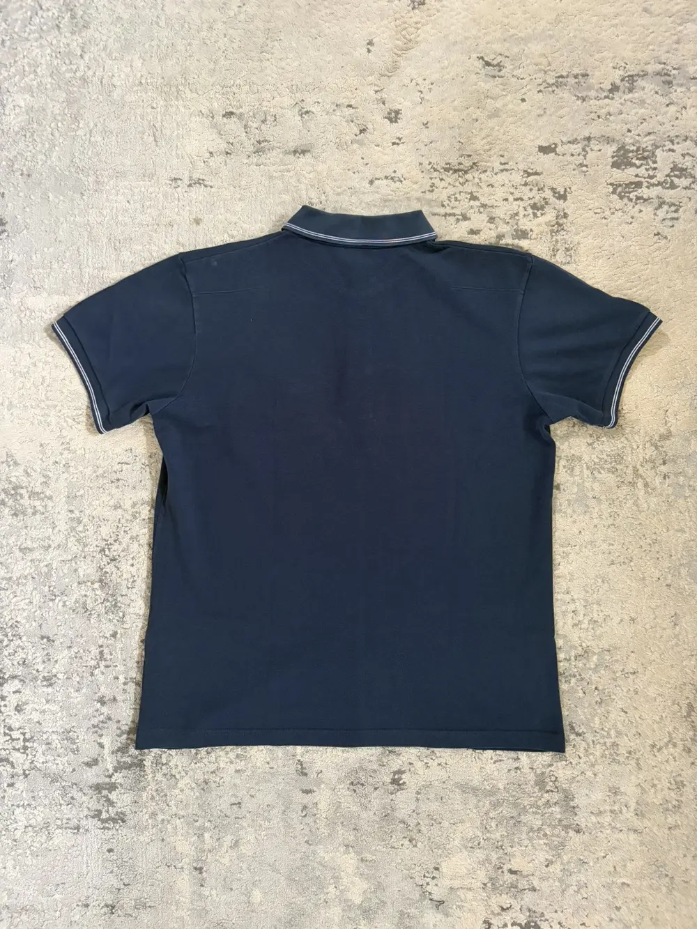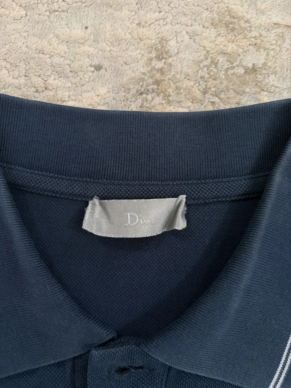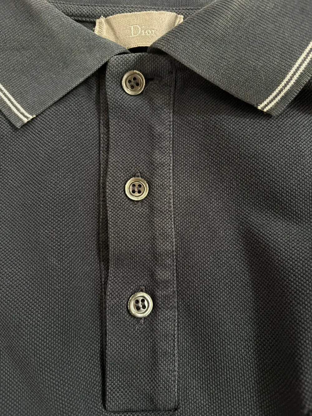 Dior polo featuring their signature bee logo embroidered on the front with a front chest pocket. Collar and sleeves are trimmed with white stripes and the back features darted shoulders. T shirt in good condition with general wear.