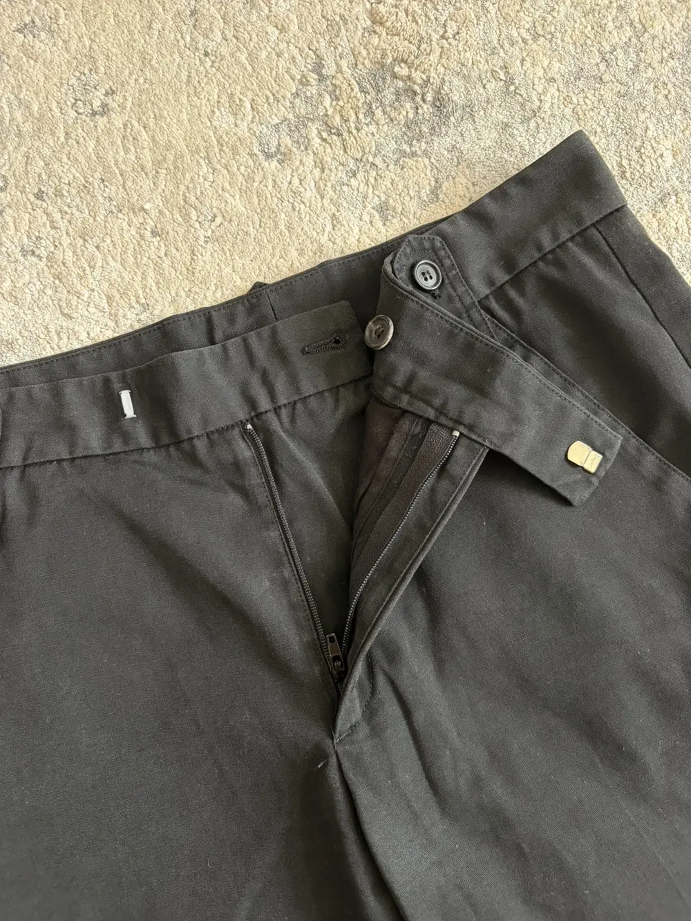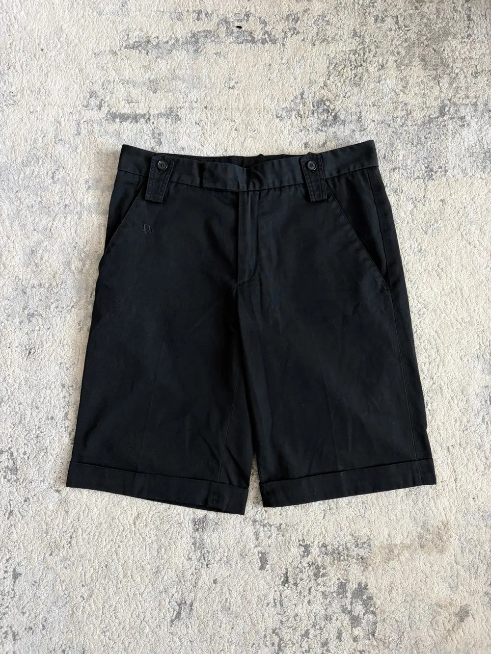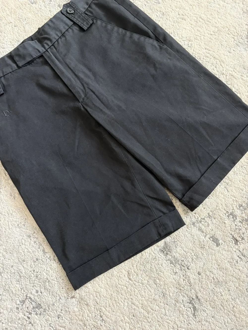 Dior Homme Spring/Summer 2004 “Strip” cotton shorts featuring tonal black Dior embroidery at the front and a crisp pleat running down each leg for a sharp, tailored line. Designed with a folded‑up hem, 4‑pocket layout, and suspender buttons that double as belt loops, a signature detail from early‑2000s Dior. A rare piece from one of the most sought‑after Hedi‑era collections.