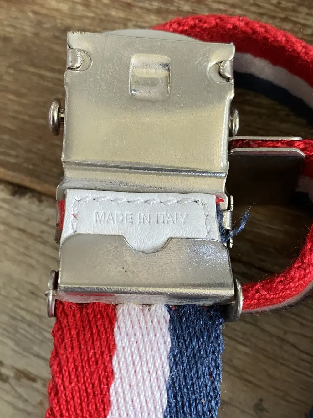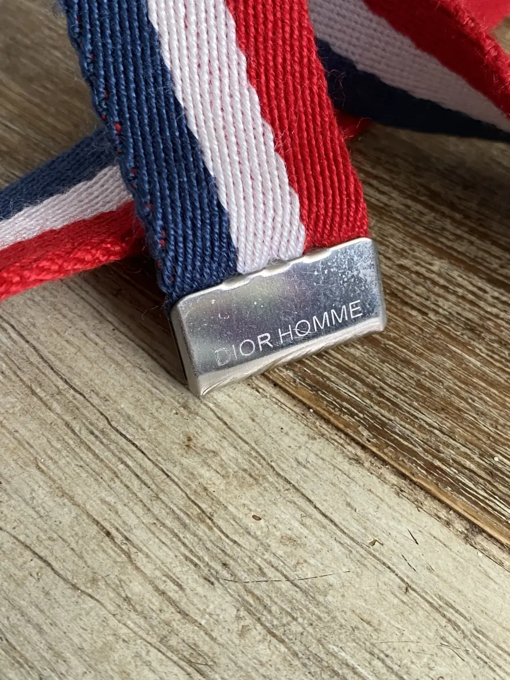 A bold utilitarian accent from Dior Homme, this belt features a red, white, and blue striped canvas strap paired with a rollercoaster-style buckle—a nod to industrial design. The Dior-branded hardware adds a refined edge, blending streetwear energy with the label’s signature precision.