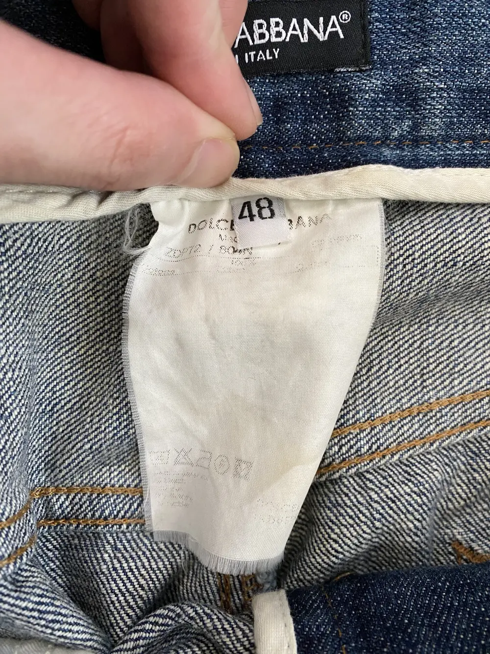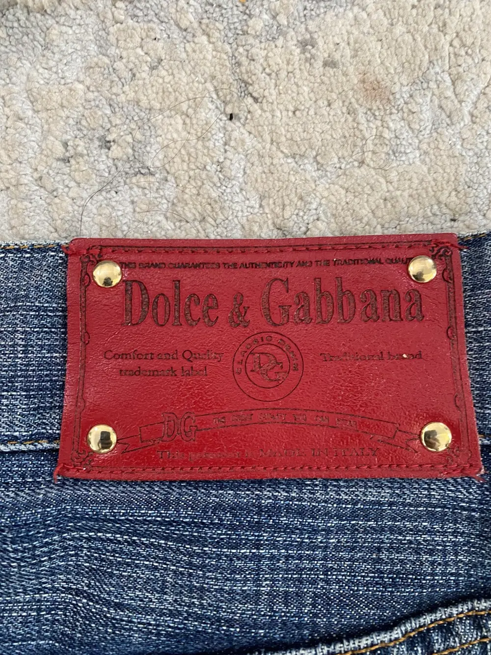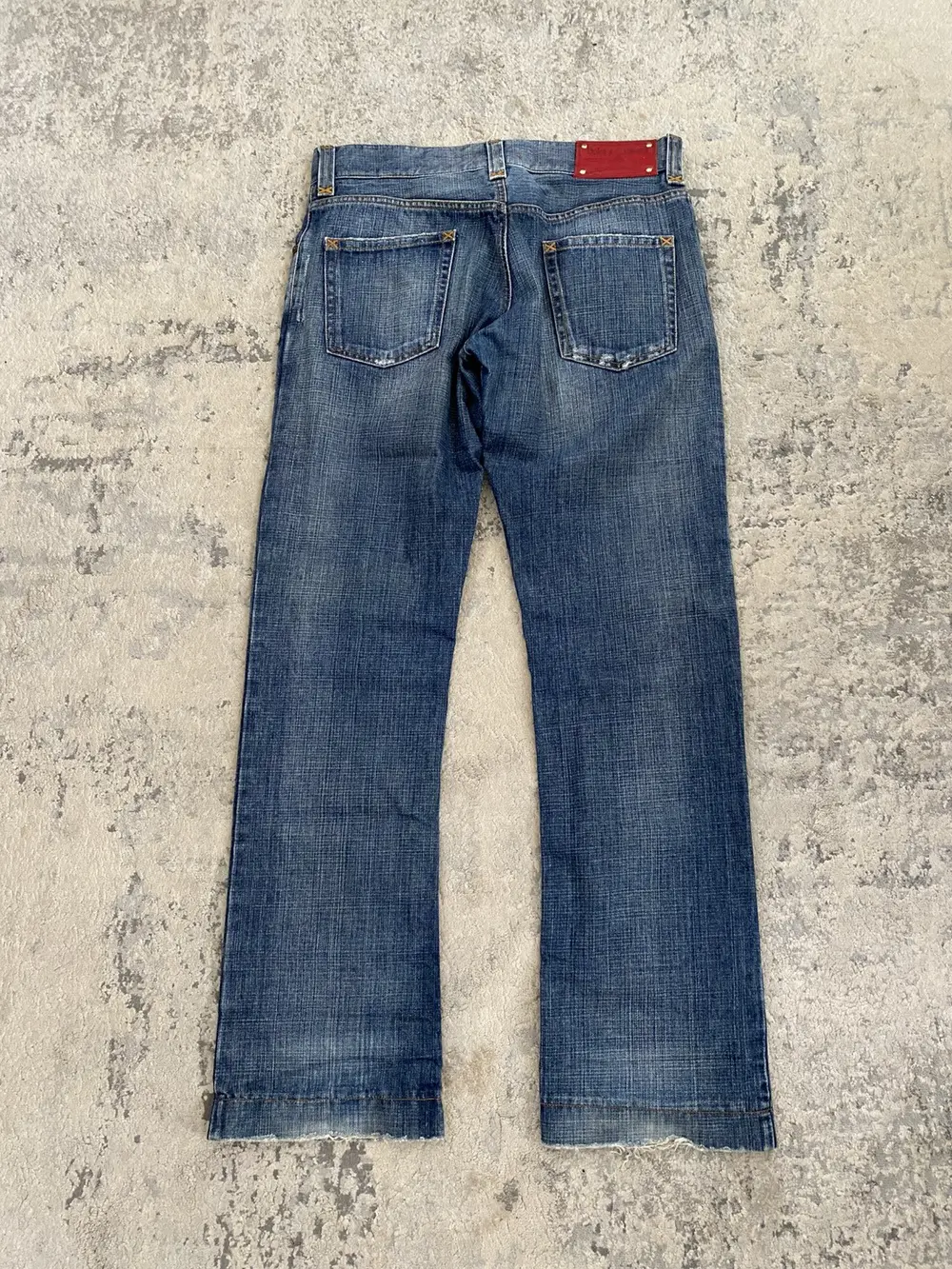 Bootcut denim from Dolce & Gabbana. Features heavy distressing throughout—natural abrasions and frayed pockets, legs and hems. Deep indigo wash that contrasts beautifully against the signature red leather Dolce back tab. Branded front pocket embroidery adds the designer’s signature stamp.