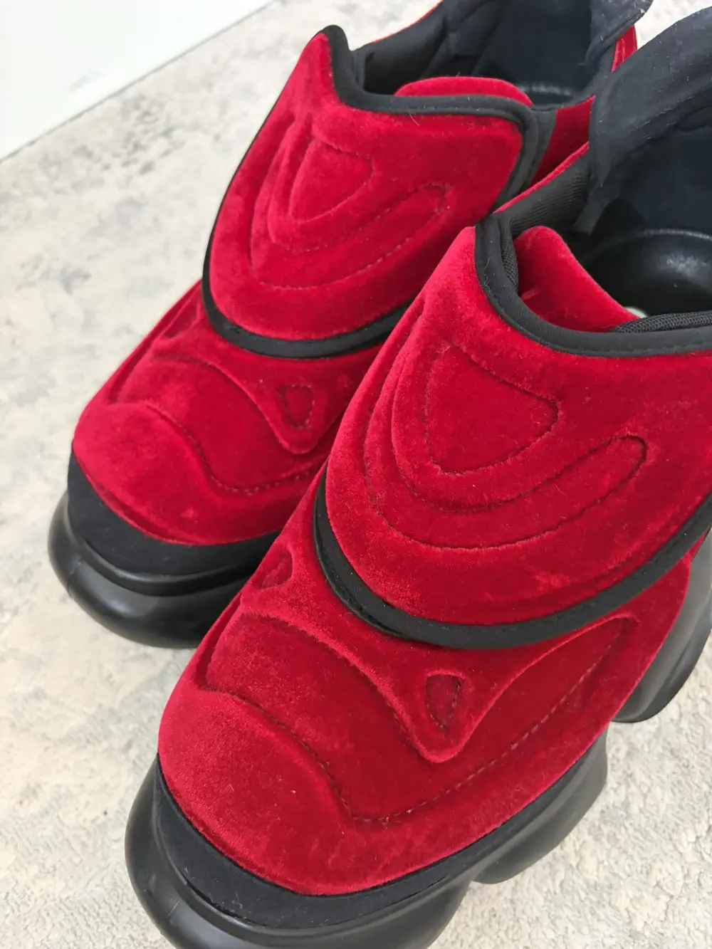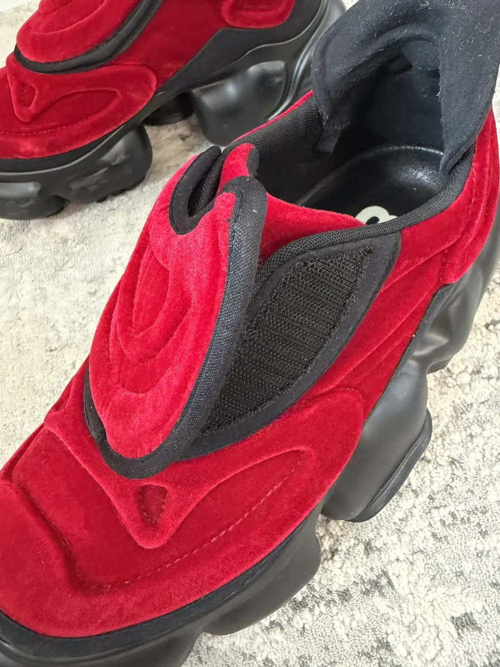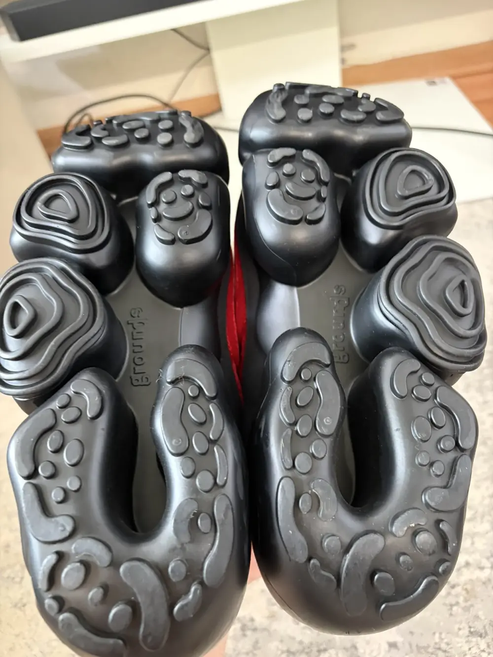 grounds is a footwear label based in Japan that specialize in footwear with exaggerated proportions and high platforms perfect for raves-concerts or to just height mog your friends and family. These sneakers feature a red velvet upper that is smooth to the touch with an oversized rubber outsole with bubble-like protrusions and unique treaded bottom. Features a velcro flap closure and gusseted tongue, soft neoprene interior and a similar paneling wrapping the entire shoe. These give you like +3 inches so wear only if you want to tower over mfs.