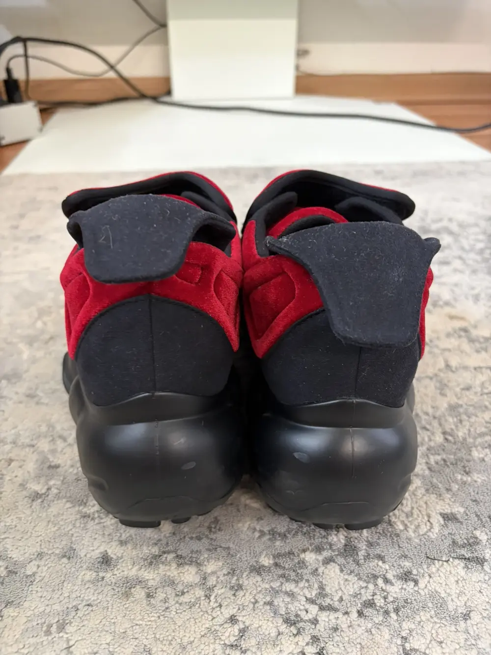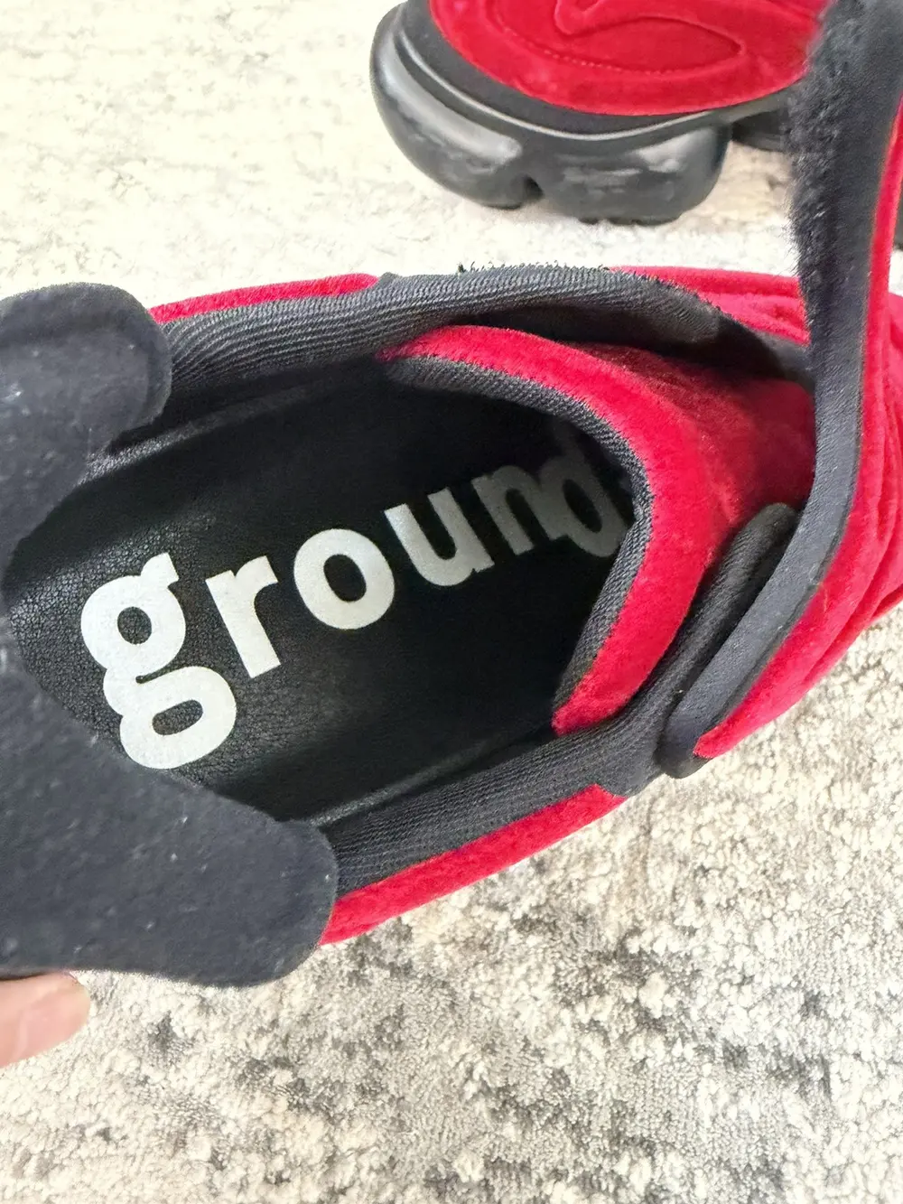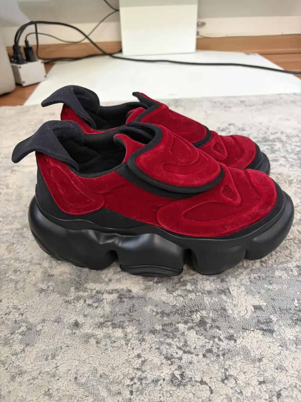 grounds is a footwear label based in Japan that specialize in footwear with exaggerated proportions and high platforms perfect for raves-concerts or to just height mog your friends and family. These sneakers feature a red velvet upper that is smooth to the touch with an oversized rubber outsole with bubble-like protrusions and unique treaded bottom. Features a velcro flap closure and gusseted tongue, soft neoprene interior and a similar paneling wrapping the entire shoe. These give you like +3 inches so wear only if you want to tower over mfs.