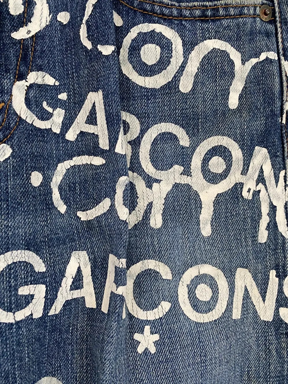 Colab from Spring Summer 2002 between Comme des Garçons and Milan’s iconic 10 Corso Como. Classic light blue Levi’s 503 fit with bold white painted “Comme des Garçons” and “Corso Como” across the front. The hand-painted motif extends onto the interior tags. Original hems intact, features Levi’s signature red tab and embossed leather patch at back.