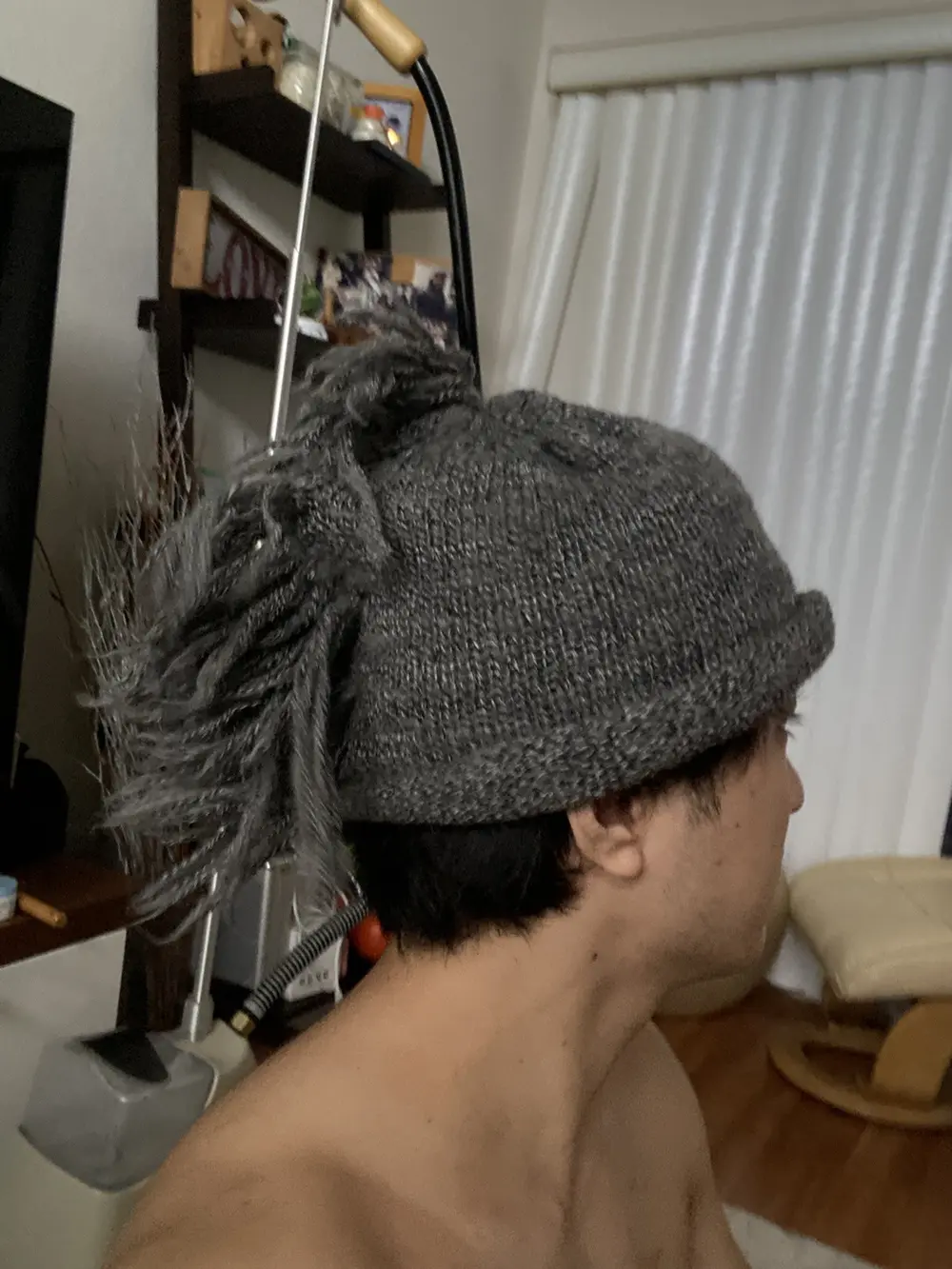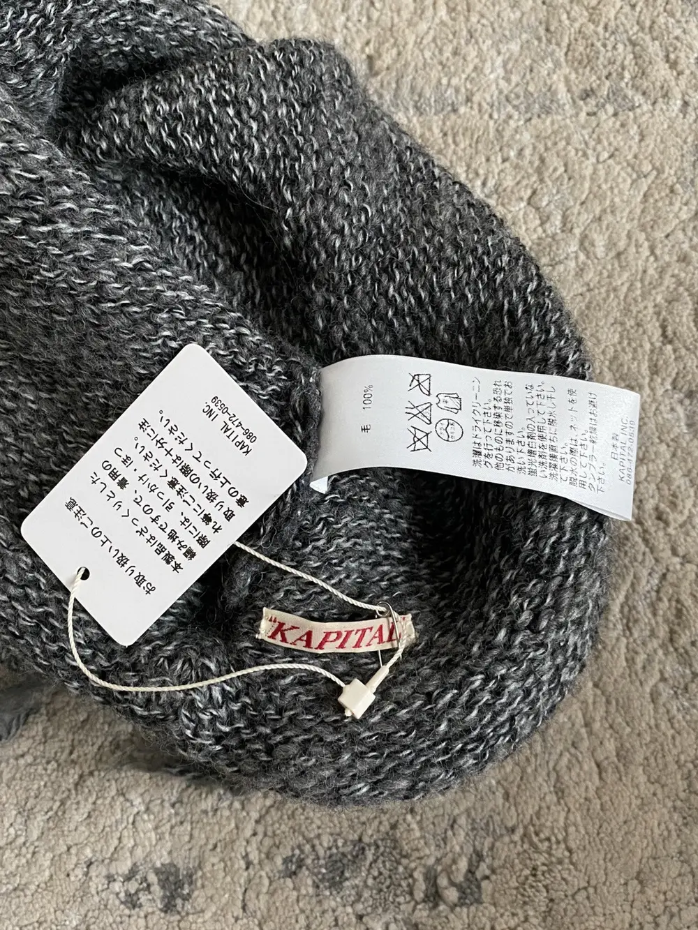 Distinctive Kapital beanie crafted in a textured knit construction, featuring a bold fringe mohawk detail that extends halfway up the back of the head. The design blends playful avant-garde styling with Kapital’s signature approach to unconventional accessories.