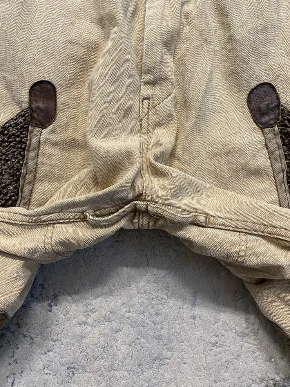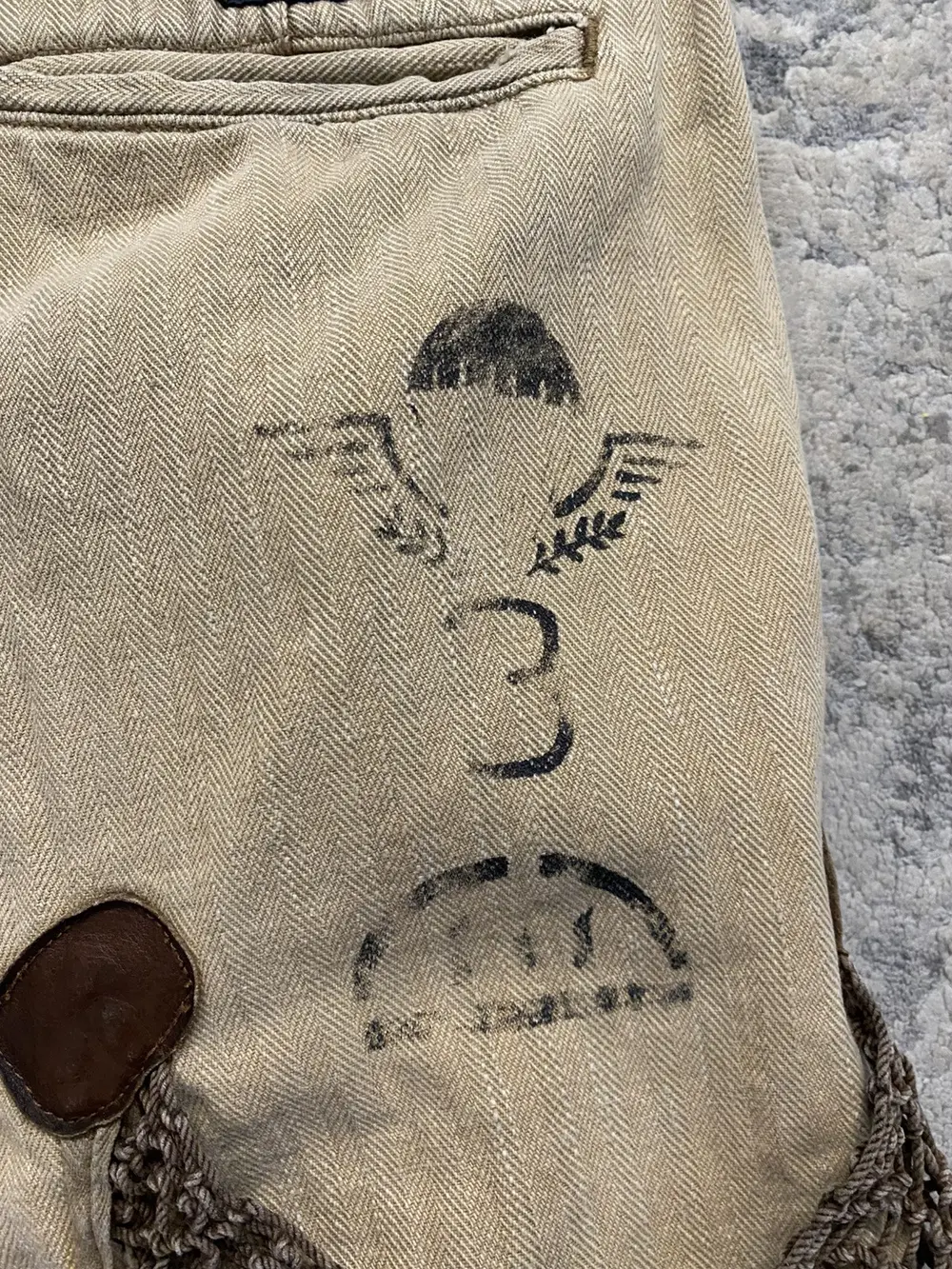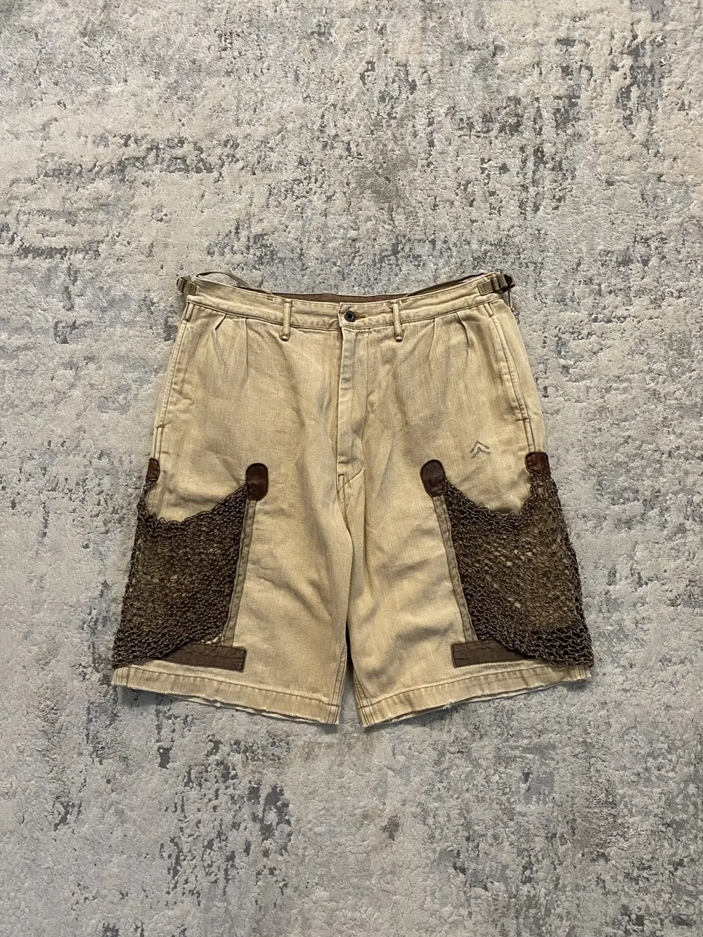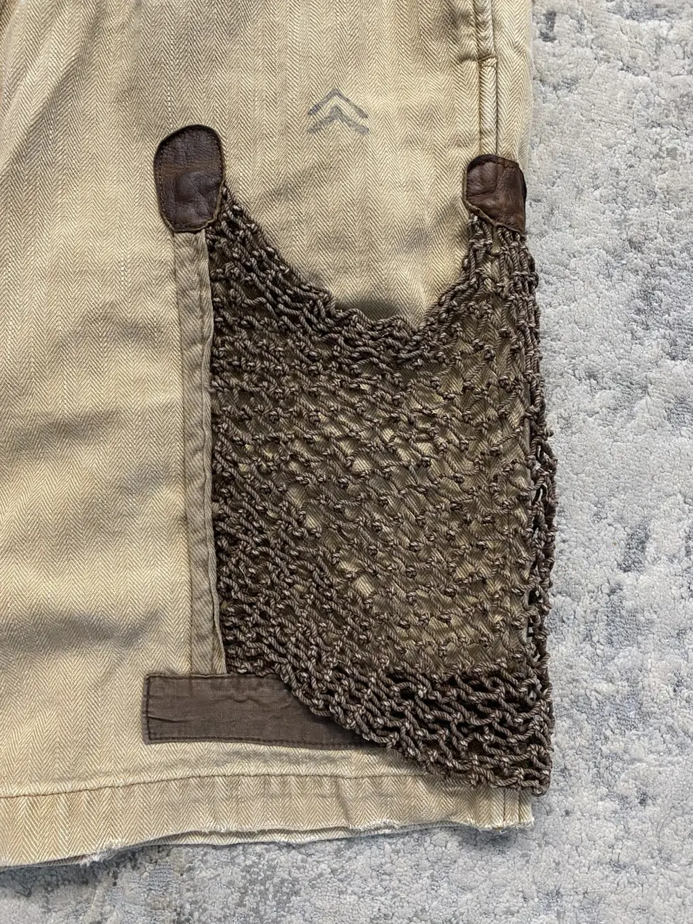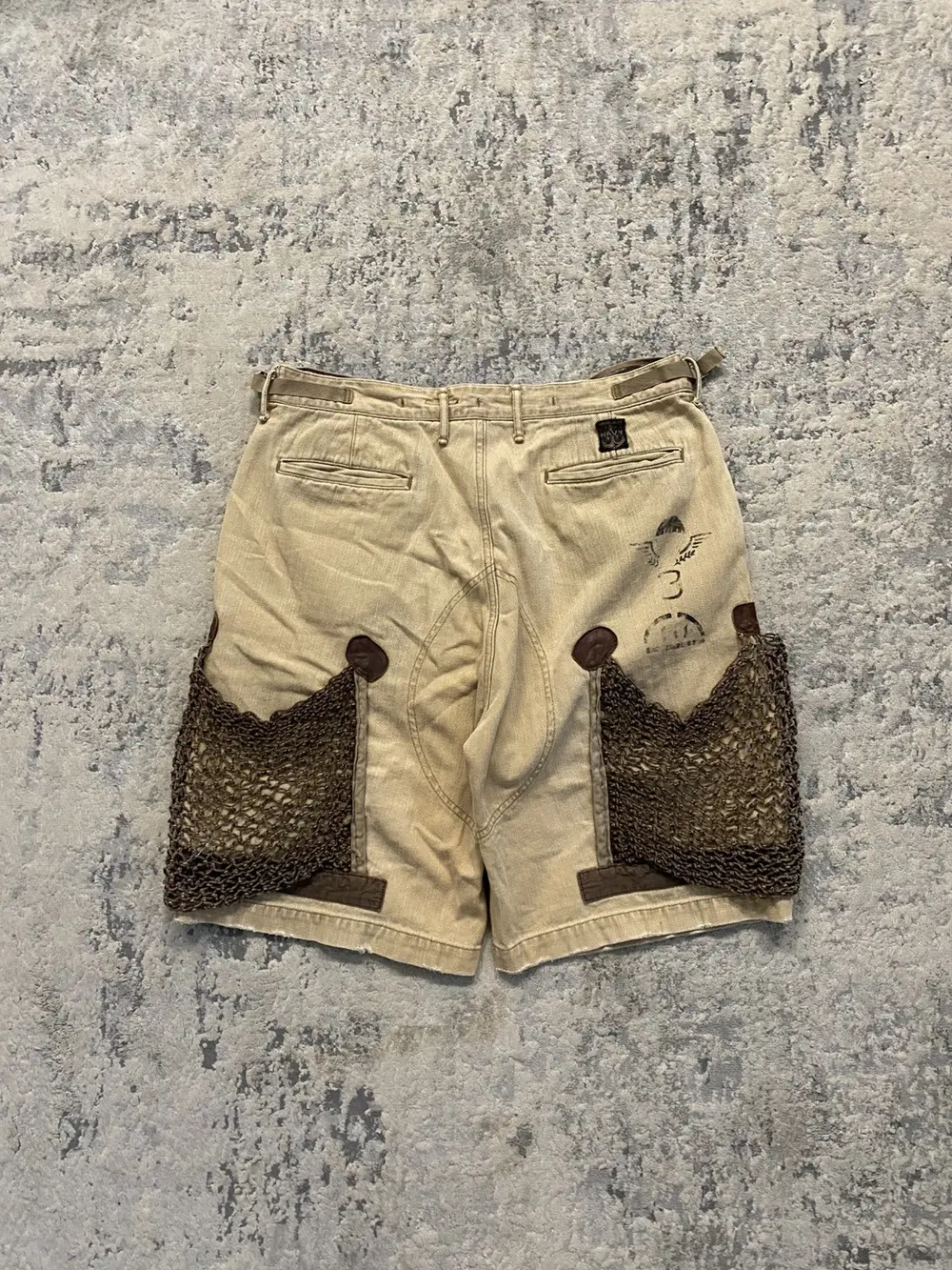 These shorts feature symmetrical netted cargo pockets on each leg and subtle military-style stencil motifs throughout. Details include twin crotch loops, interior waistband loops (suspender-compatible), leather tab accents, and adjustable cinch-buckle waist. A rare fusion of function and eccentric detailing—perfect for layered archival looks or stand-alone statement wear.
