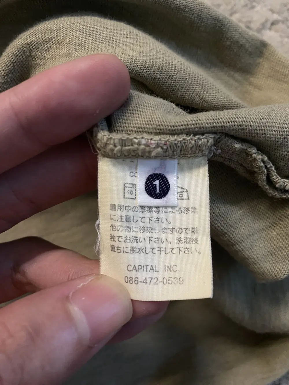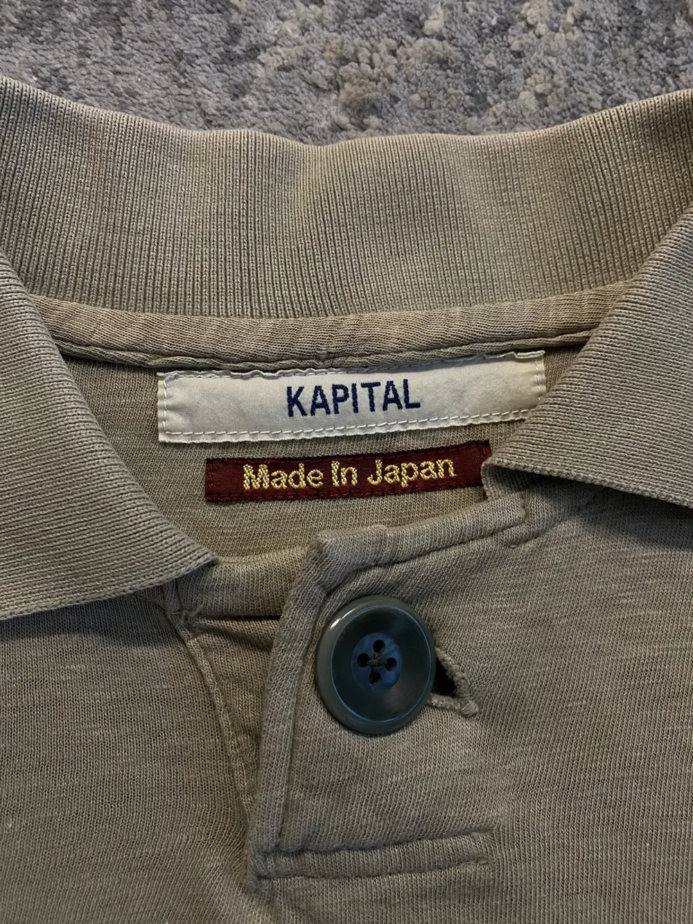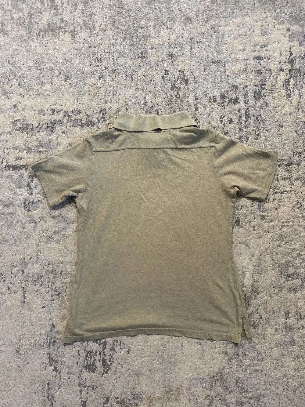 Muted beige cotton with a smooth, breathable hand feel. Features a single oversized button at the collar, lending quiet emphasis to an otherwise pared-back silhouette. Split hems and precise construction give it an effortless structure