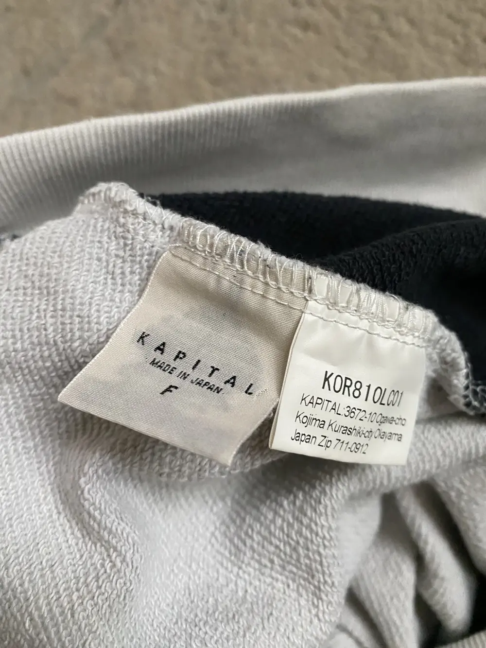 The back panel contrasts in black cotton, showcasing Kapital’s signature skeleton graphic, now softened with fade from wear. Flaws are pictured, consistent with vintage condition, adding character without compromising structure.