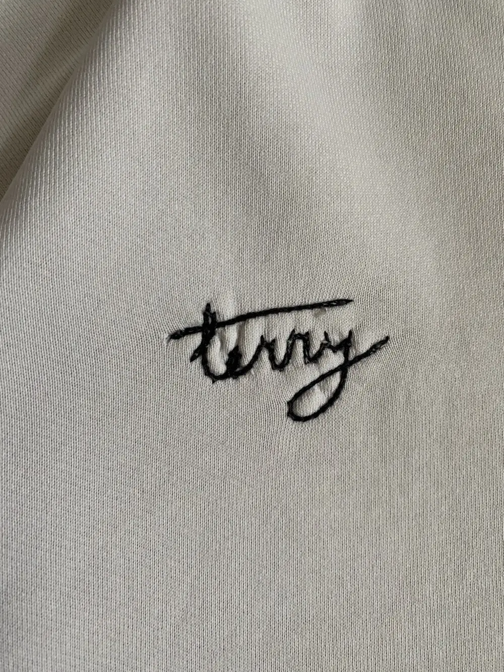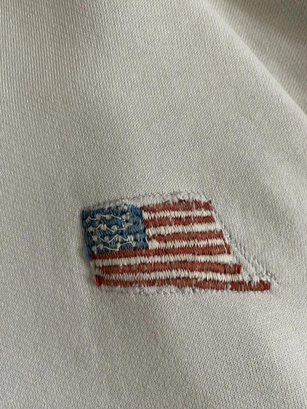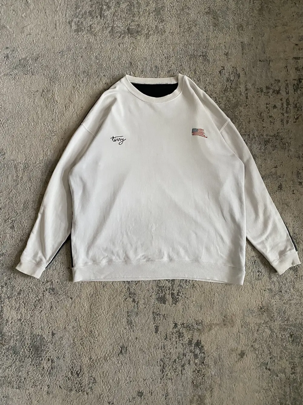 Distinctive Kapital sweatshirt featuring a white terry cotton front with dual chest embroideries: one reading “TERRY” and the other a USA flag motif. The garment carries a vintage wash with intentional fading, complemented by distressed detailing at the hem, neckline, and sleeves for a worn-in aesthetic.