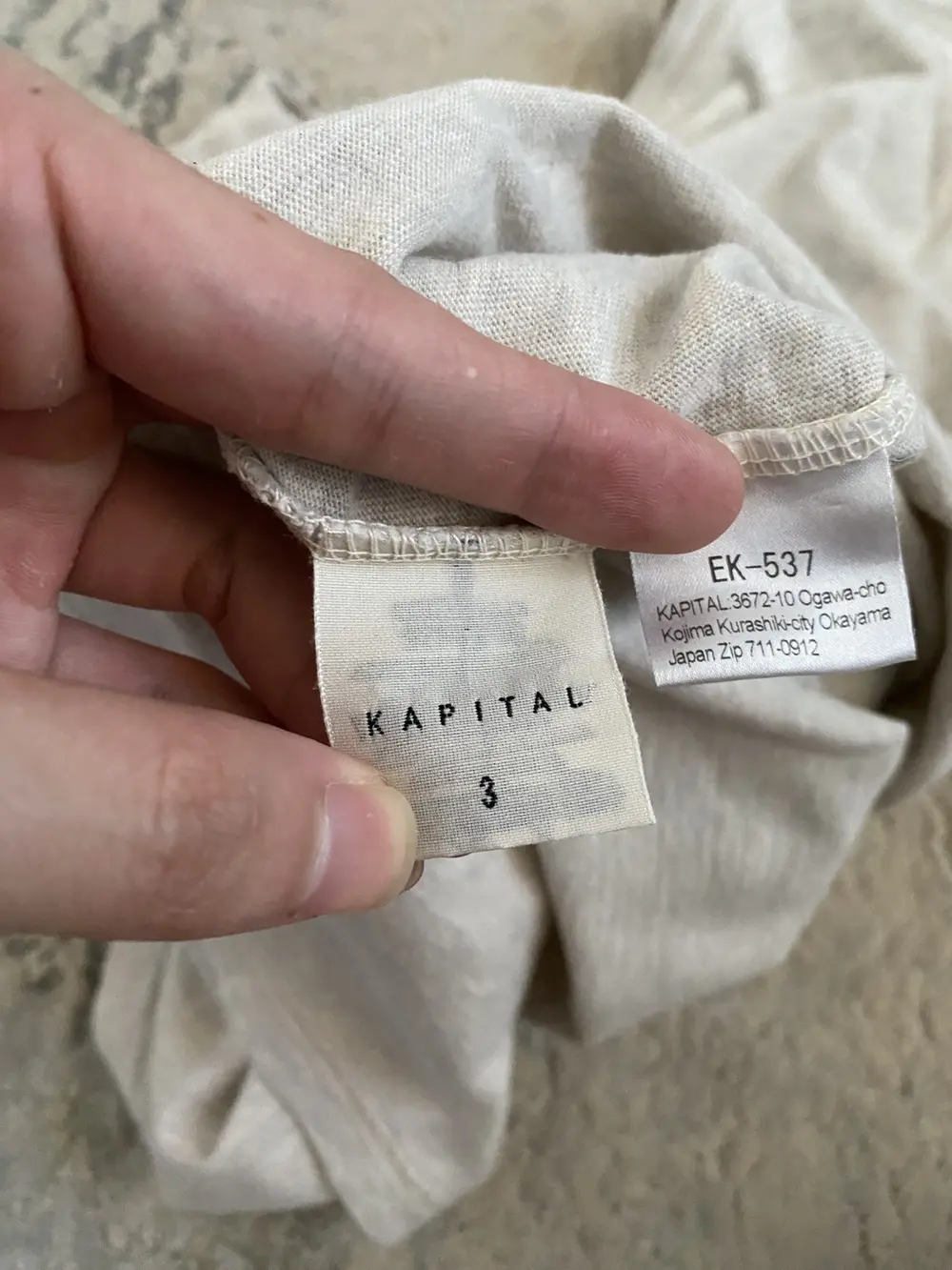 From Kapital’s Spring Summer 2011 Farmy collection, this tee features a painted front graphic of Farmy brushed across the chest and over the pocket for a deliberate hand-finished feel. Cut from soft, heathered beige cotton, it blends comfort with Kapital’s signature offbeat charm.