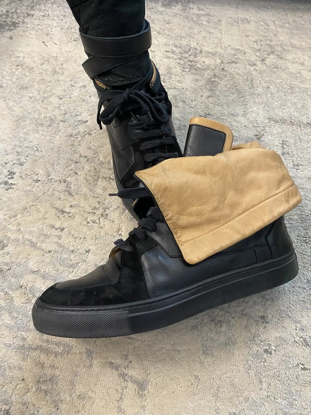 This KVA sneaker-boot features a black leather upper with intersecting paneling and a tonal suede wrap that contours the toe box and runs along the lace line. The shaft is crafted from a neoprene-like material, secured by a Velcro leather strap that wraps around for added support. Finished with a traditional rubber outsole and cotton lace system.