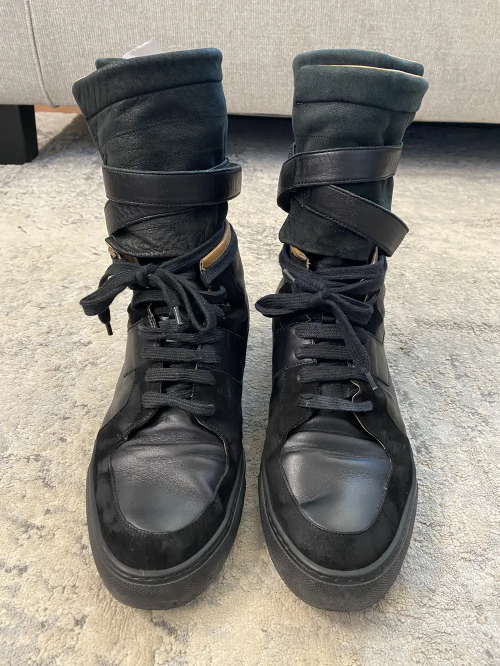 This KVA sneaker-boot features a black leather upper with intersecting paneling and a tonal suede wrap that contours the toe box and runs along the lace line. The shaft is crafted from a neoprene-like material, secured by a Velcro leather strap that wraps around for added support. Finished with a traditional rubber outsole and cotton lace system.