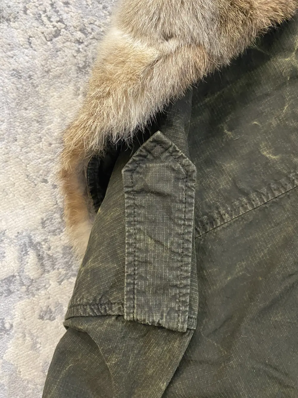 This jacket features a ripstop exterior with an inner layer of cow hide-exposing the grainy, textured underside that is removable via buttons and features its own zippers. 4 snap button pockets can be found on the front as well as a zipper sleeve pocket. Lined with soft rabbit fur, the collar features the same plush material, extending its luxurious texture and warmth around the neckline.