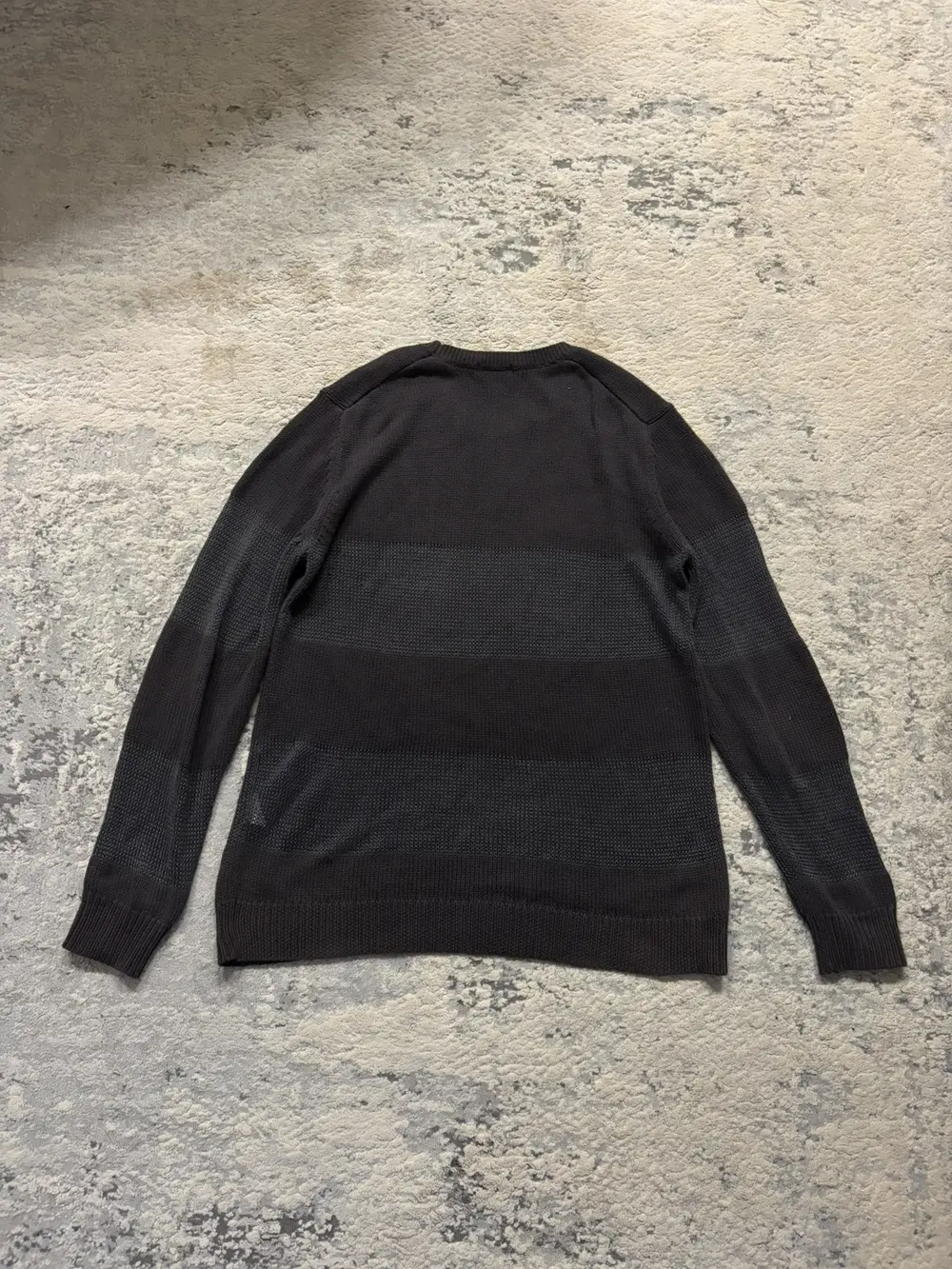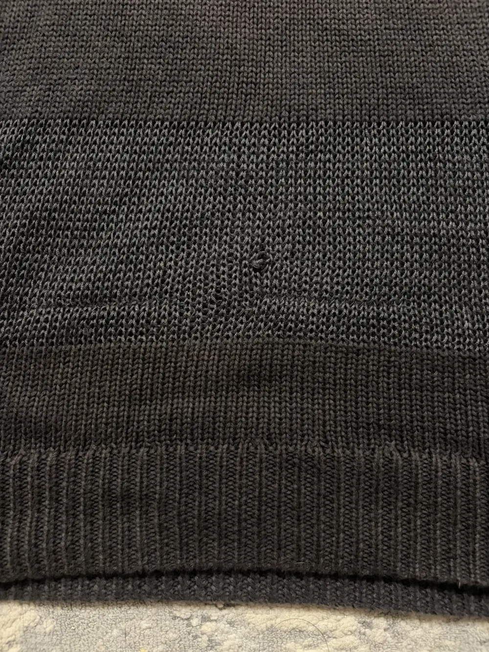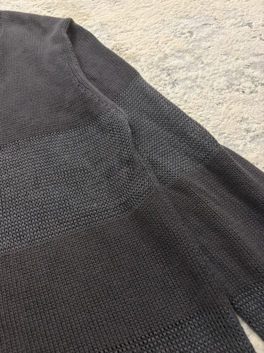 From Japanese label Lad Musician, this sweater is constructed of a stretchy gauze-like 70/30 cotton/hemp blend that is ever so slightly see through. Subtle black and gray stripes of alternating knit sections.