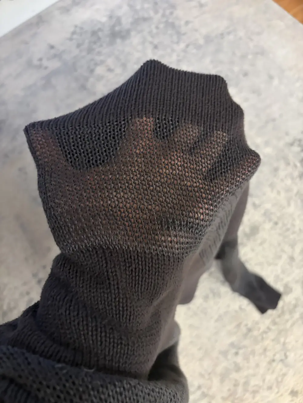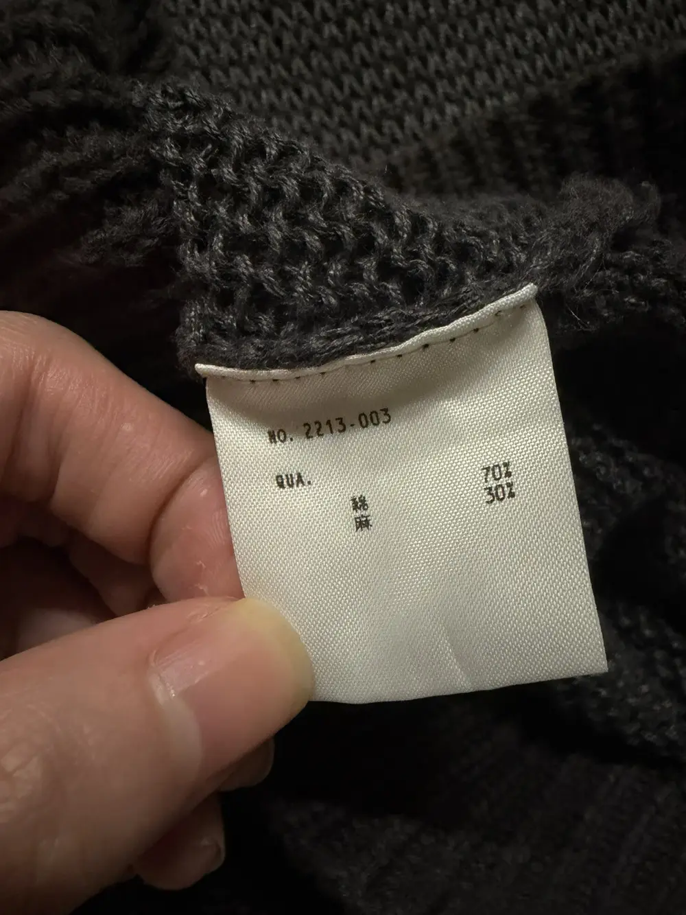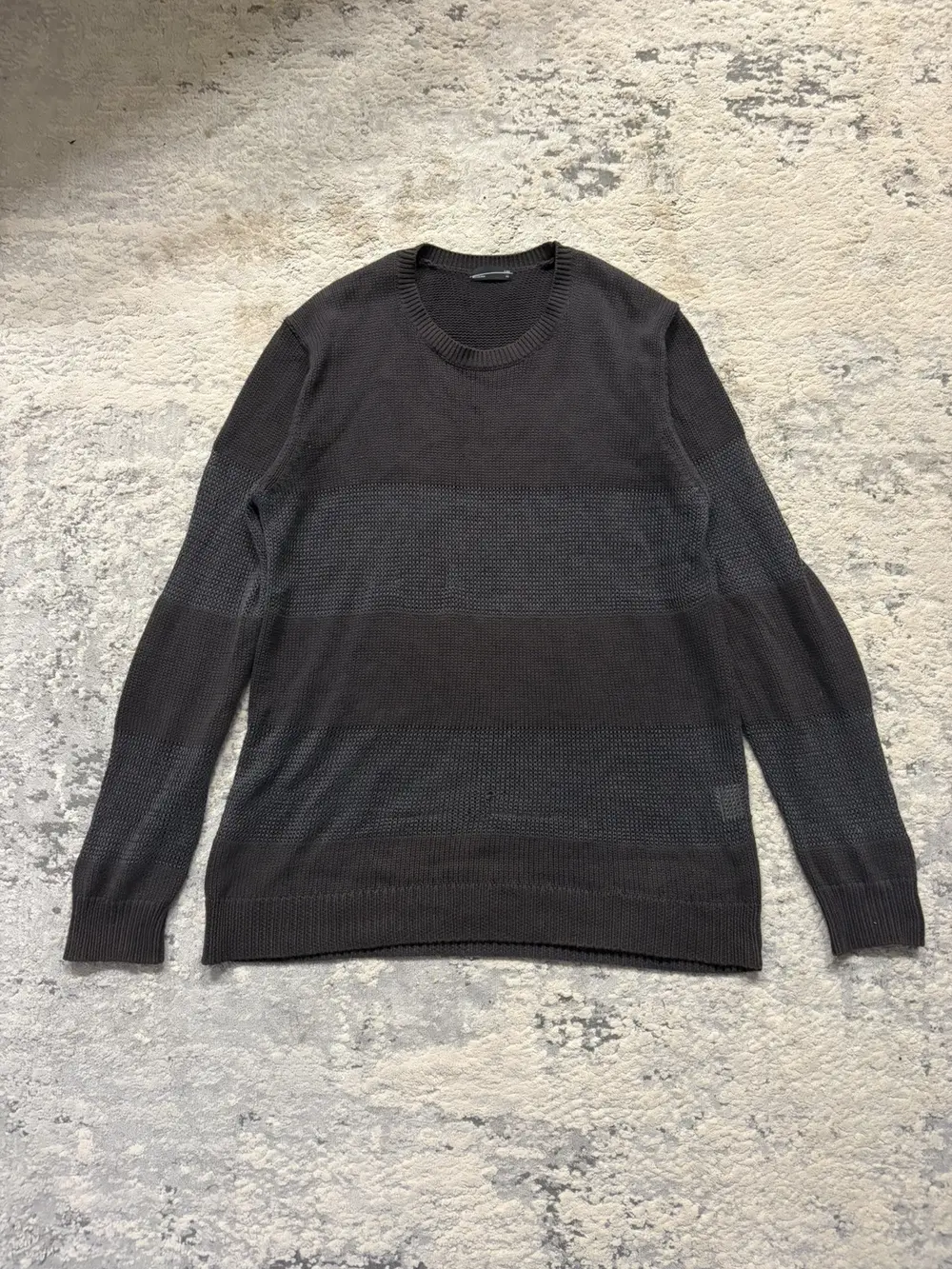 From Japanese label Lad Musician, this sweater is constructed of a stretchy gauze-like 70/30 cotton/hemp blend that is ever so slightly see through. Subtle black and gray stripes of alternating knit sections.