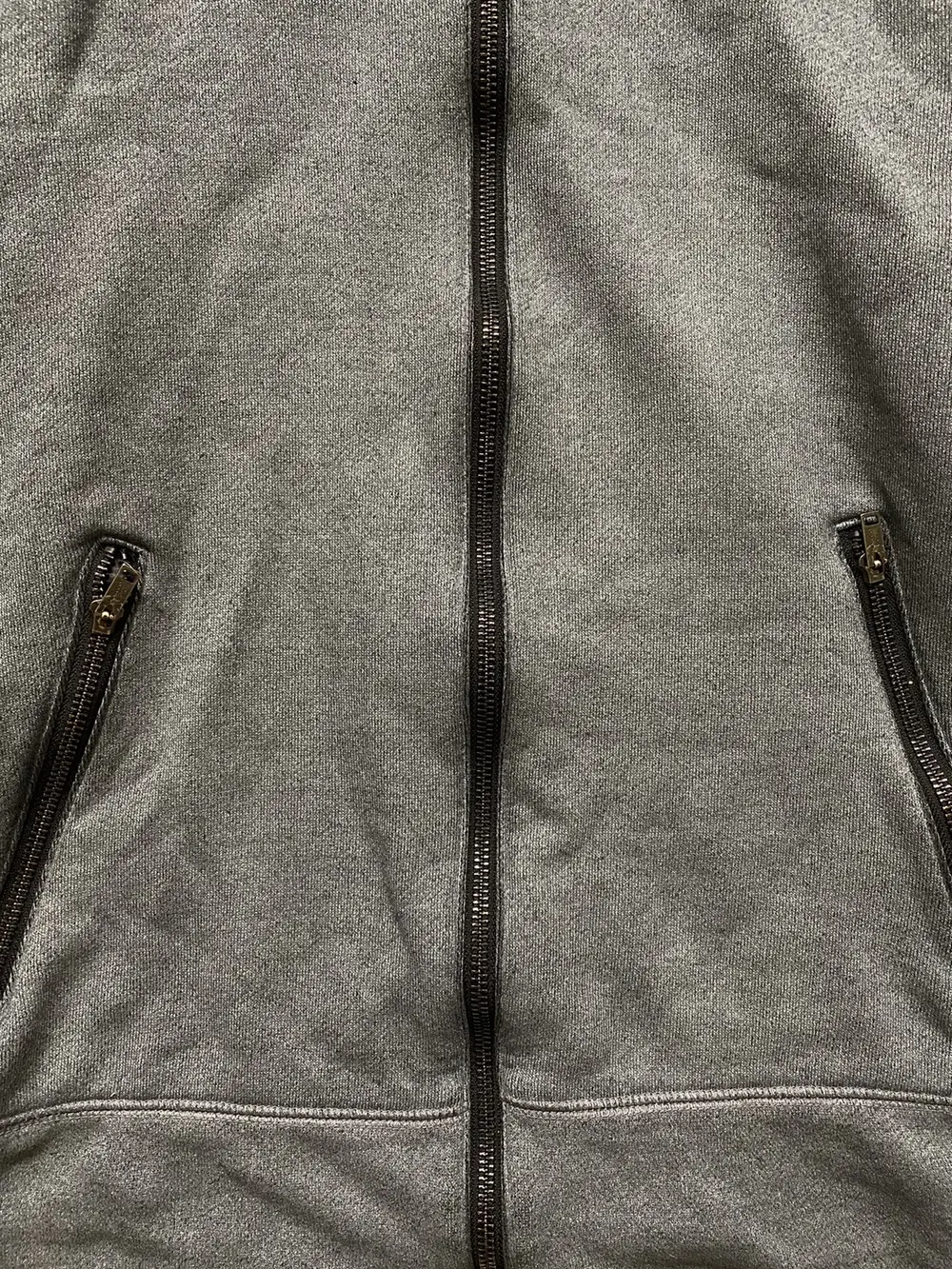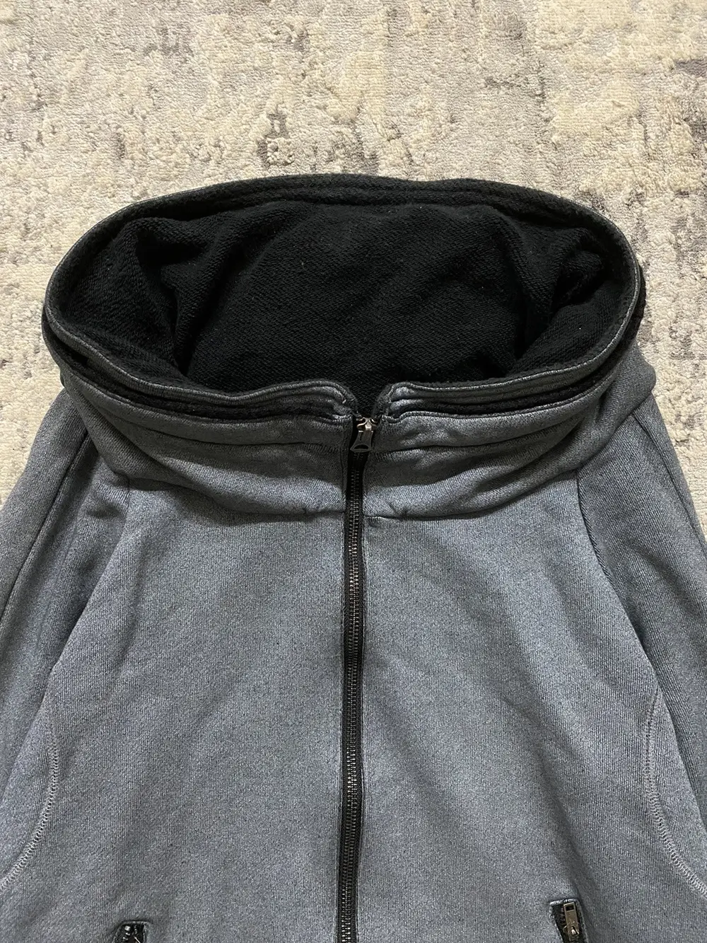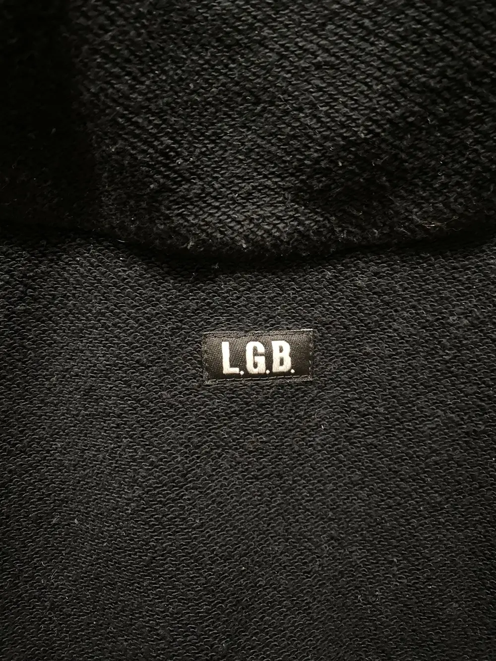 From the Japanese label Le Grand Bleu or L.G.B., this hoodie features a “Bono” hood that comes up to neck level with a traditional hood enclosed by zipper. The material is 100% cotton with an almost shiny metallic grey finish that gives a space-suit vibe. Double zippers down the middle as well as 2 front zipper pockets. LGB branded tags including a vertical LGB pull tag on the front and signature LGB boxing logo on the back. Rare size 2 fits a M up to a slim L.