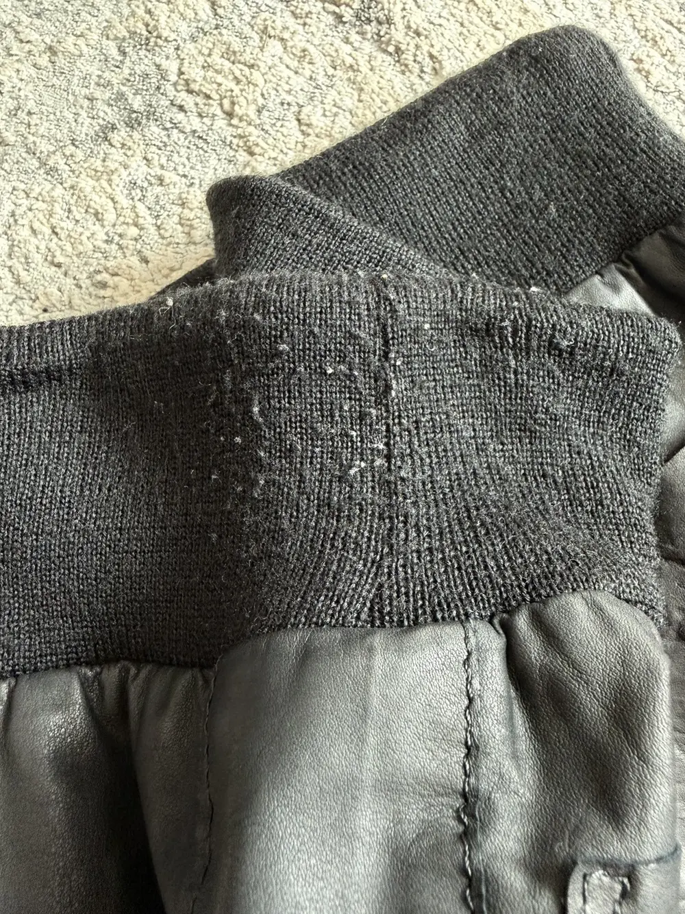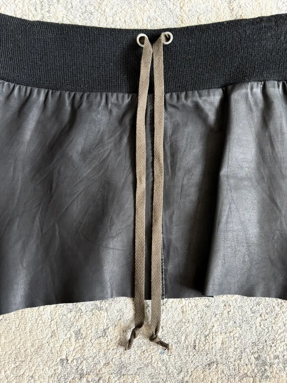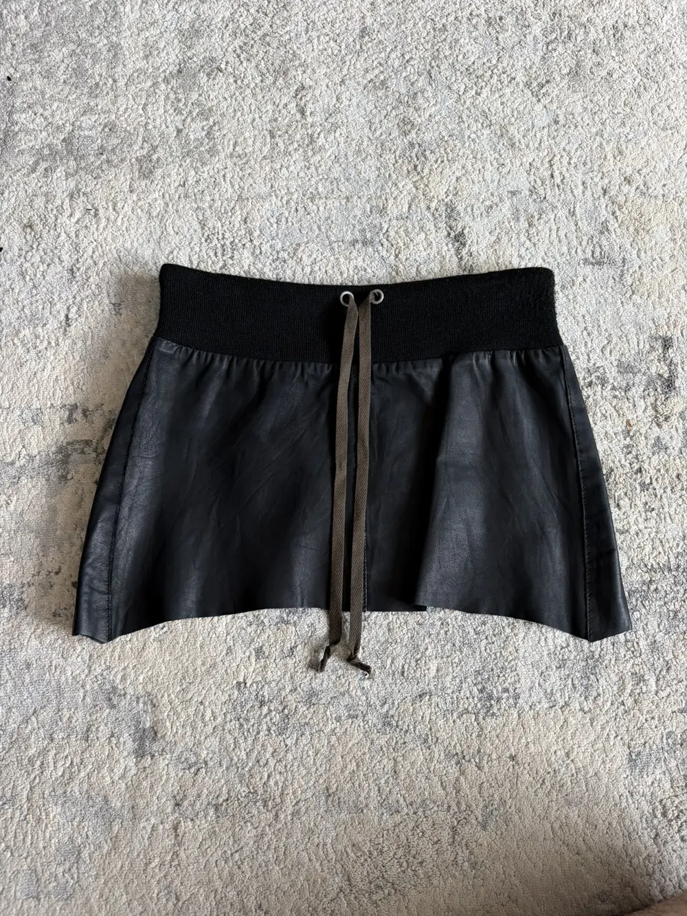 LGB micro mini skirt featuring a thick ribbed, boxing‑style waistband with elongated brown drawstrings for that signature utilitarian edge. The skirt itself is crafted from black leather with a sleek soft feel and 2 back pockets.
