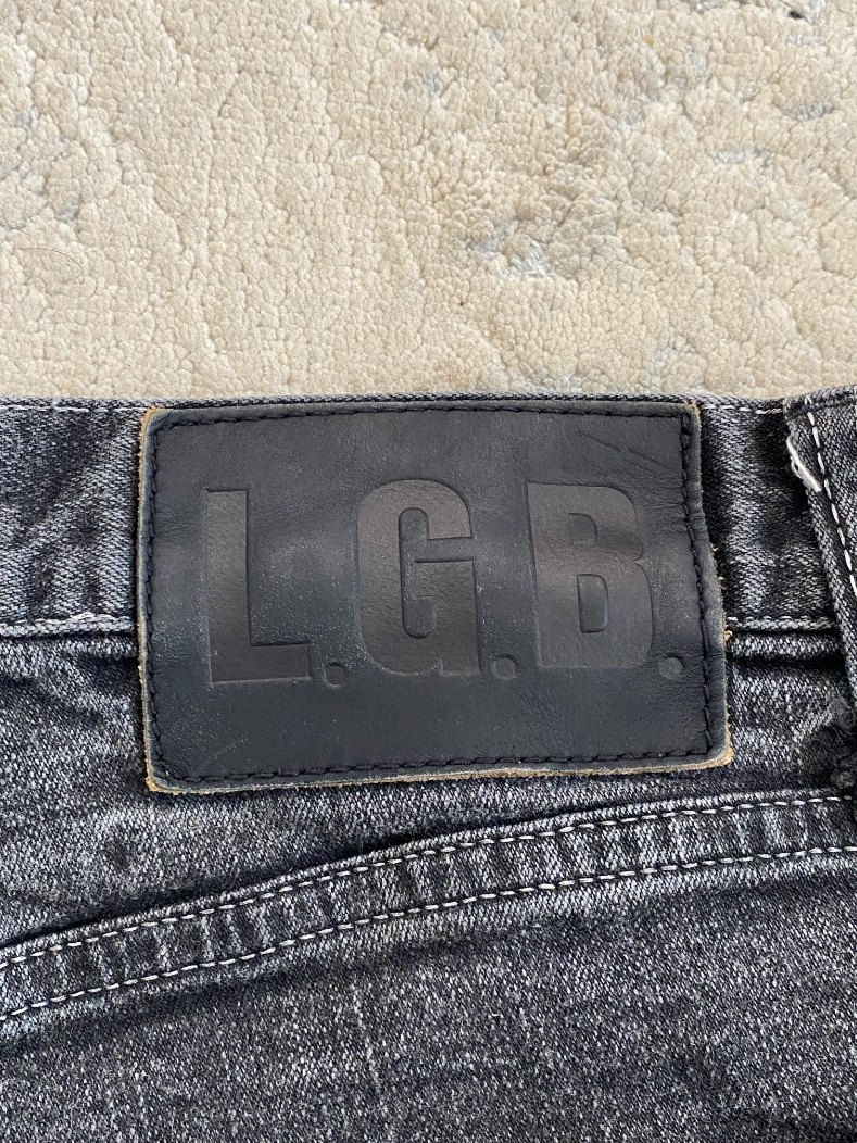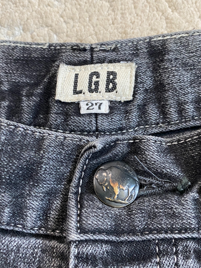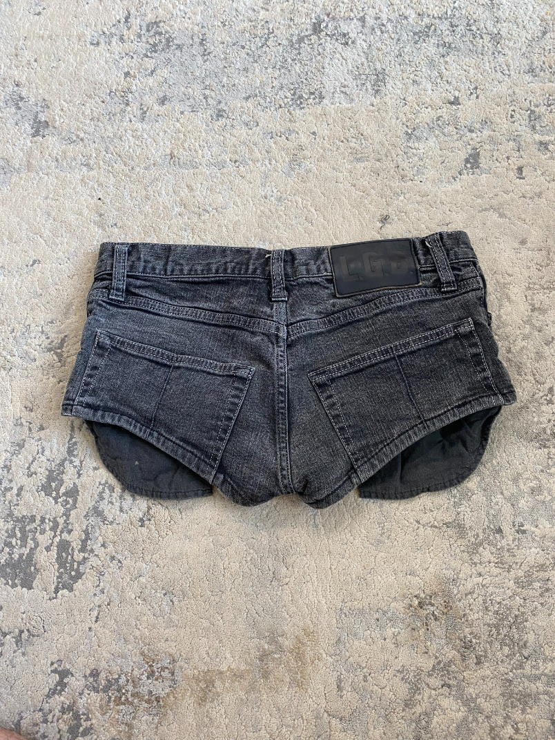 Low-rise shorts in heavily washed black denim with exposed pocket bags for an intentional unfinished look. Features a custom-engraved button closure and signature LGB leather back tag.