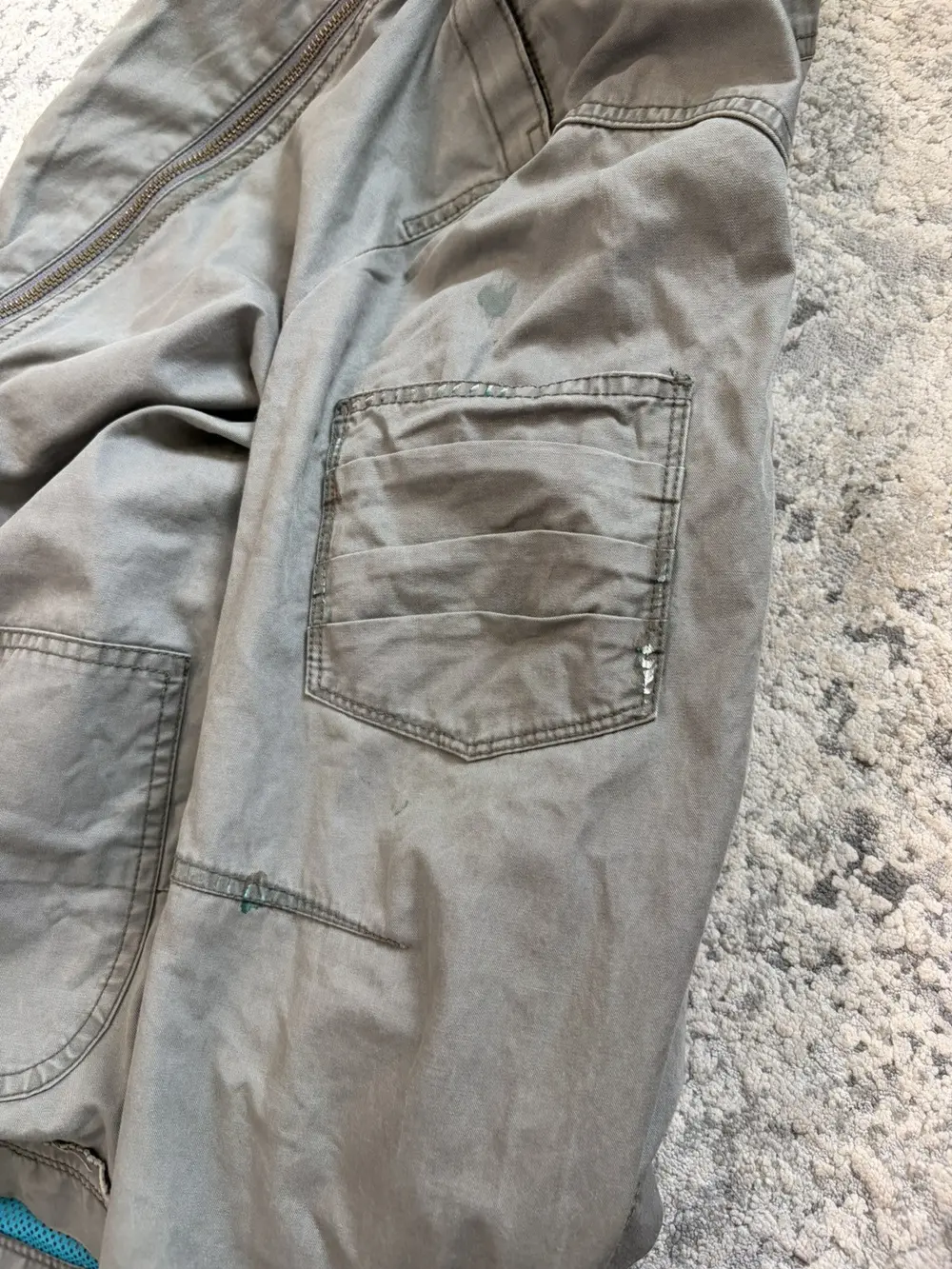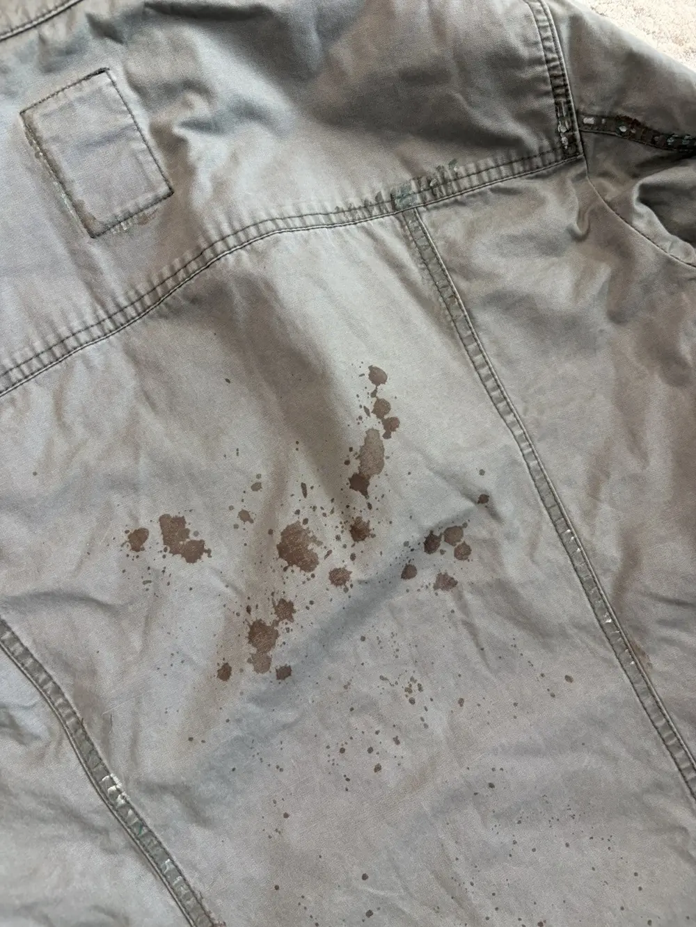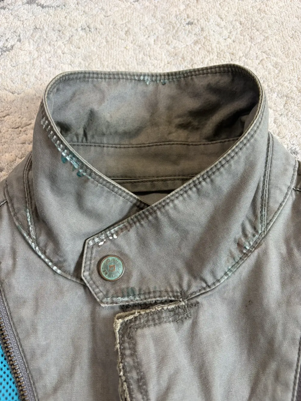Jacket from MFG featuring multiple zippers on the front revealing a blue mesh backing littered with hidden pockets and tool holders. Snap button + zipper closure on the front with additional hidden zipper pockets. Paint splatter on back as well as various sections with paint/oil stains giving the jacket a worn in authentic work wear feel.