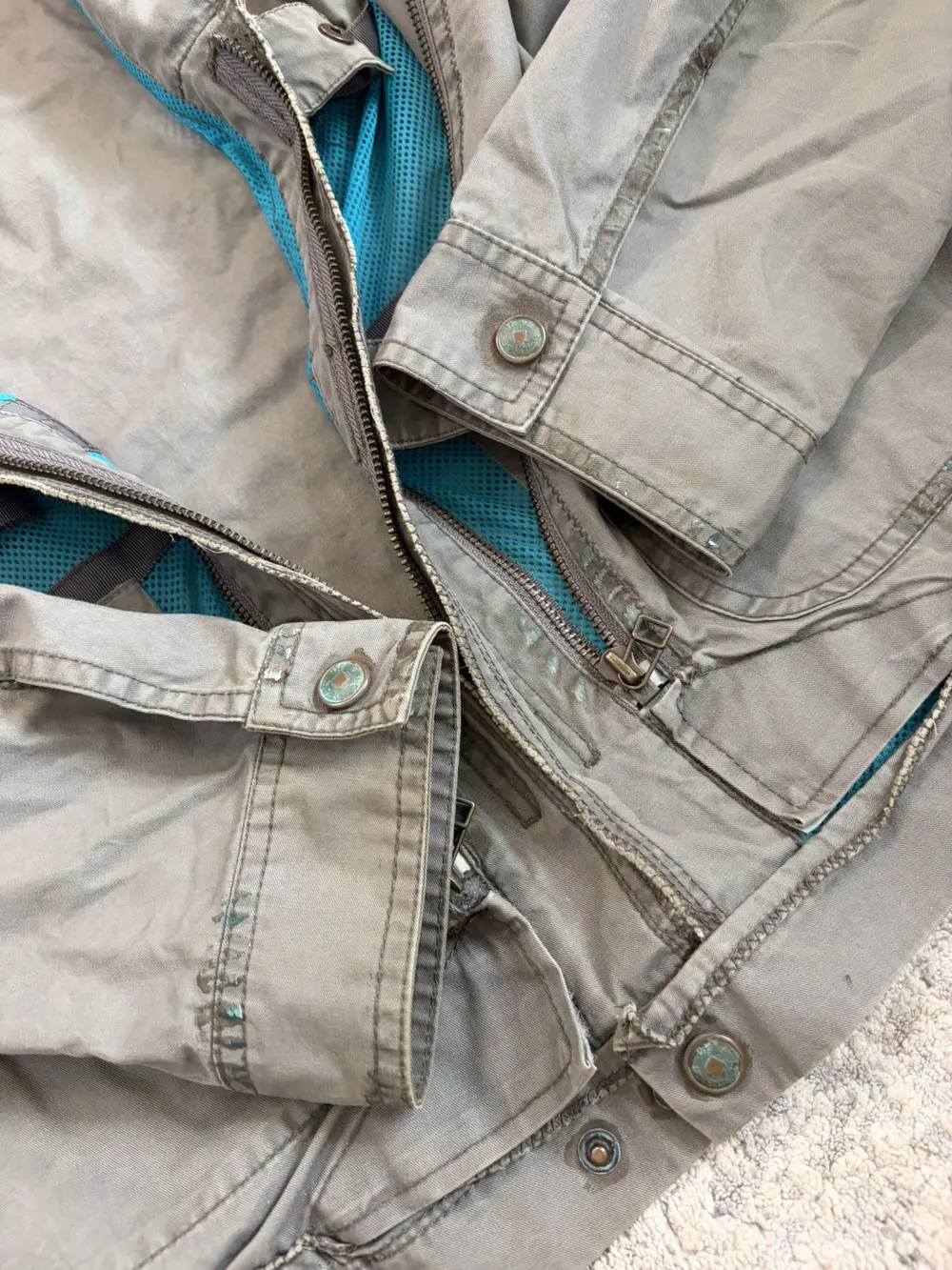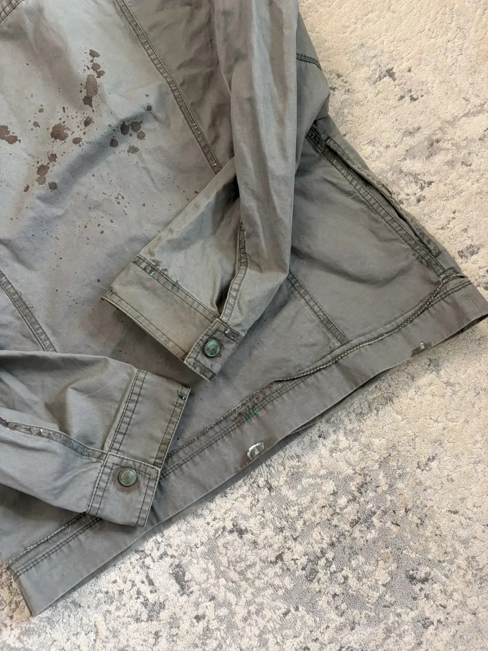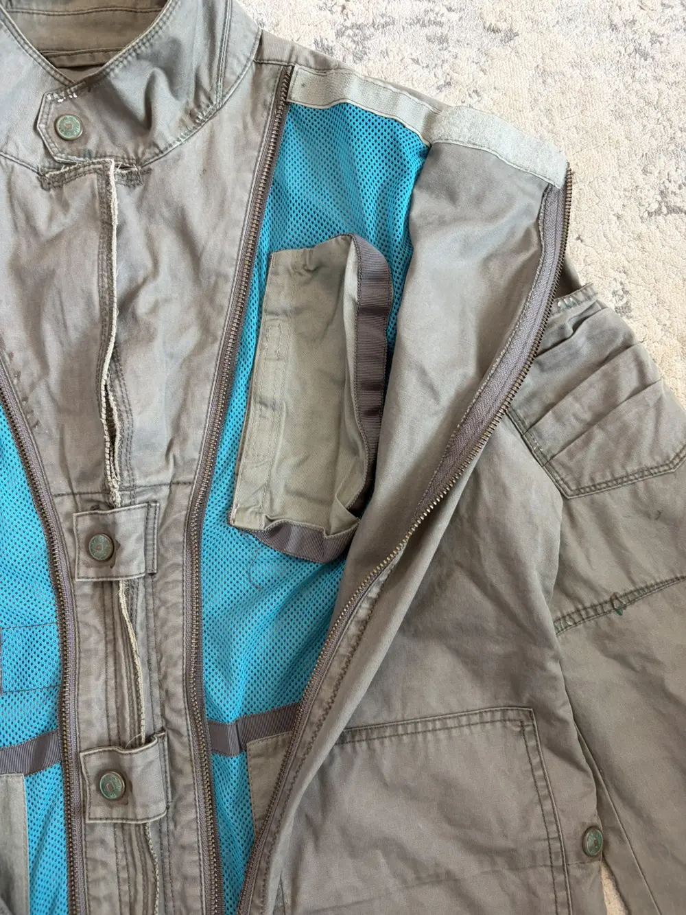 Jacket from MFG featuring multiple zippers on the front revealing a blue mesh backing littered with hidden pockets and tool holders. Snap button + zipper closure on the front with additional hidden zipper pockets. Paint splatter on back as well as various sections with paint/oil stains giving the jacket a worn in authentic work wear feel.