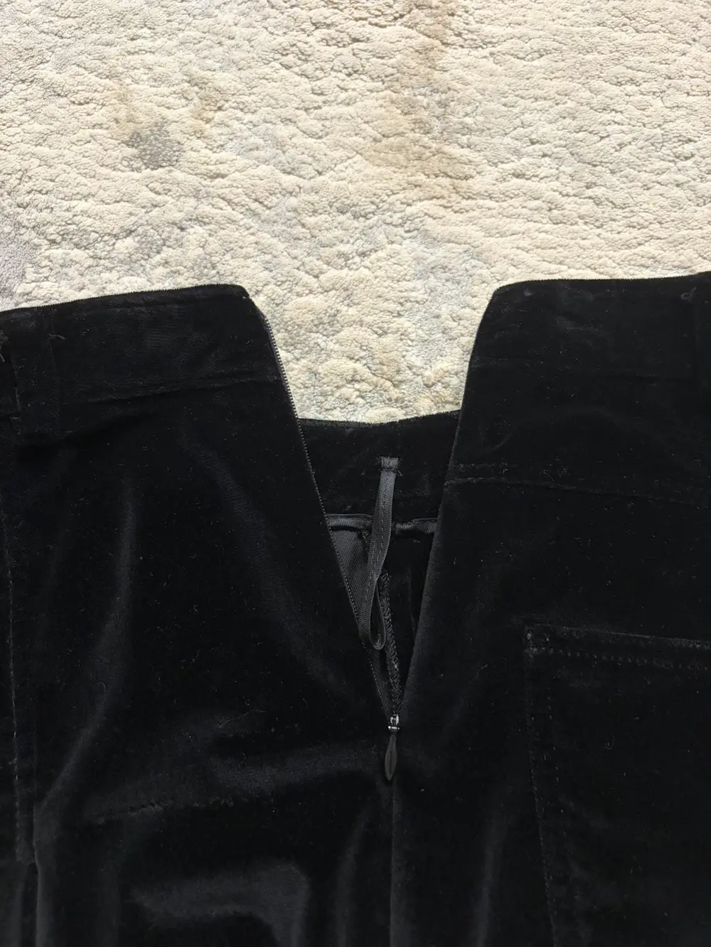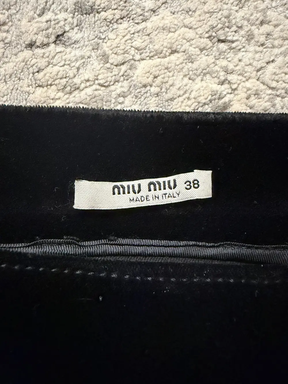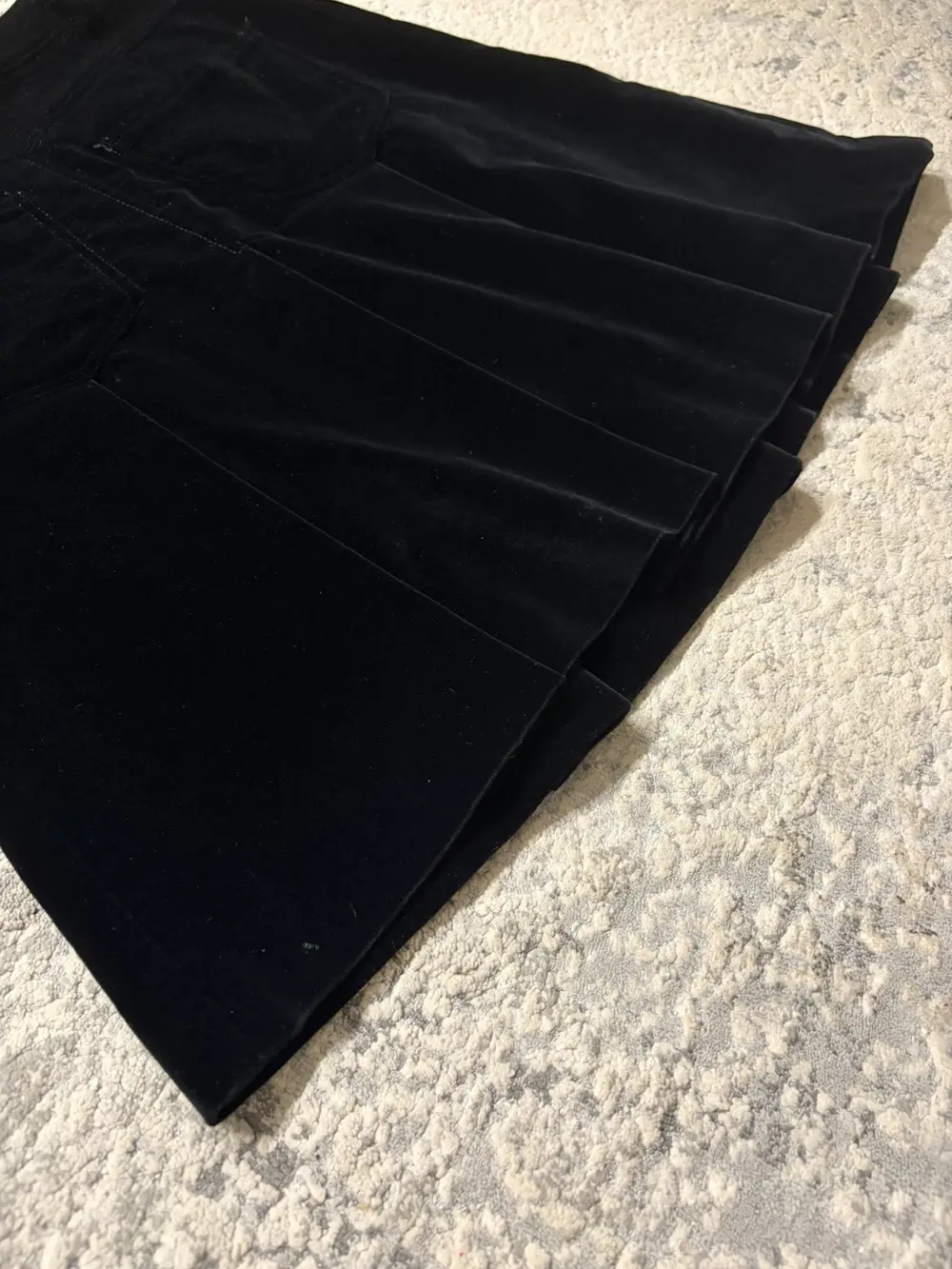 Miu Miu black velvet skirt with full all‑around pleating, giving it a structured but soft drape. Features a clean side‑zip closure and two back pockets