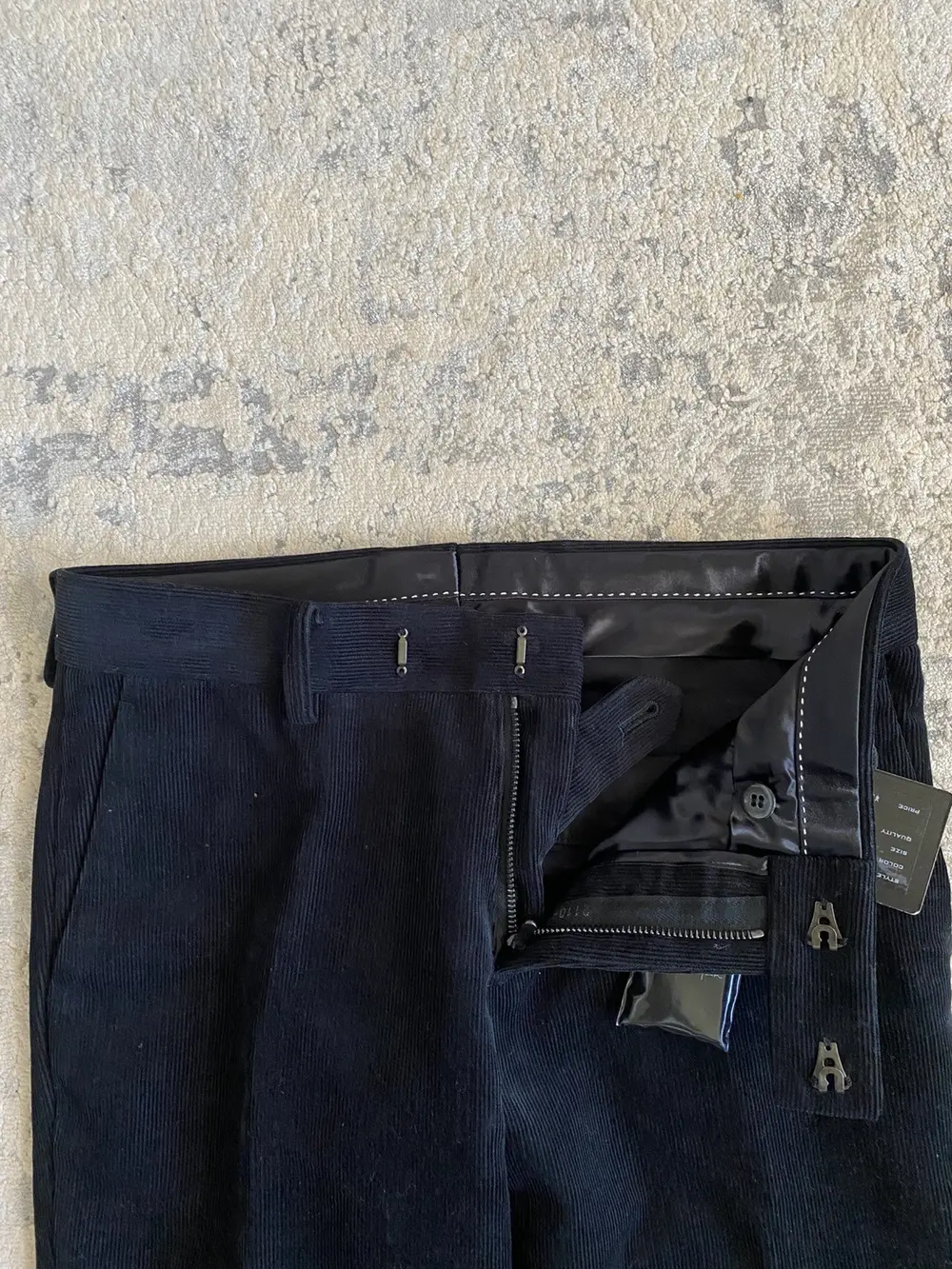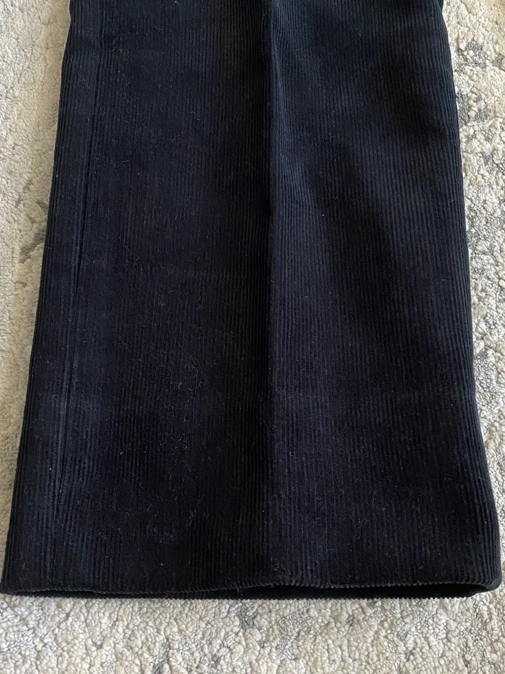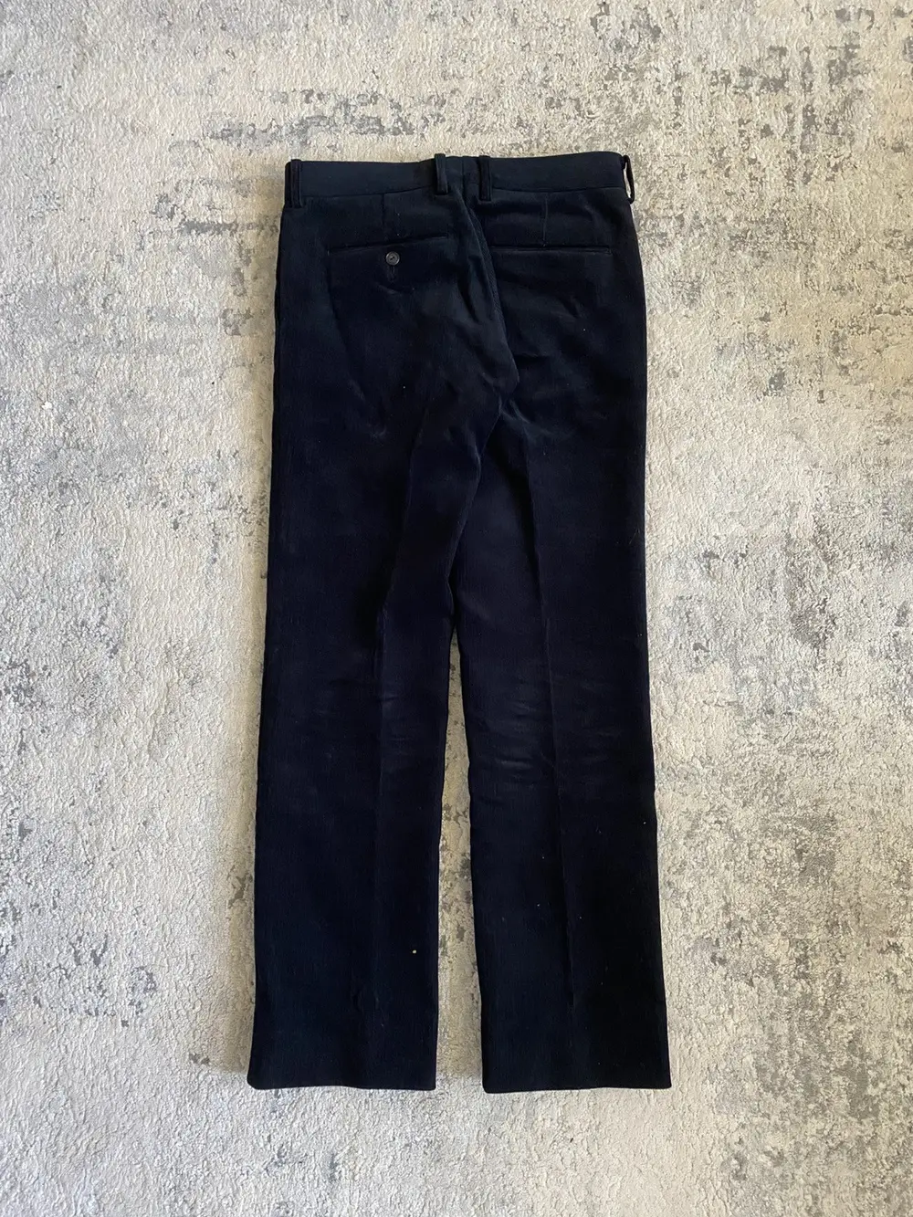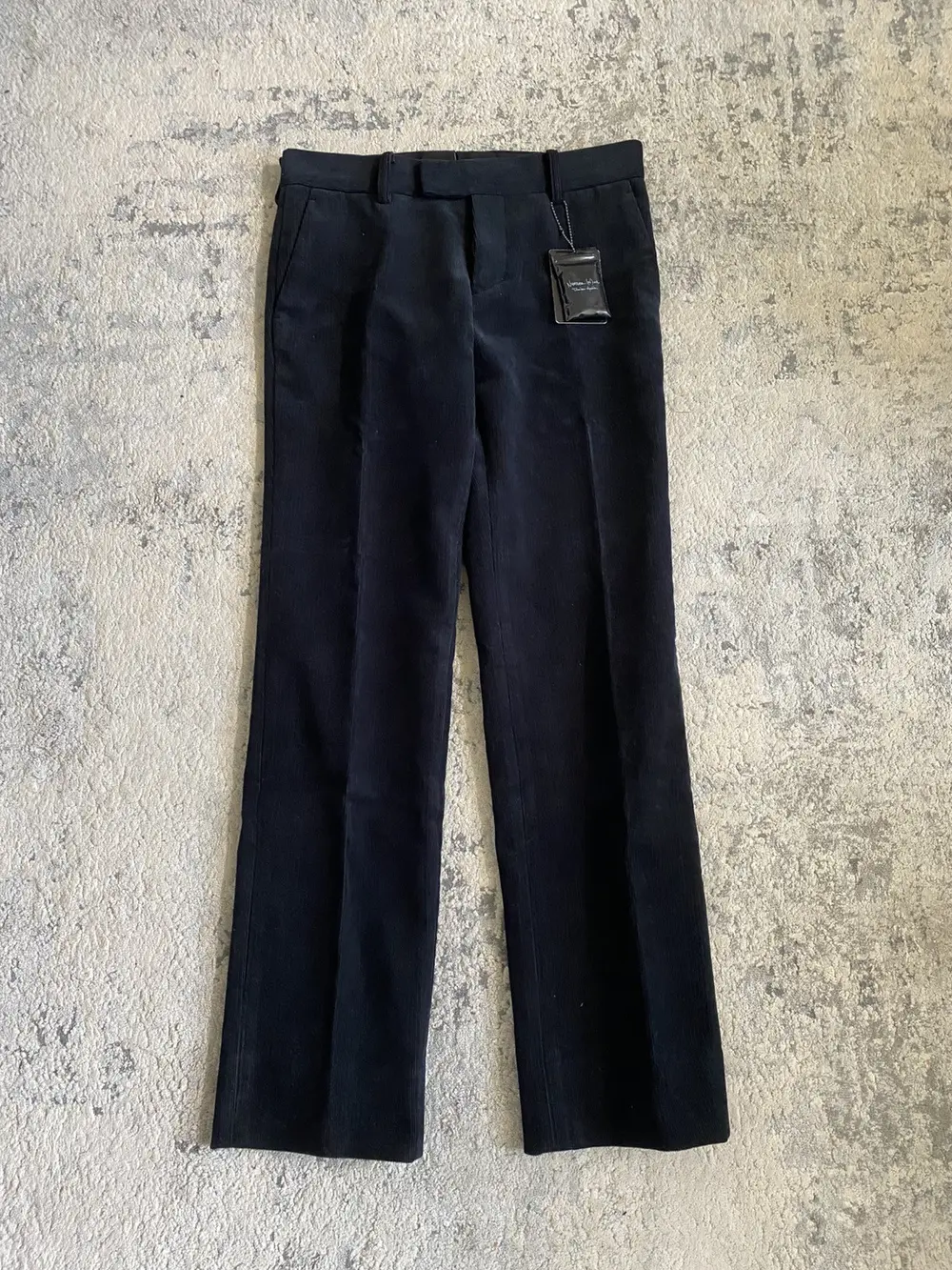 From the Autumn-Winter 2004 Collection titled “Give Peace A Chance” these tailored trousers are constructed of a black corduroy, blending timeless design with versatile craftsmanship. Pleats down the middle of either leg and a multi clasp fastening system. Comes with original retail tags and extra fabric and button for potential repairs.
