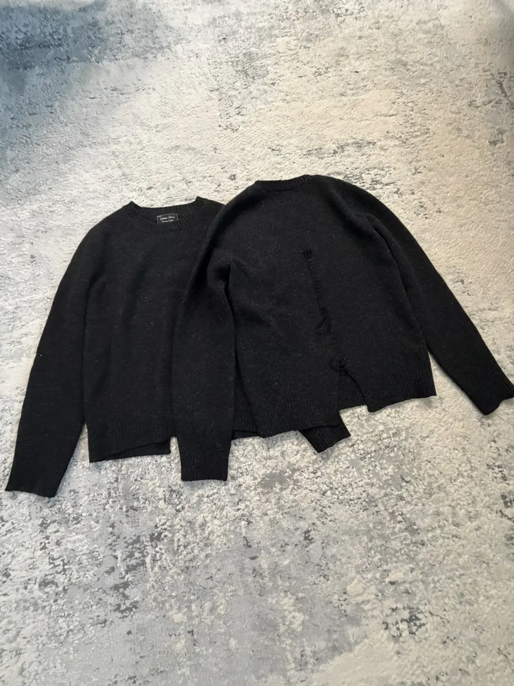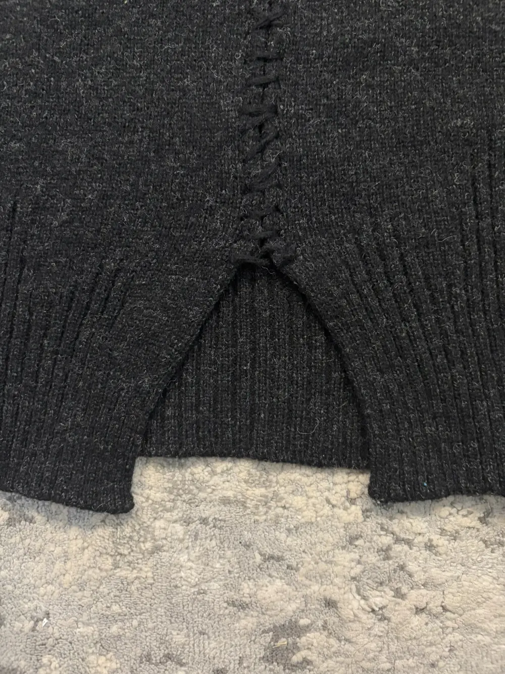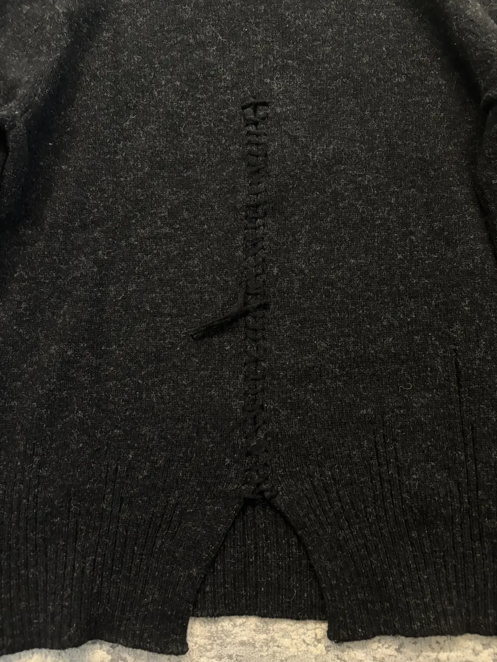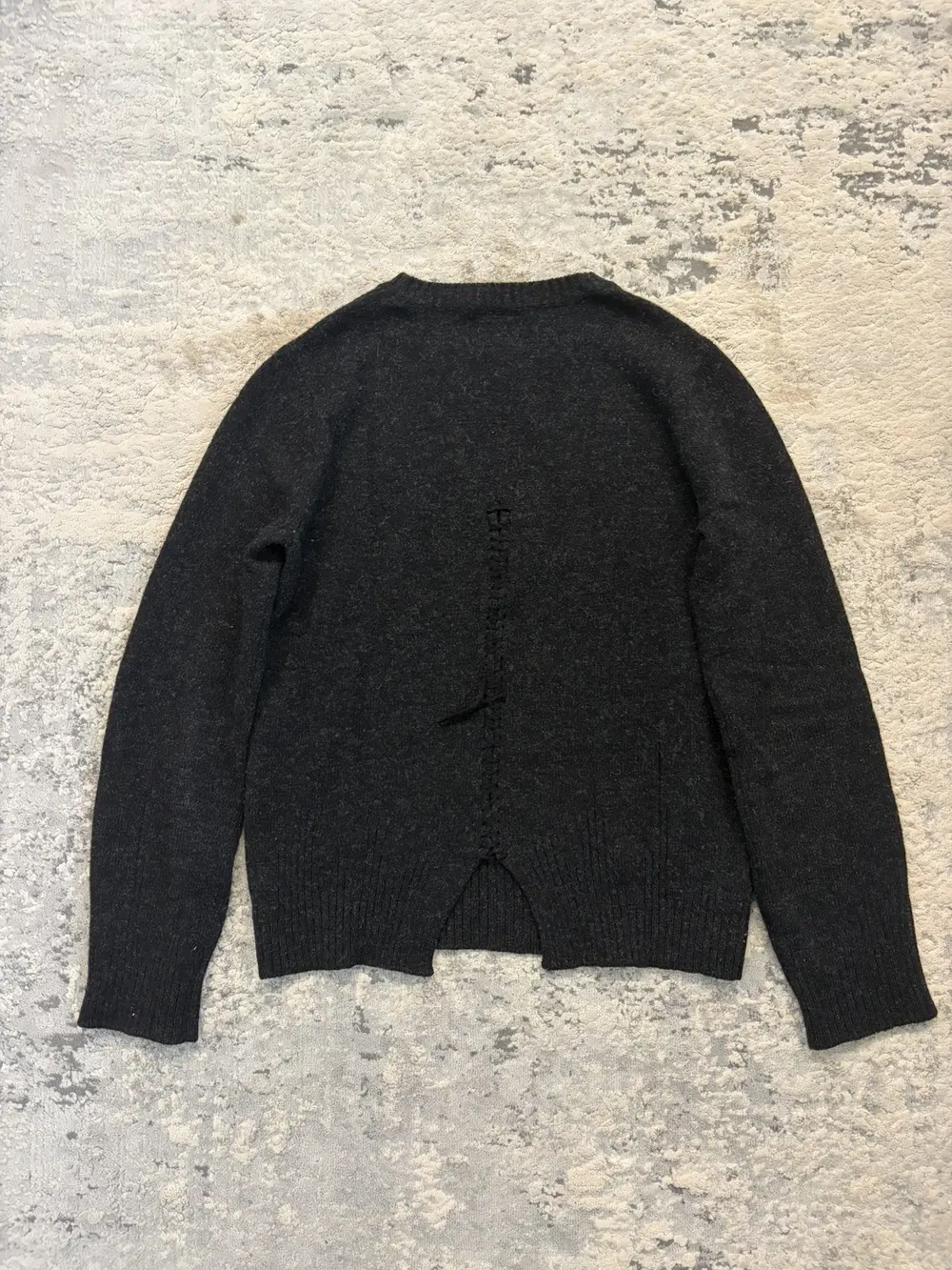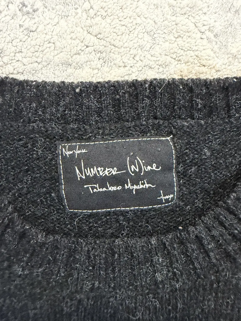 Number (N)ine FW06 wool sweater in black, cut with the collection’s signature deconstructed detailing. The back hem is split and reconnected with a visible scar stitch, giving the piece that raw, hand‑finished look Takahiro Miyashita favored during this era.