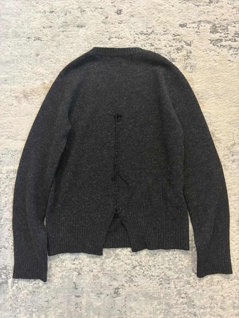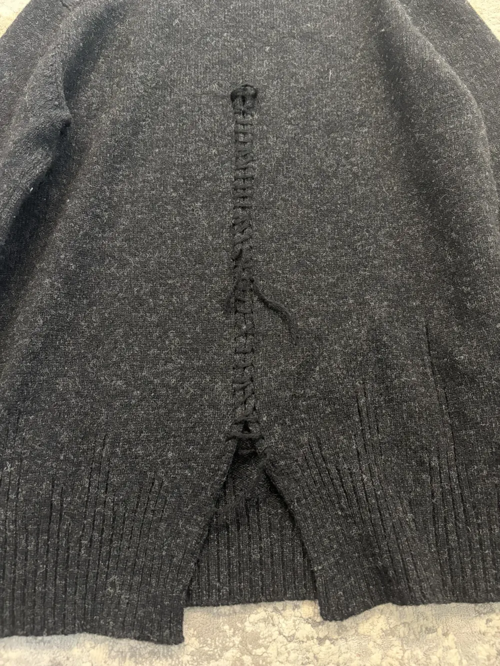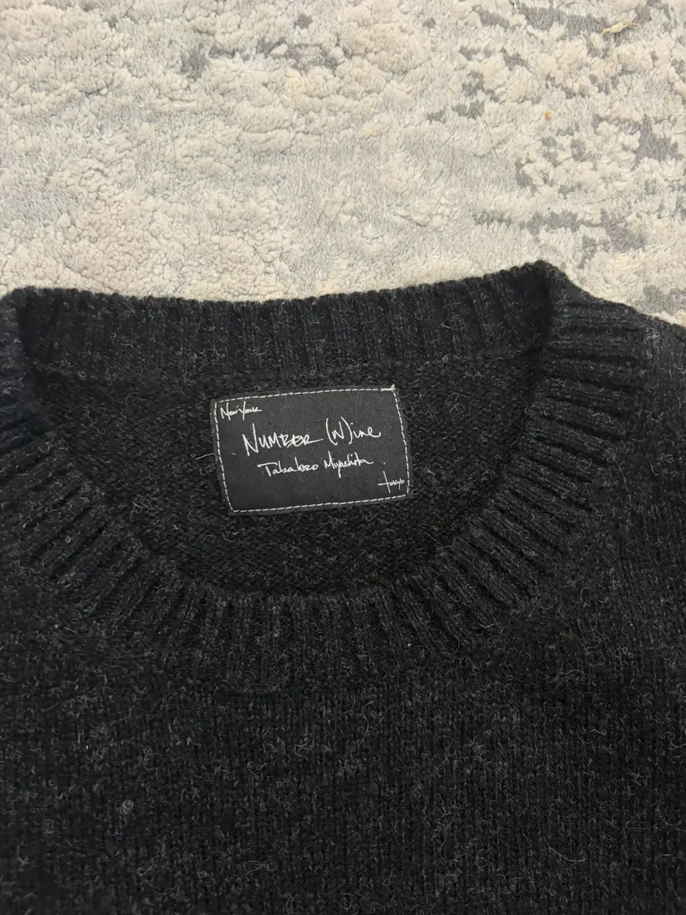 Number (N)ine FW06 wool sweater in black, cut with the collection’s signature deconstructed detailing. The back hem is split and reconnected with a visible scar stitch, giving the piece that raw, hand‑finished look Takahiro Miyashita favored during this era. Have 2 of these!