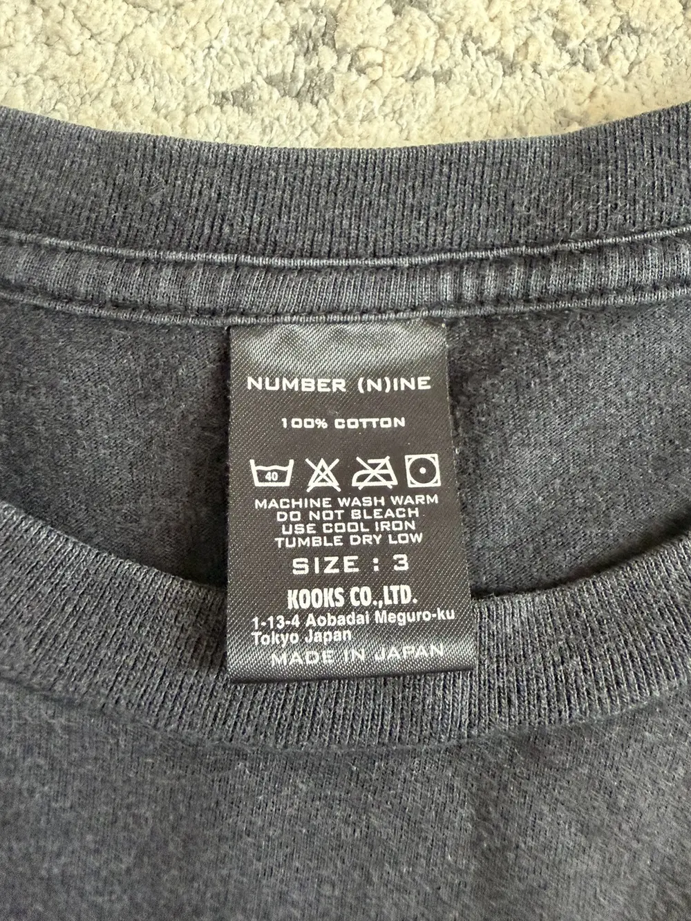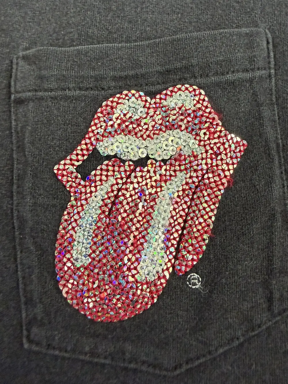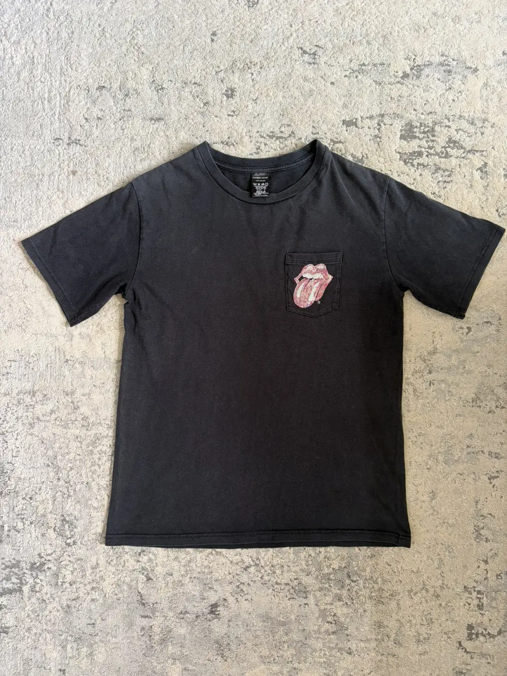 Number (N)ine has been known to draw inspiration from the music world combining fashion with rock and grunge, you could say they go hand and hand. Paying homage to The Rolling Stones’ iconic tongue out motif, this tee features a shiny sequin embellishment logo on a black 100% cotton pocket tee that has faded to perfection and is soft to the touch. From a later collection in Number (N)ine’s catalog, however the brand has used this motif in their earlier Autumn/Winter 2006 collection titled “Noir.”