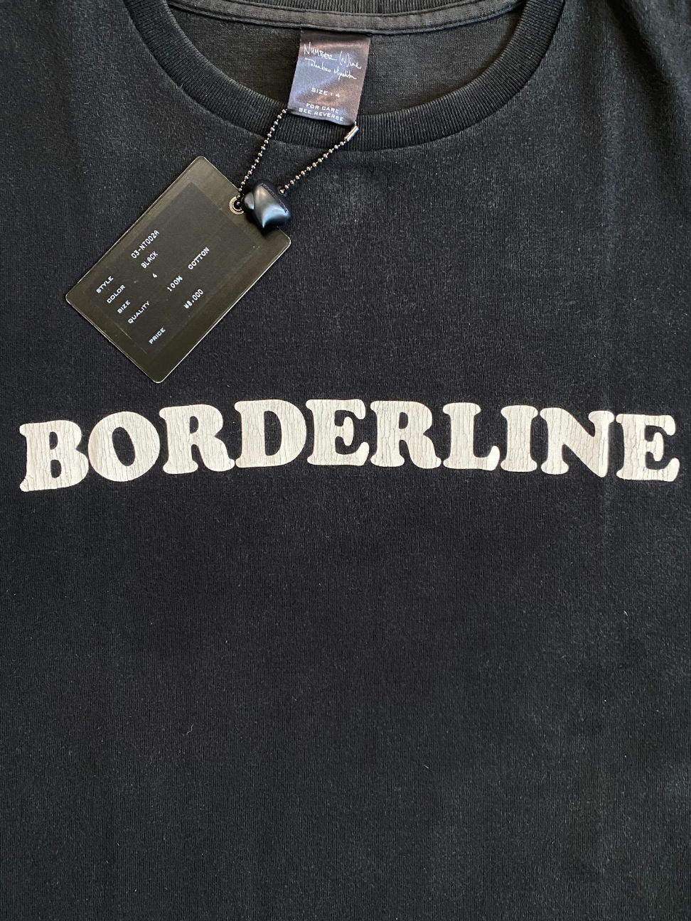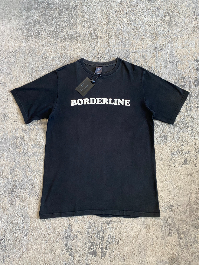 The tee features bubble-style “borderline” text printed at front. Washed black colorway with retail tags still attached. Rare size 4. Visible flaw: bottom hem partially undone