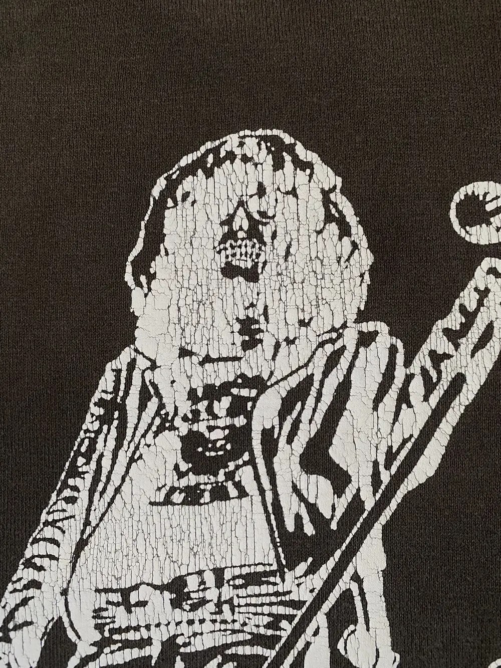 This tee pays homage to punk icon Joey Ramone in a cracked white print that visually echoes the ethos of wear and decay. Vintage brown cotton base shows deliberate distressing across the neckline, sleeves, and hem.