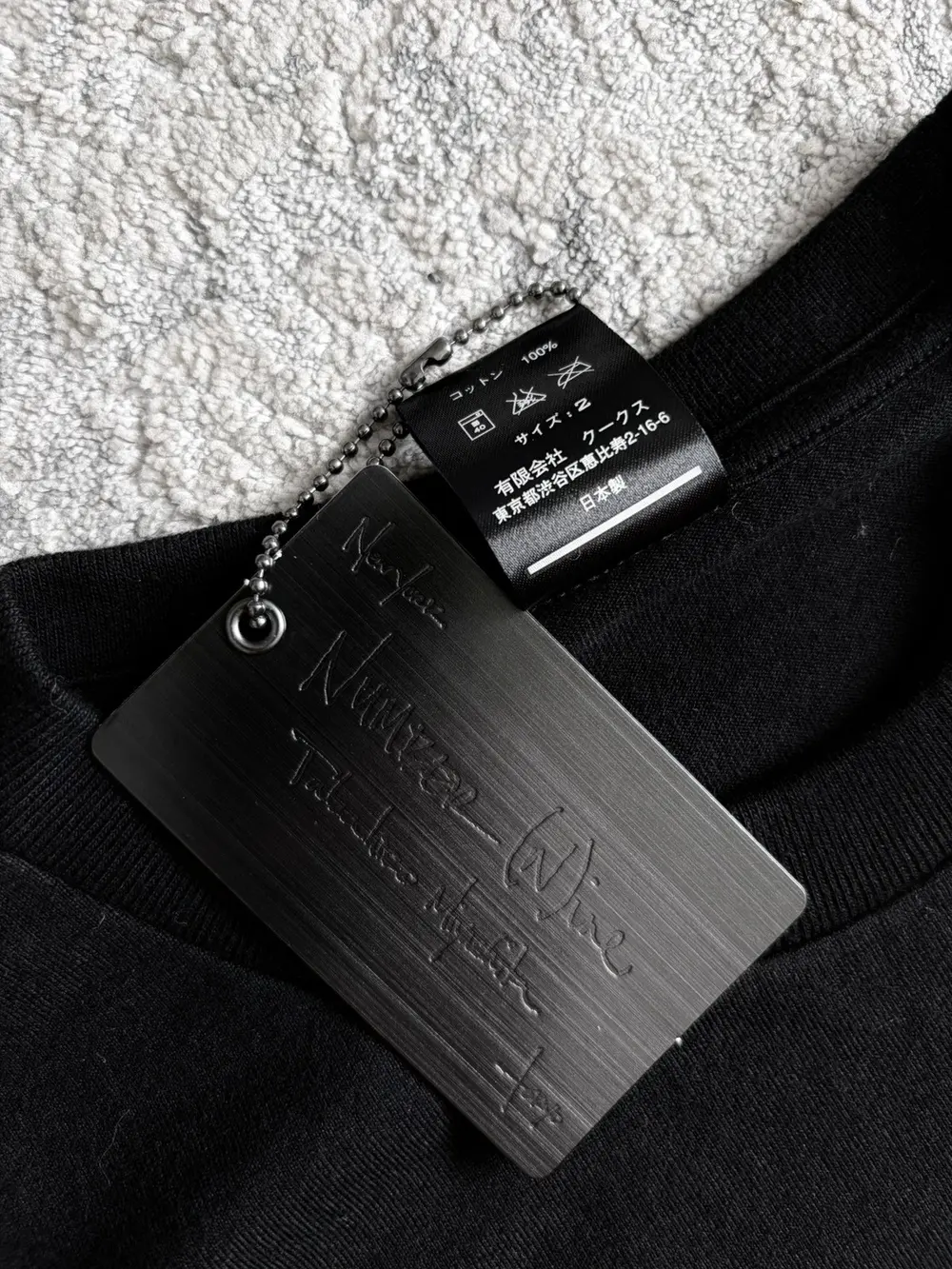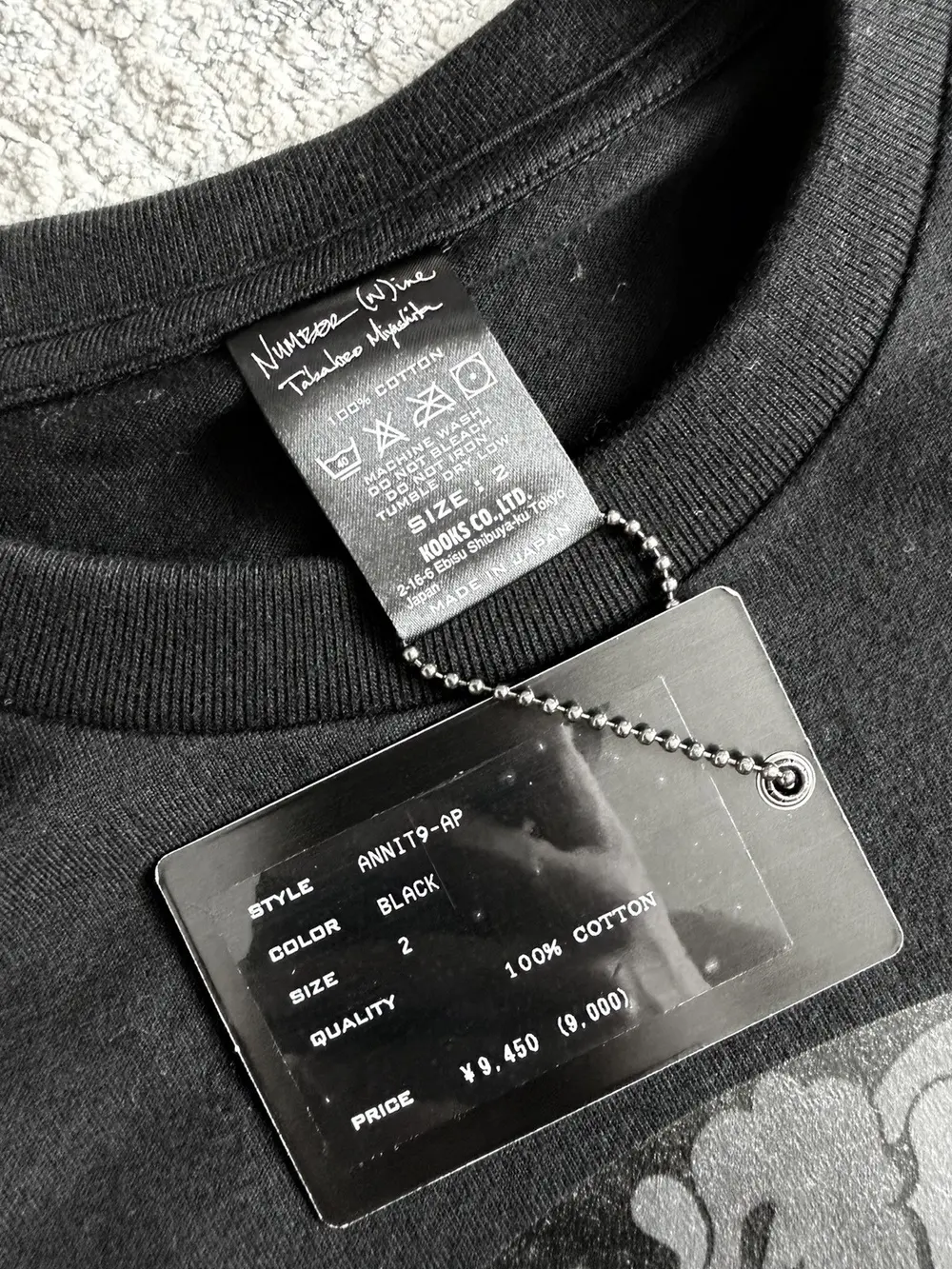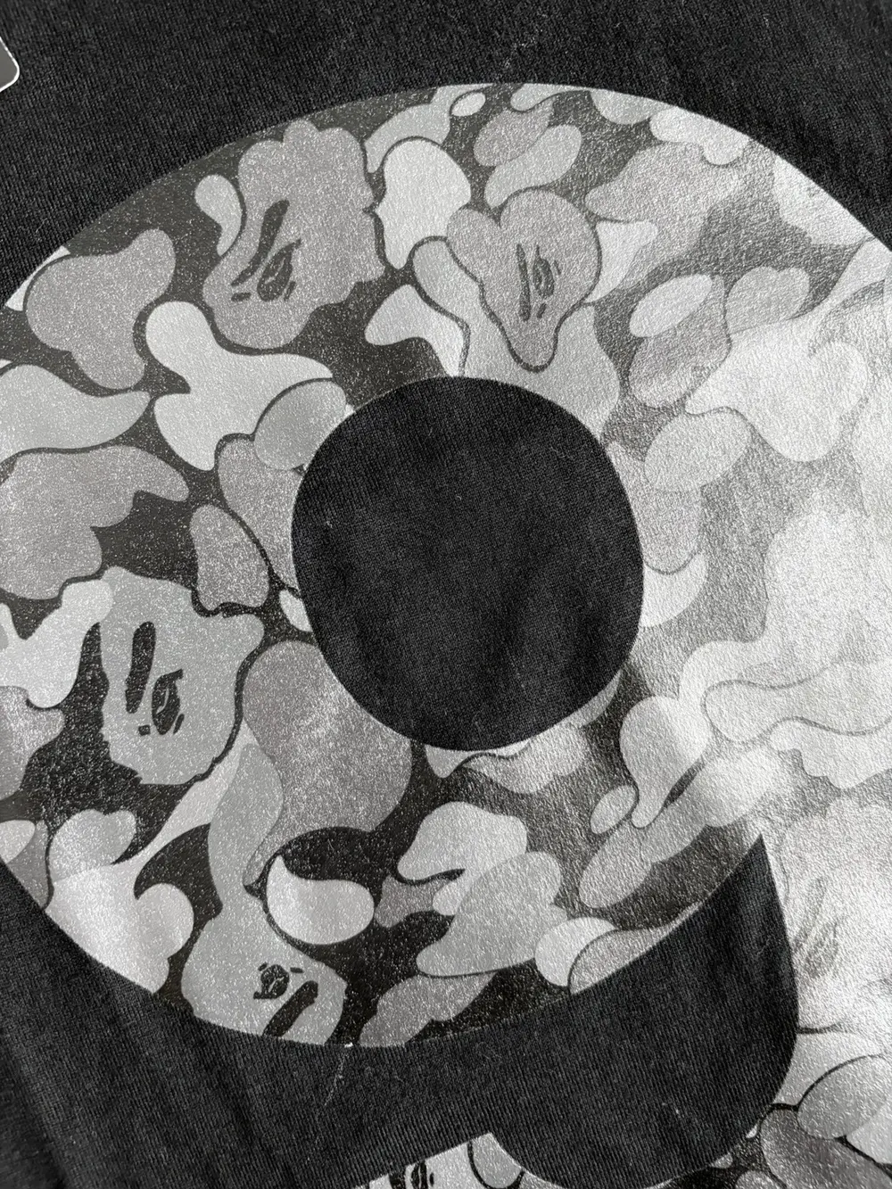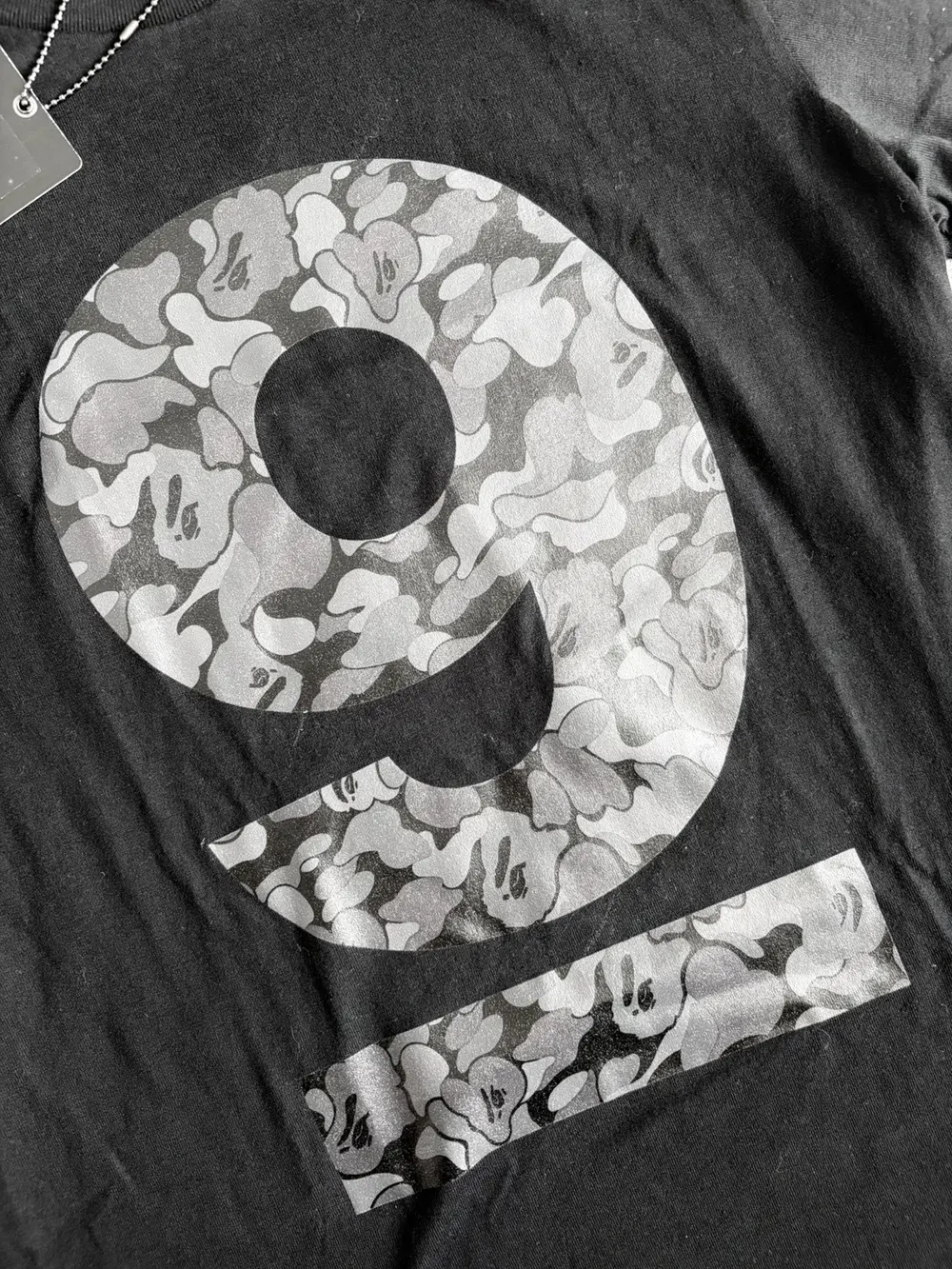 Collaboration tee celebrating Bape’s 9th anniversary, featuring the iconic “9” logo on the front filled with Bape’s signature camo motif. Classic cotton construction with clean proportions and crisp print quality typical of mid‑2000s Bape collabs. A rare crossover piece linking Takahiro Miyashita’s Number (N)ine with Nigo‑era Bape—highly collectible and increasingly hard to find.