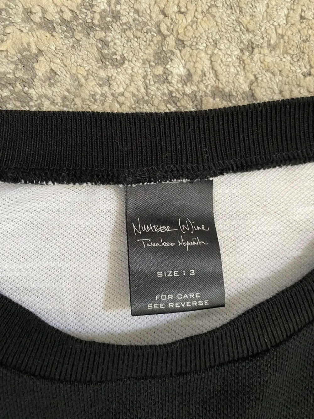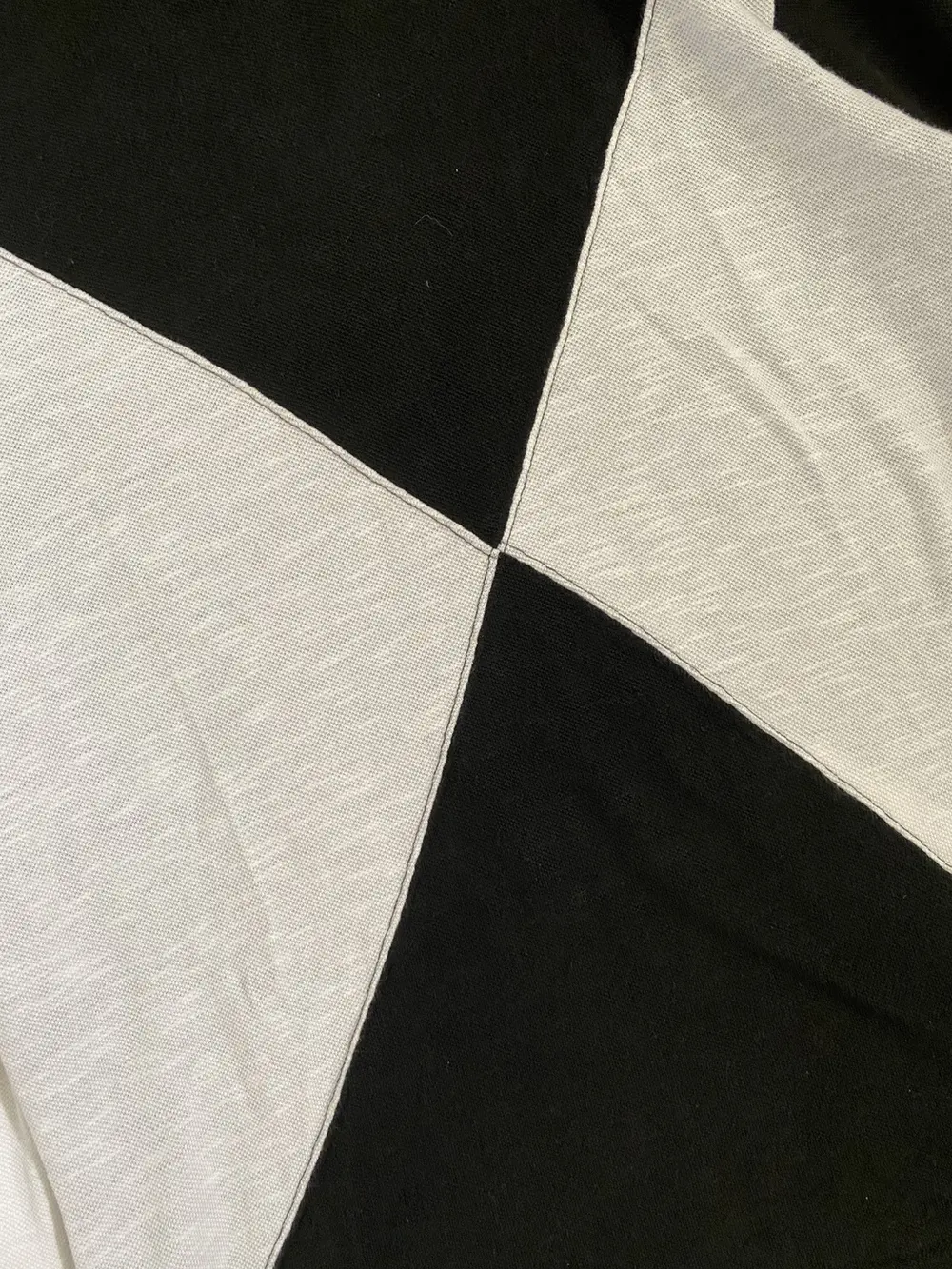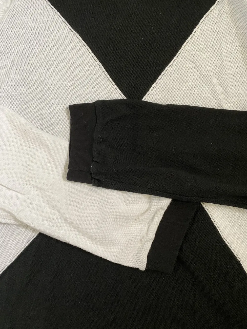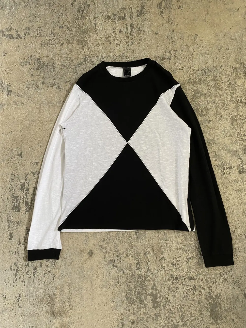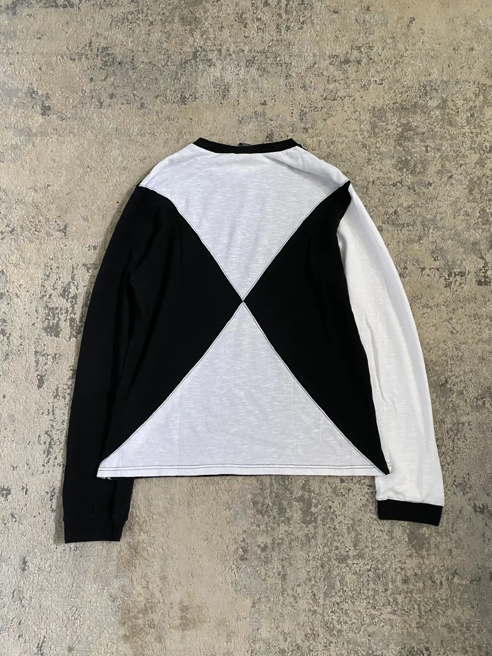 Lightweight knit long sleeve featuring intersecting black and white panels in a bold X formation across the front. Reverse side mirrors the pattern with inverted colors. Soft, breathable texture with a graphic edge—classic Number (N)ine duality. Unique piece from Takahiro era N(N)